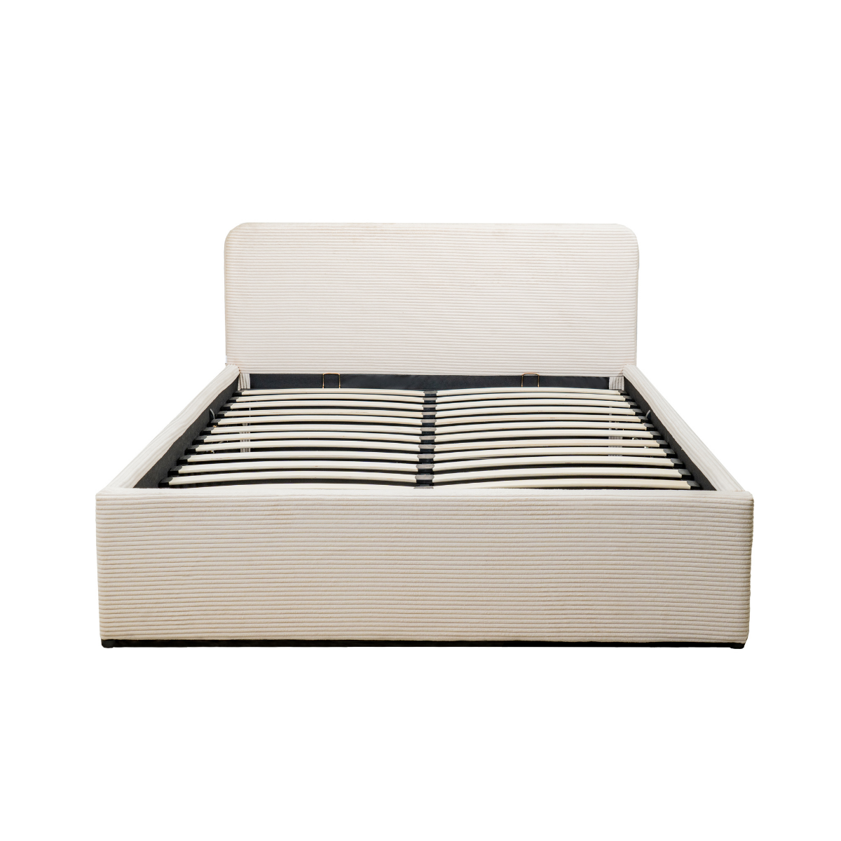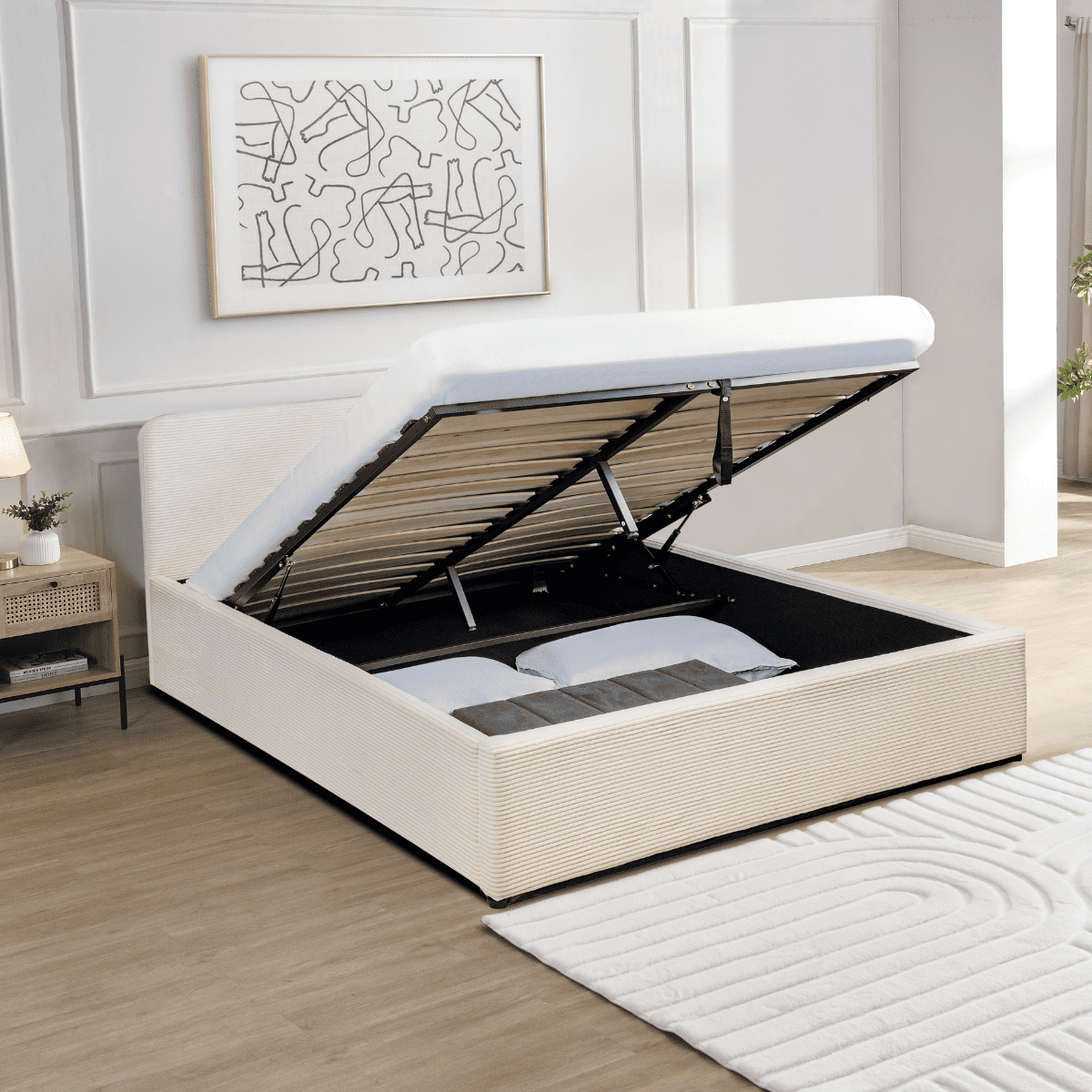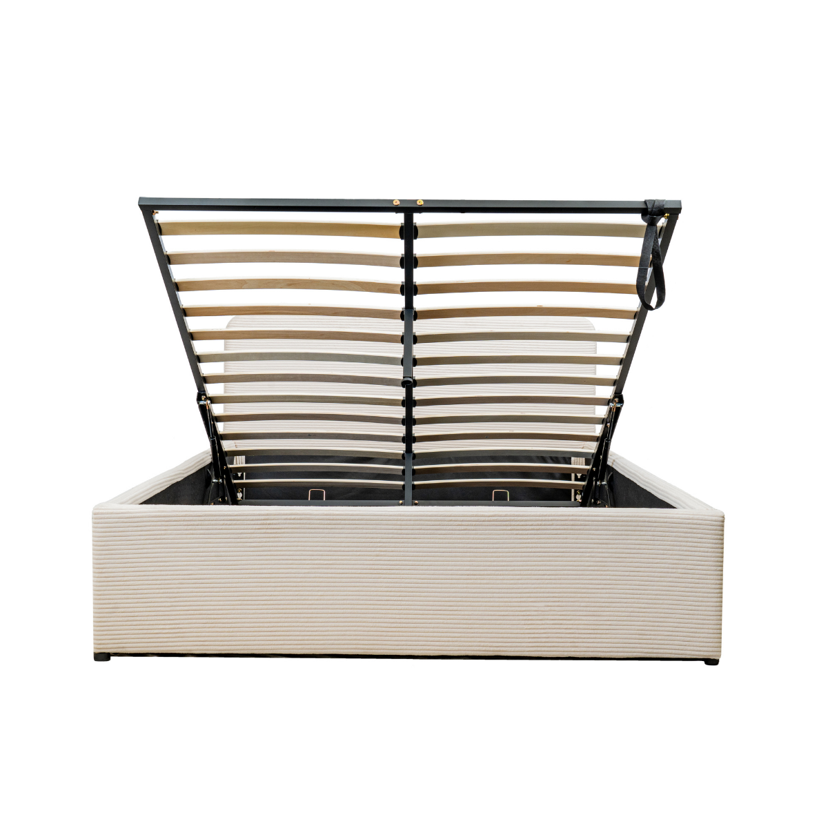 - De bedbodem kan dankzij gasveren worden opgetild en biedt toegang tot een grote opbergruimte.