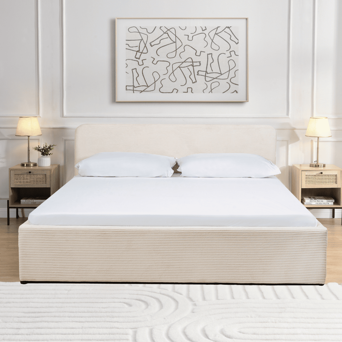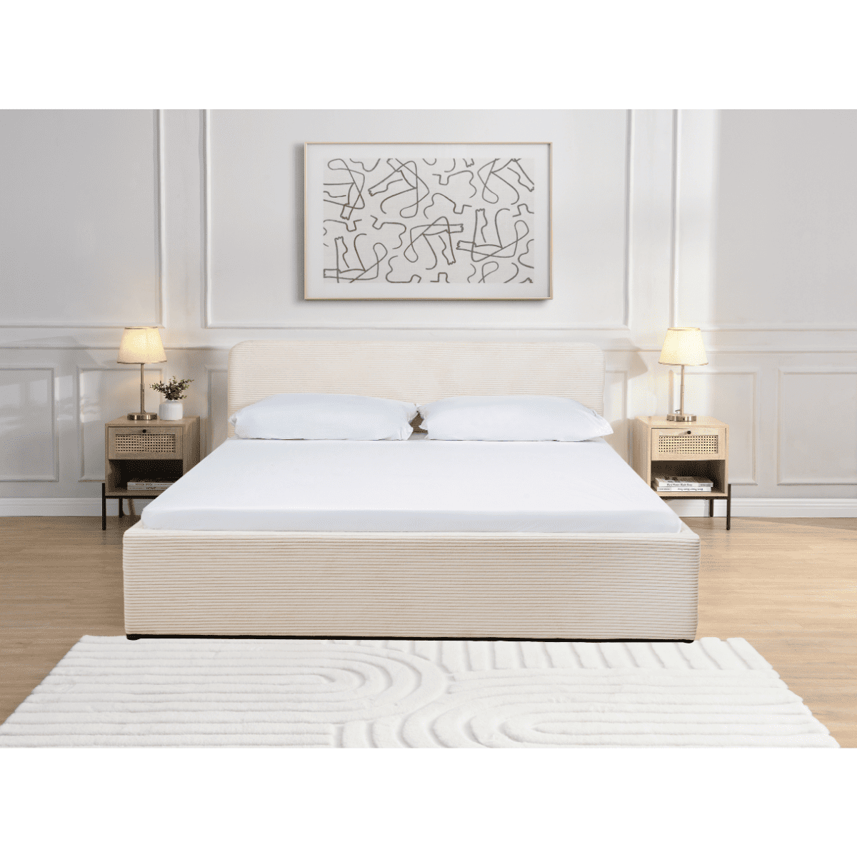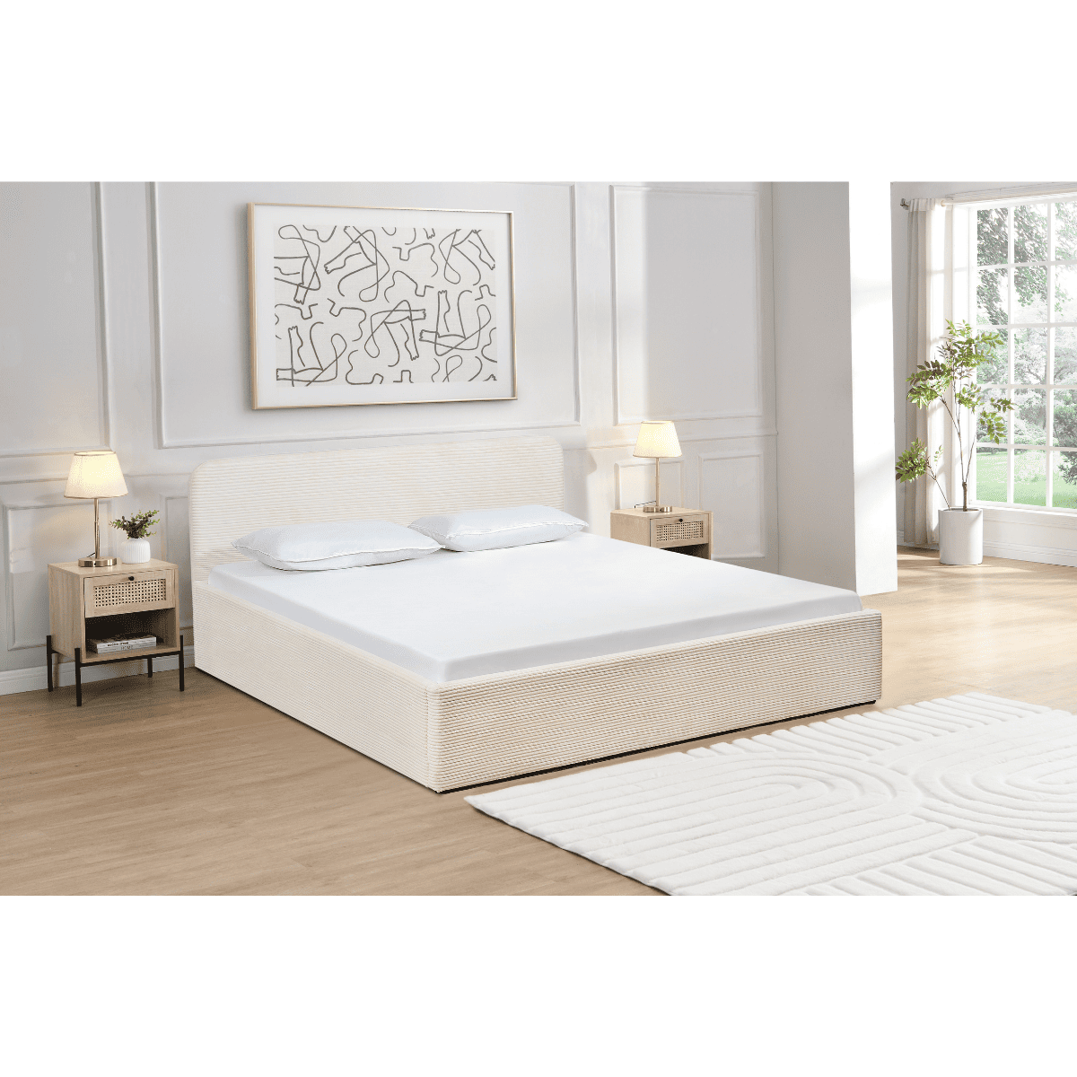 - De bedbodem kan dankzij gasveren worden opgetild en biedt toegang tot een grote opbergruimte.