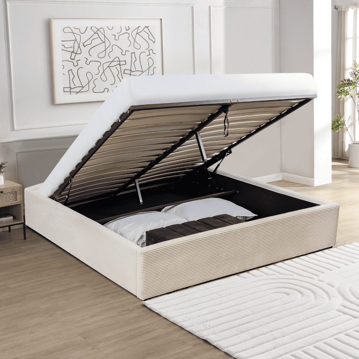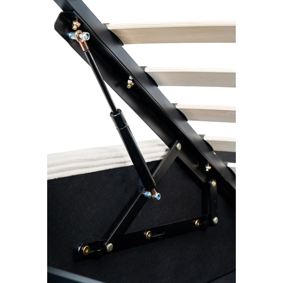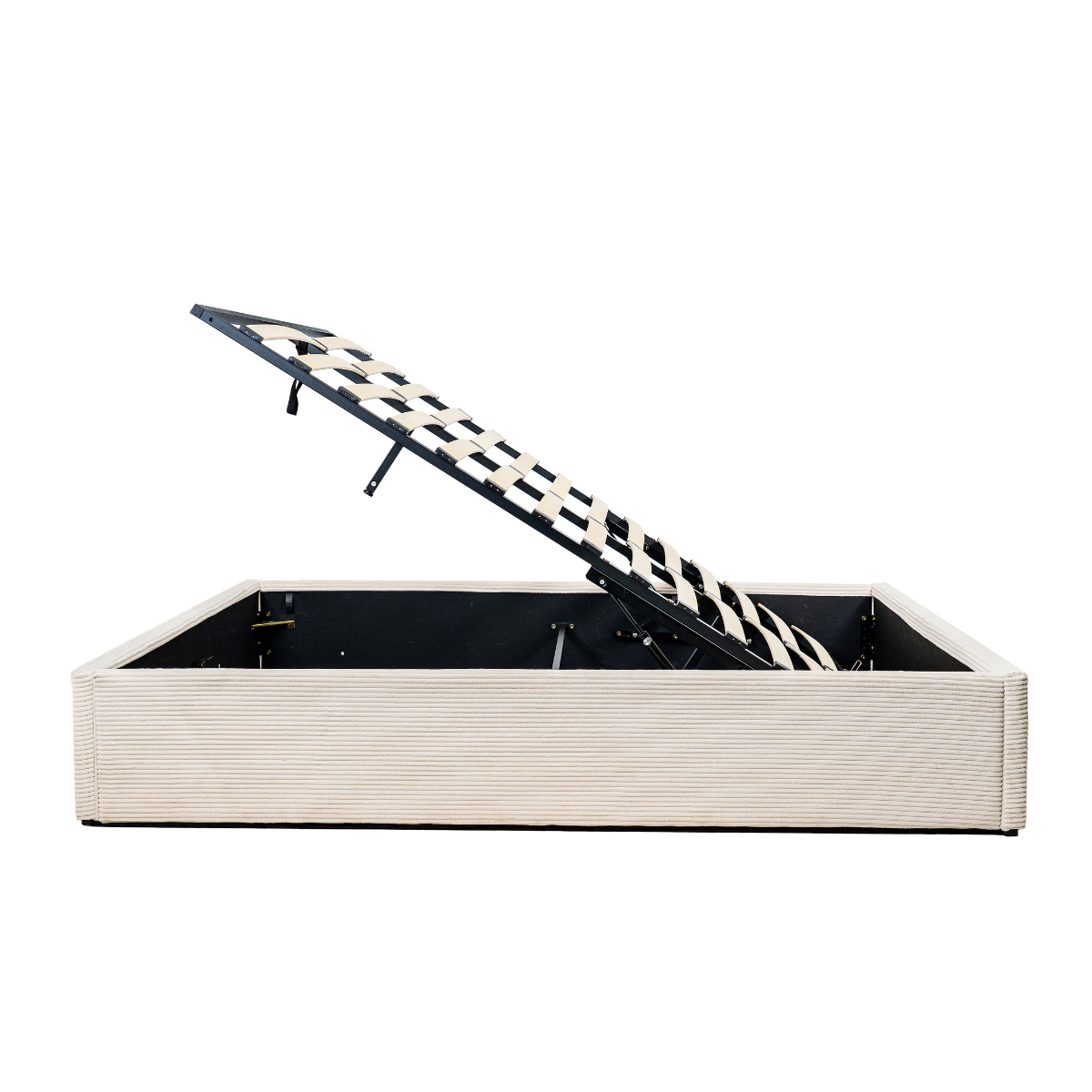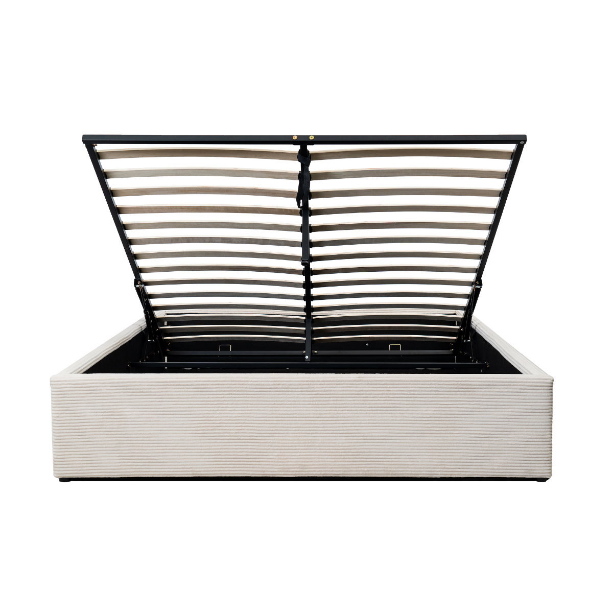 - De bedbodem kan dankzij gasveren worden opgetild en biedt toegang tot een grote opbergruimte.