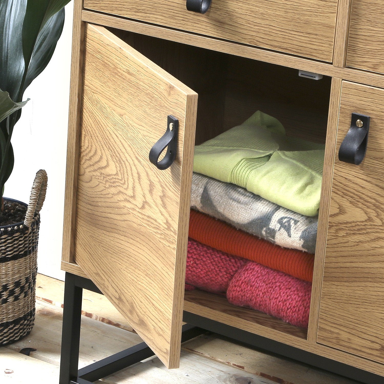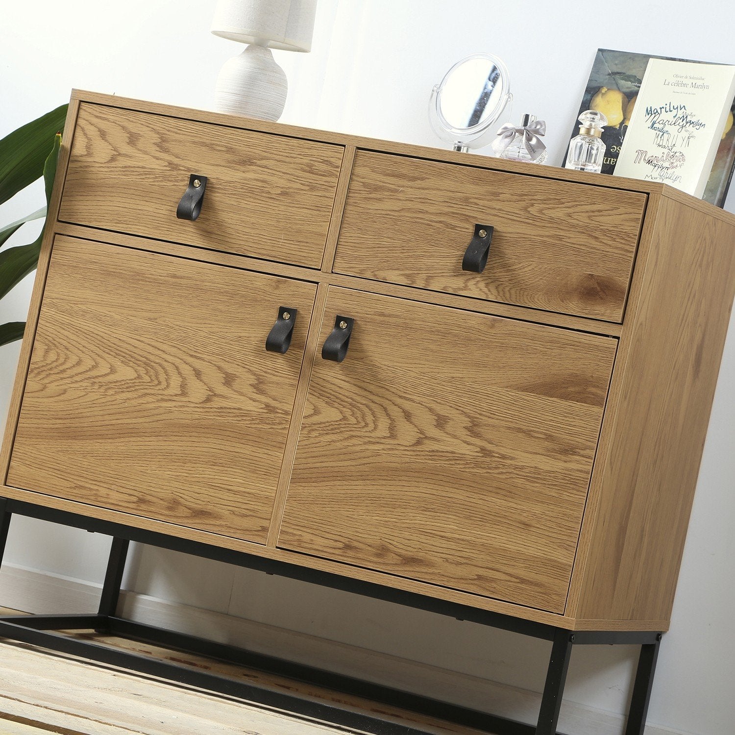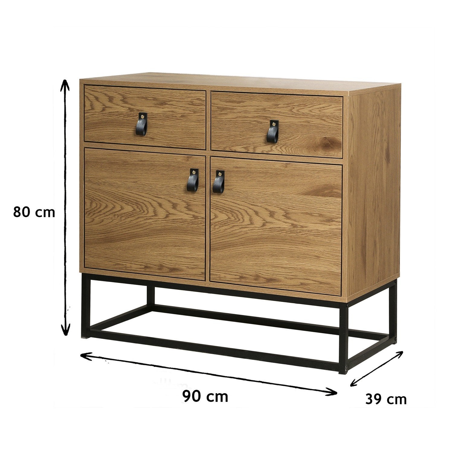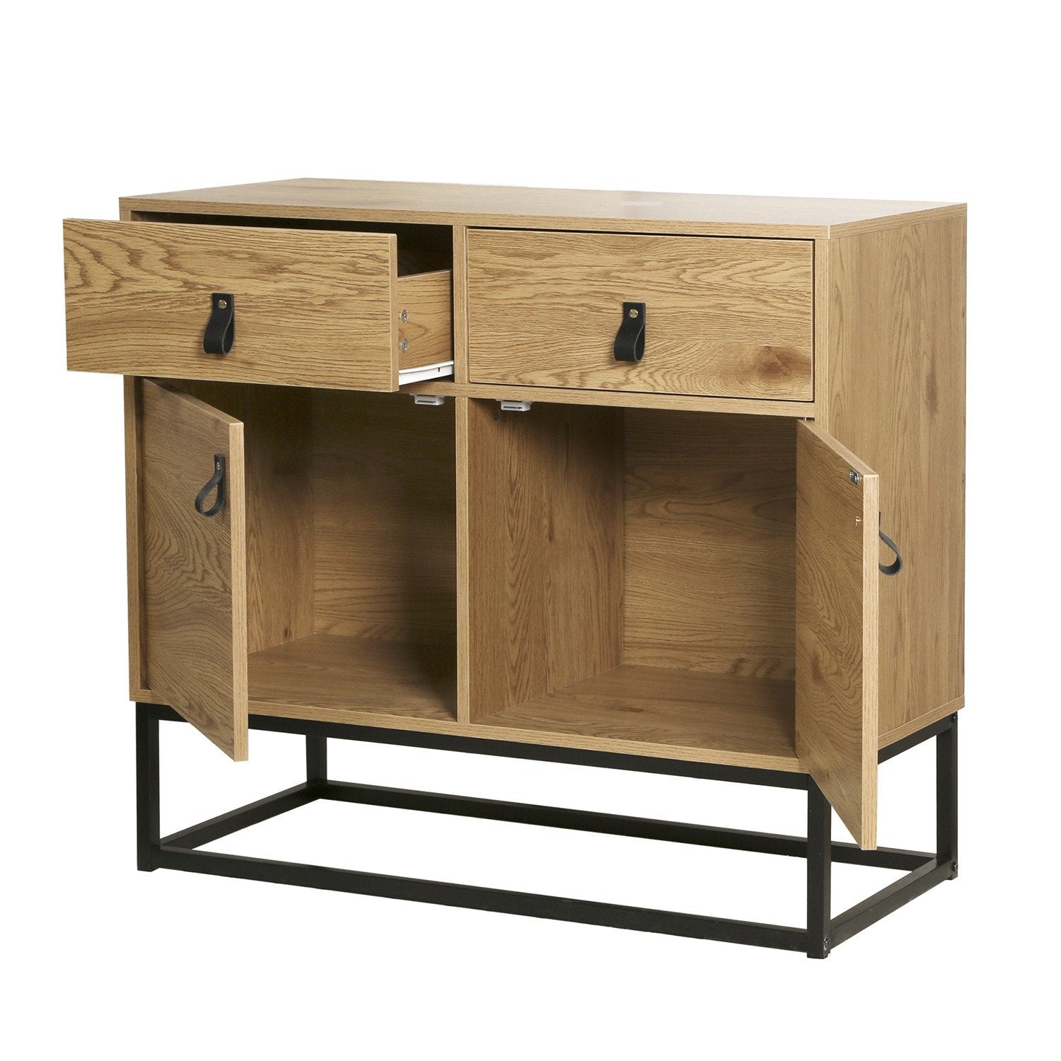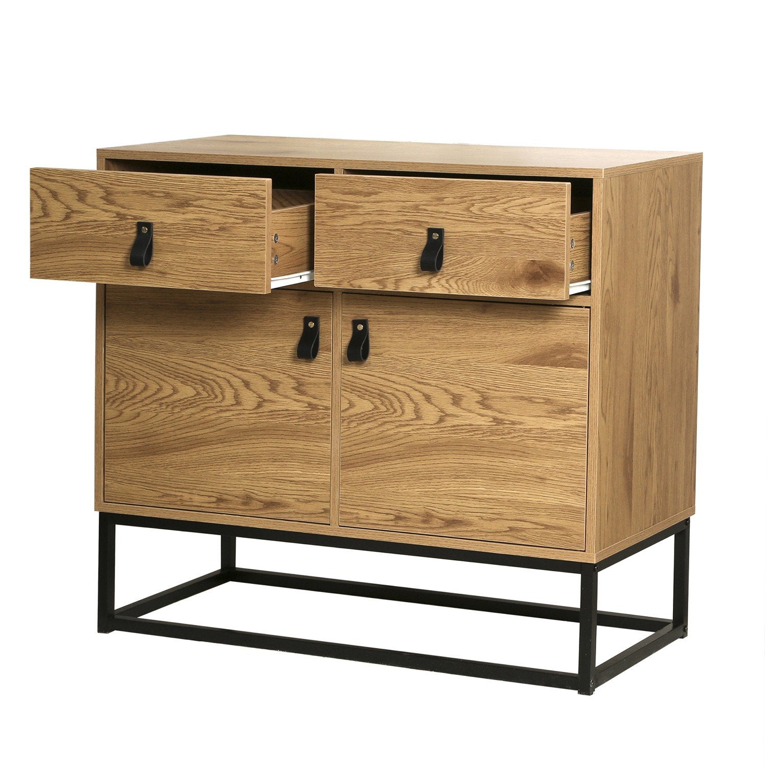 Geniet van de Dressoir met eikendecor, 2 deuren en 2 lades, met zwart metalen onderstel in industriële stijl, die stijlvolle opbergruimte aan uw interieur toevoegt: