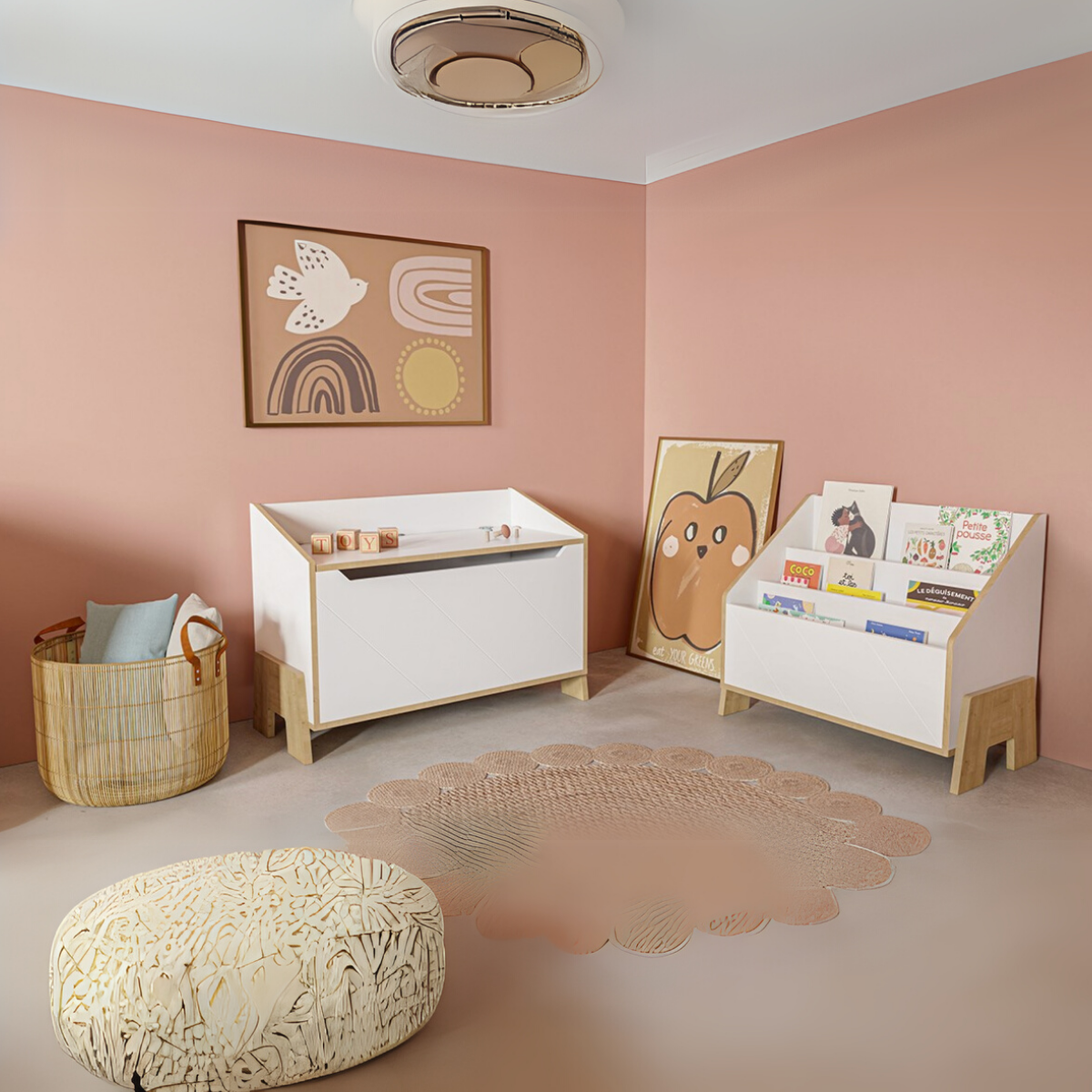 Productkenmerken: Speelgoedkist met deksel, wit en eiken hamilton decor. 2 functies: bank en kist met rem en deksel. Gelakt MDF, massief grenen poten. Watergedragen verf, zonder zware metalen. Productafmetingen: Lengte 93,6 cm x Breedte 36 cm x Hoogte 57,3 cm - Nettogewicht: 18,33 kg. Afmetingen pakket: Pakket nr. 1: Lengte 53,6 cm x Hoogte 11,1 cm x Breedte 95 cm - Brutogewicht: 20 kg.