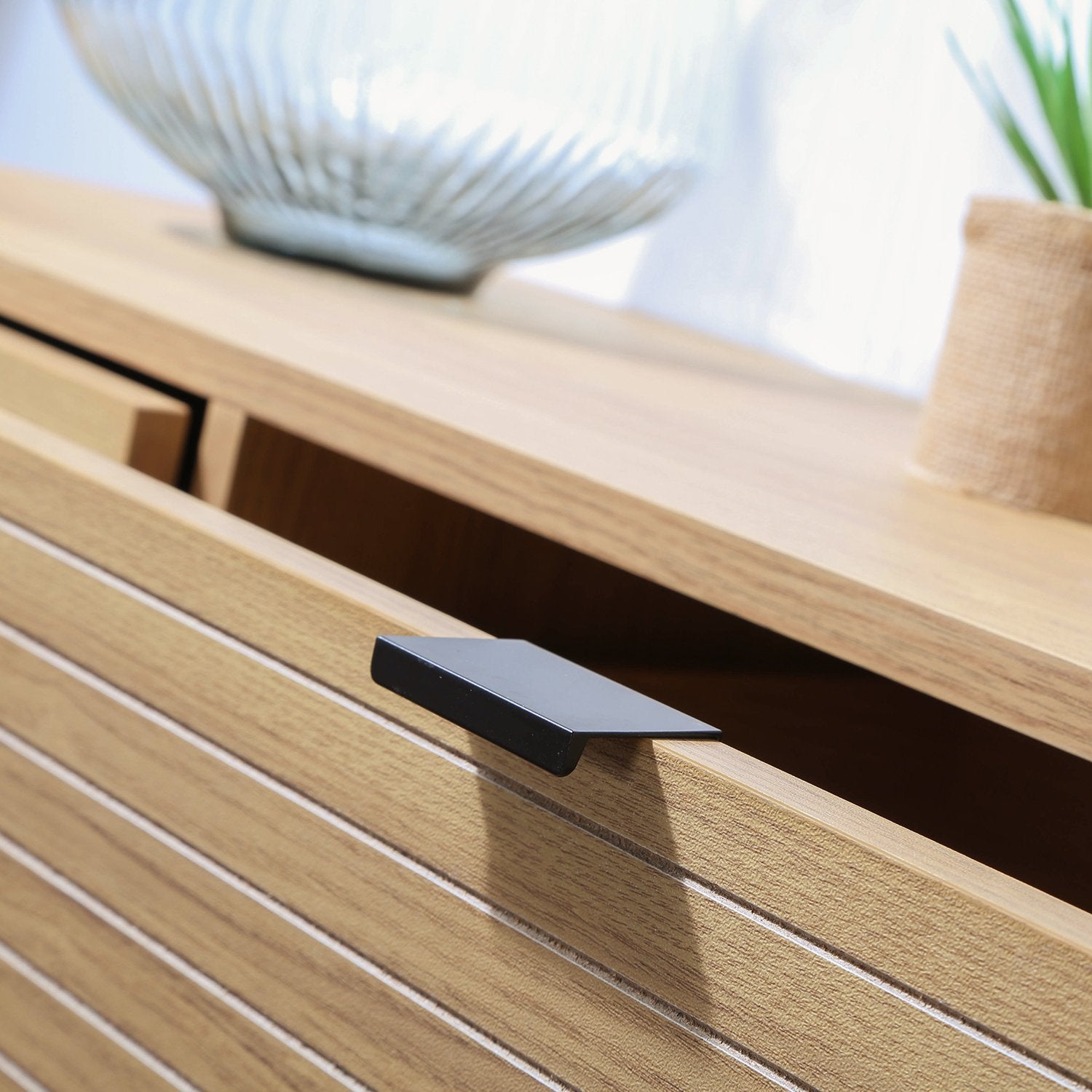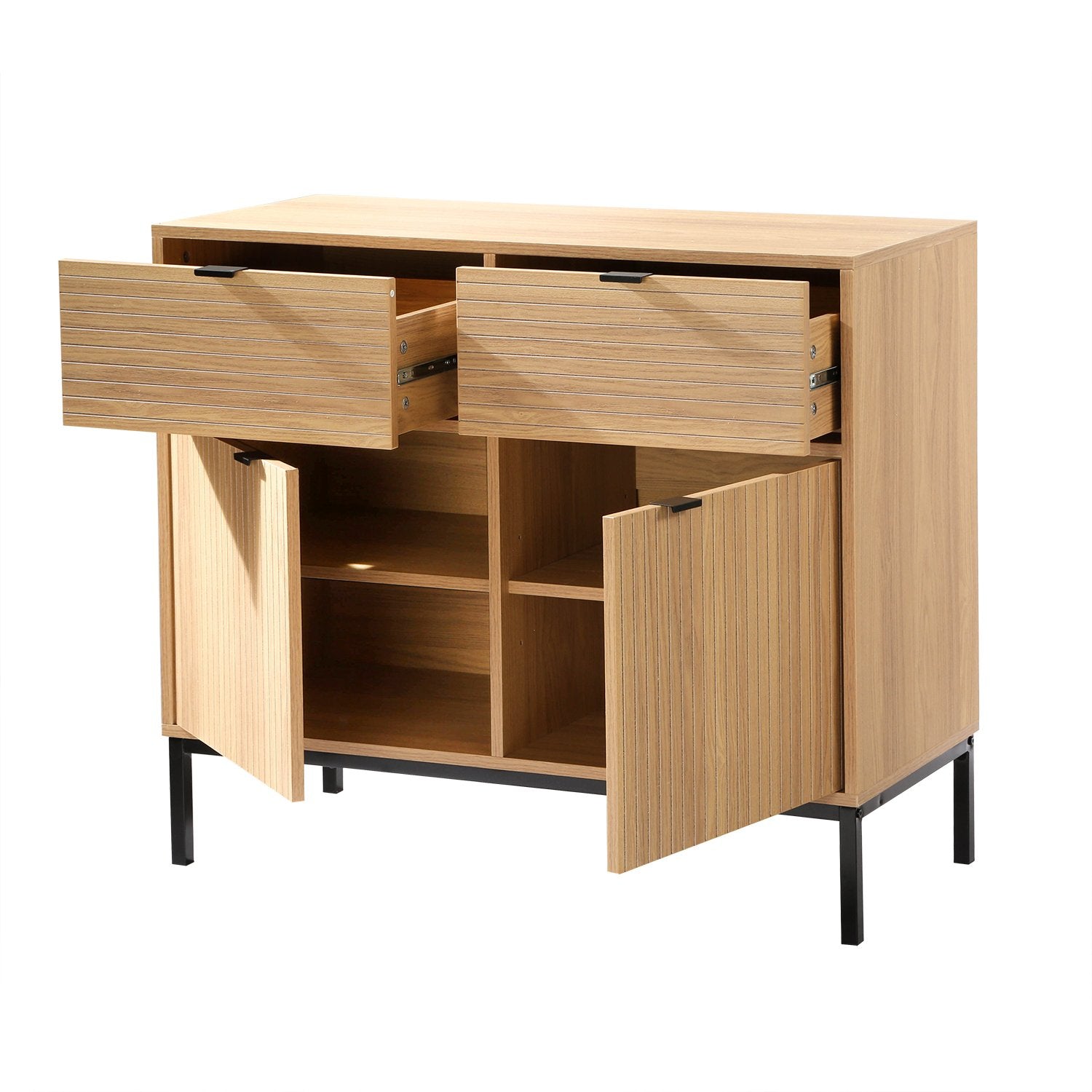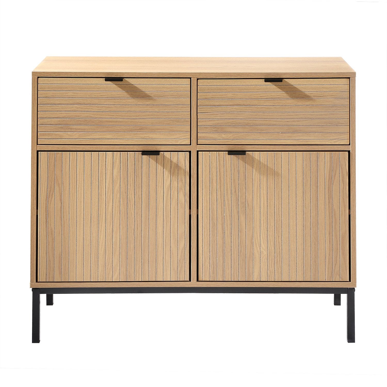 Producteigenschappen: Ontdek onze ladekast met 2 deuren en 2 lades, perfect voor het opbergen van al uw spullen in een compact meubelstuk met een modern design. Ideaal voor extra opbergruimte in uw slaapkamer of voor het inrichten van uw woonkamer. Meubel gemaakt van spaanplaat, voorkant in MDF met zwarte metalen poten. Ladefronten met horizontaal lamelleneffect en deuren met verticale lamellen. Handgrepen van zwart metaal, poten van zwart metaal. Productafmetingen: Lengte 90 cm x Breedte 39 cm x Hoogte 79 cm - Nettogewicht: 26 kg. Afmetingen pakket: Lengte 99 cm x Breedte 39 cm x Hoogte 79 cm - Brutogewicht: 27 kg.