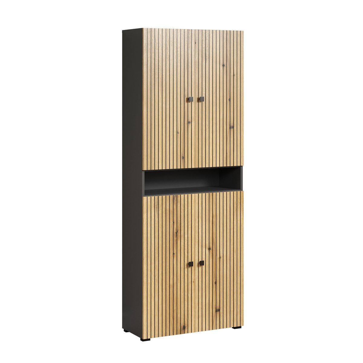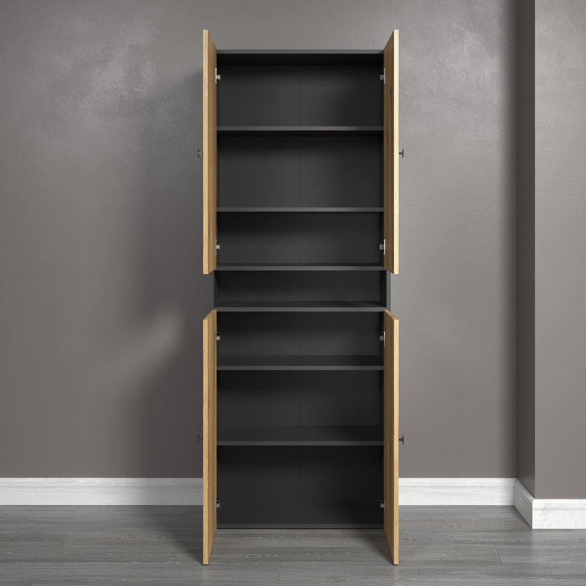 - Dubbele badkamerkast met 4 deuren, 1 open vak en 4 legplanken binnenin.