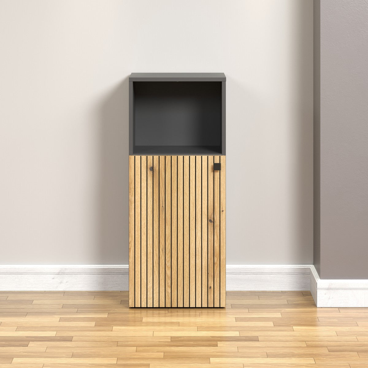 - Niedriger Badezimmerschrank mit 1 Tür, 1 Nische und 1 Einlegeboden im Inneren.