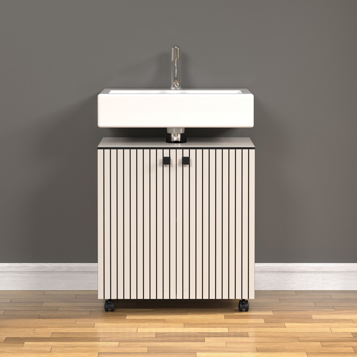 - Waschbeckenschrank mit Rollen, 2 Türen, mit 1 Einlegeboden im Inneren.