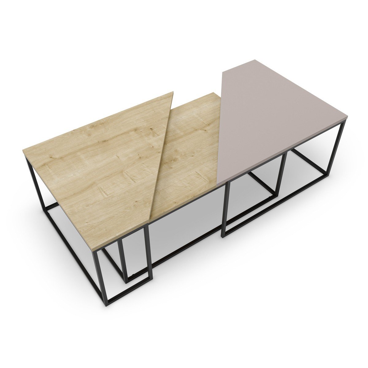 Productkenmerken: De zwarte metalen structuur vormt een open geometrisch kader, wat lichtheid en moderniteit brengt. Ideaal voor een eigentijds interieur, combineert deze tafel functionaliteit en esthetiek, waarbij een praktische ruimte wordt geboden terwijl een verfijnde en originele touch aan uw woonkamer wordt toegevoegd. Verkrijgbaar in drie kleuren: Eiken/Mokka/Eiken, Eiken/Zijdezwart, Eiken/Eiken/Mokka. Productafmetingen: Lengte 110/96 cm x Breedte 70/60 cm x Hoogte 42/41,8 cm - Nettogewicht: 20,75 kg. Afmetingen van het pakket: Pakket nr. 1: Lengte 126,6 cm x Hoogte 75,8 cm x Diepte 15 cm - Bruto gewicht : 25,8 kg.