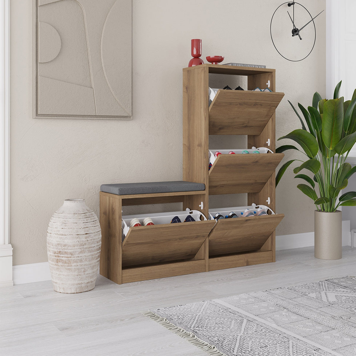 Productkenmerken: Onze schoenenkast is niet alleen een opbergoplossing. Zeer grote opbergruimte voor al uw schoenen. Gemaakt van 100% melamine spaanplaat. FSC-gecertificeerd, wat betekent dat het product is gemaakt van 100% gerecycled hout afkomstig uit duurzaam beheerde bossen. Productafmetingen: breedte 26 cm x lengte 105 cm x hoogte 118,5 cm - nettogewicht: 29,1 kg. Verpakkingsafmetingen: Pakket nr.1: lengte 39,8 cm x hoogte 131,1 cm x diepte 23,2 cm - bruto gewicht: 30 kg.