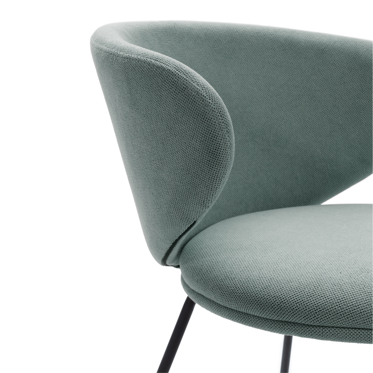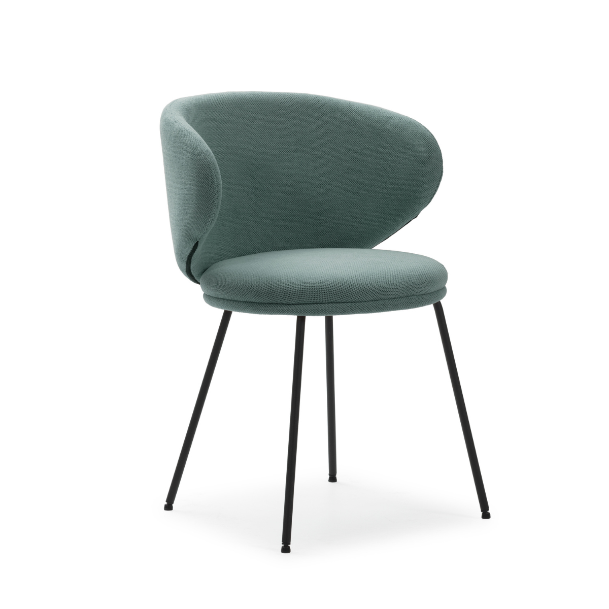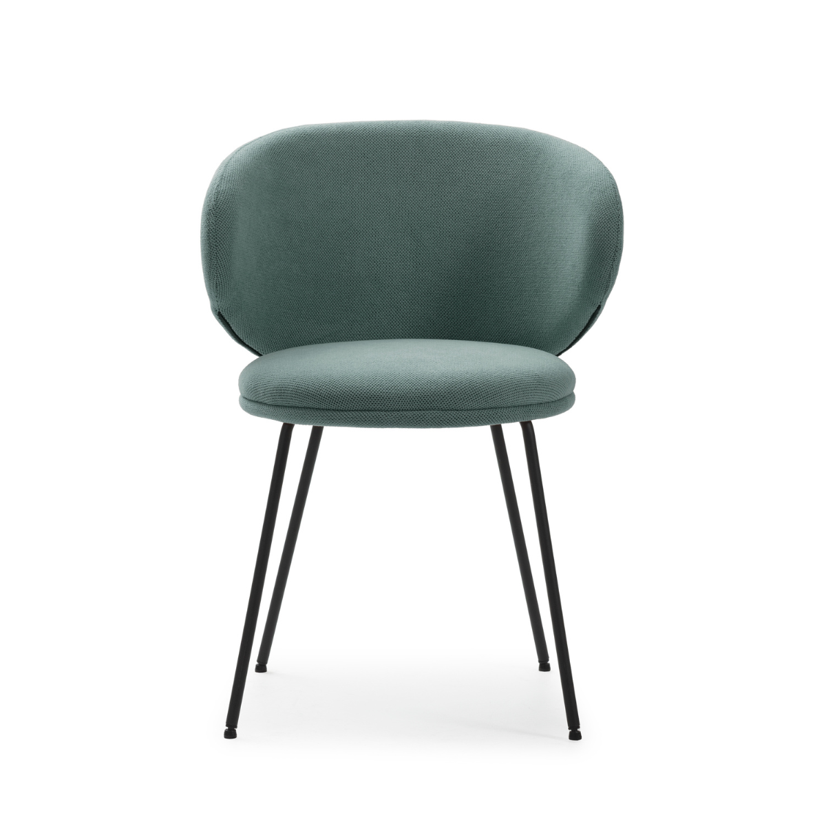 - Zit- en rugleuning: Stof, poten van zwart gelakt metaal.
