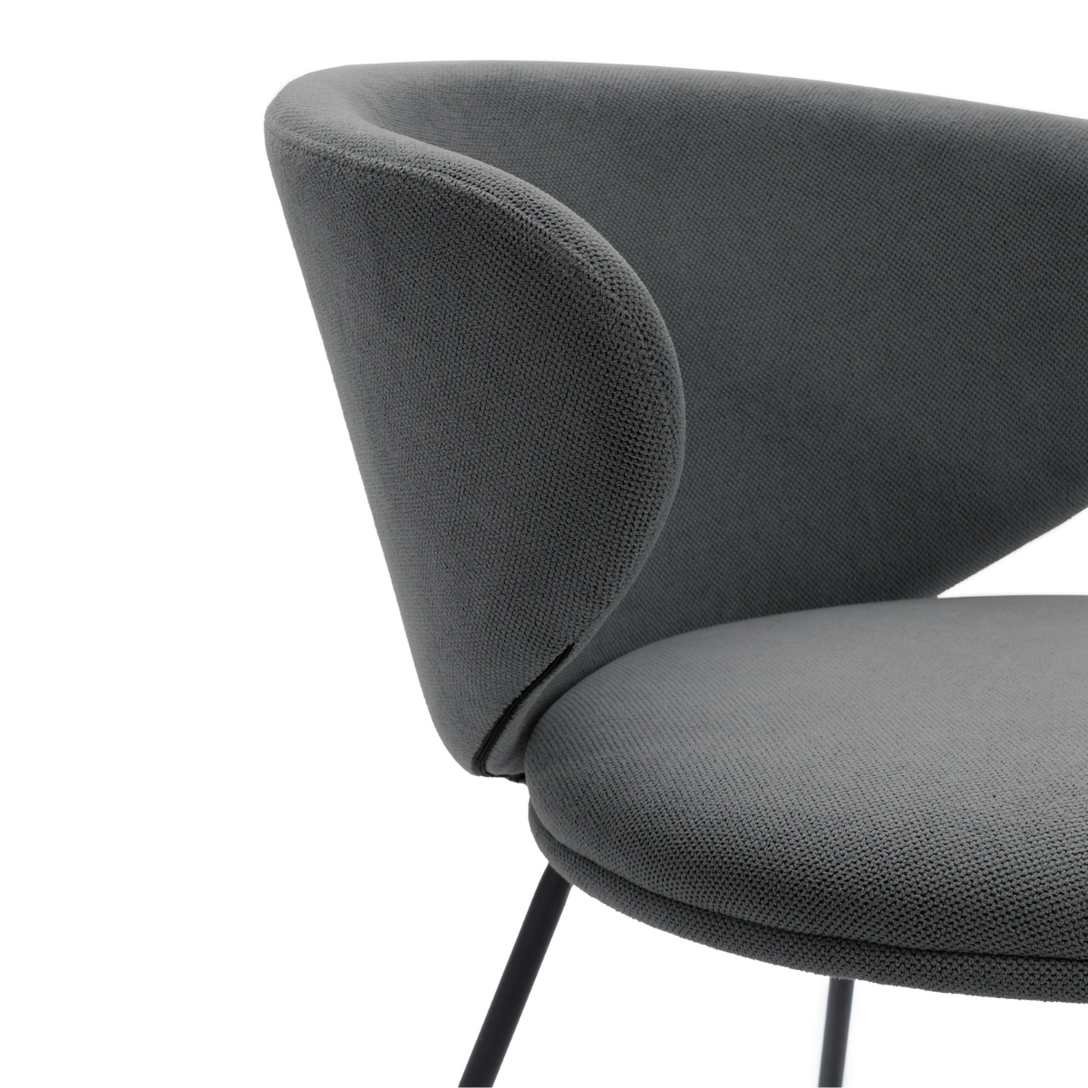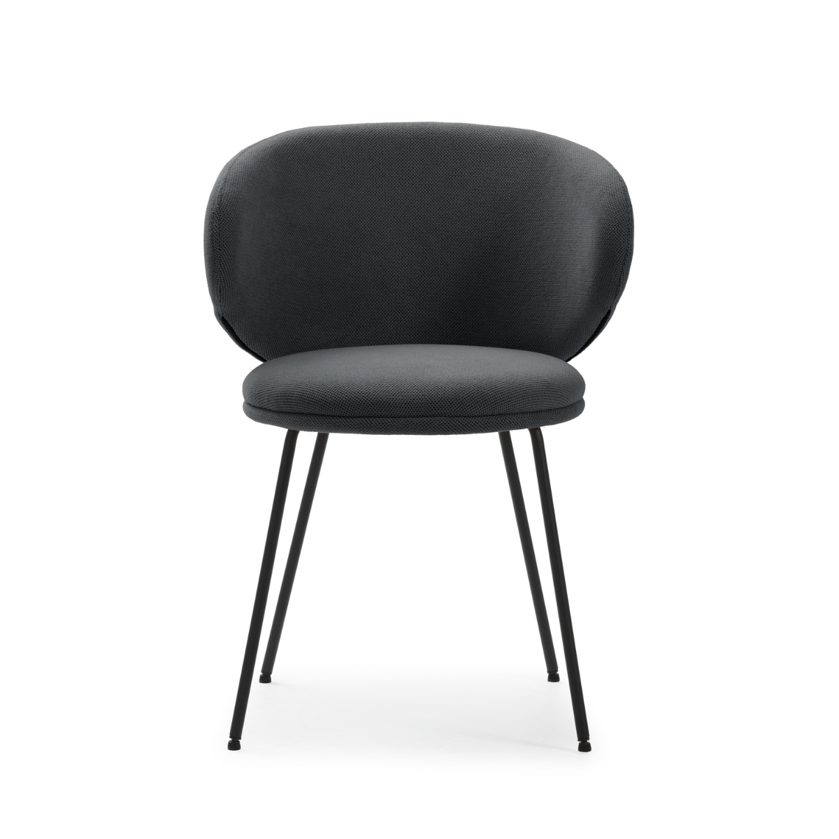 - Zit- en rugleuning: Stof, poten van zwart gelakt metaal.