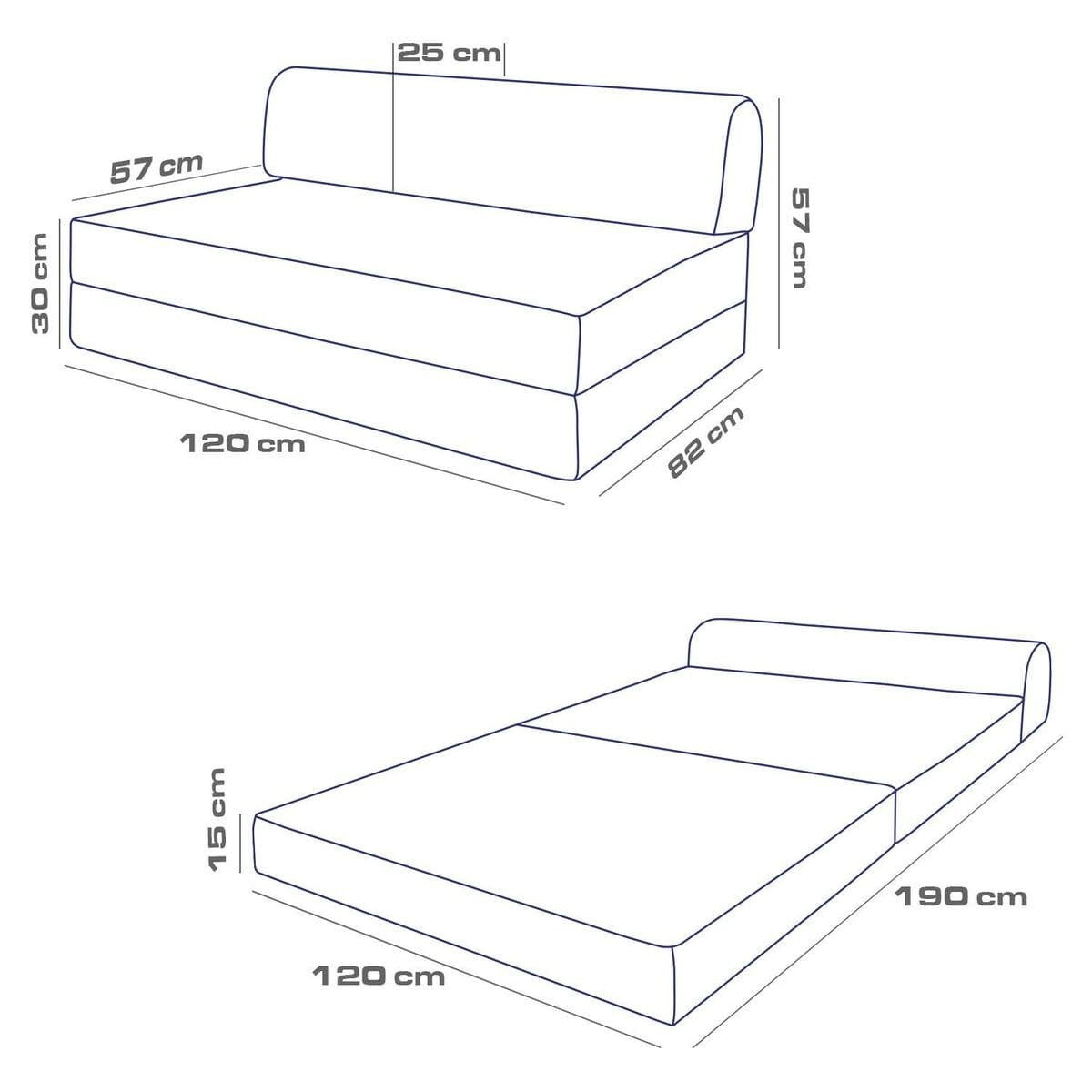- Afmetingen bed: Breedte 120 cm x Diepte 190 cm x Hoogte 15 cm.