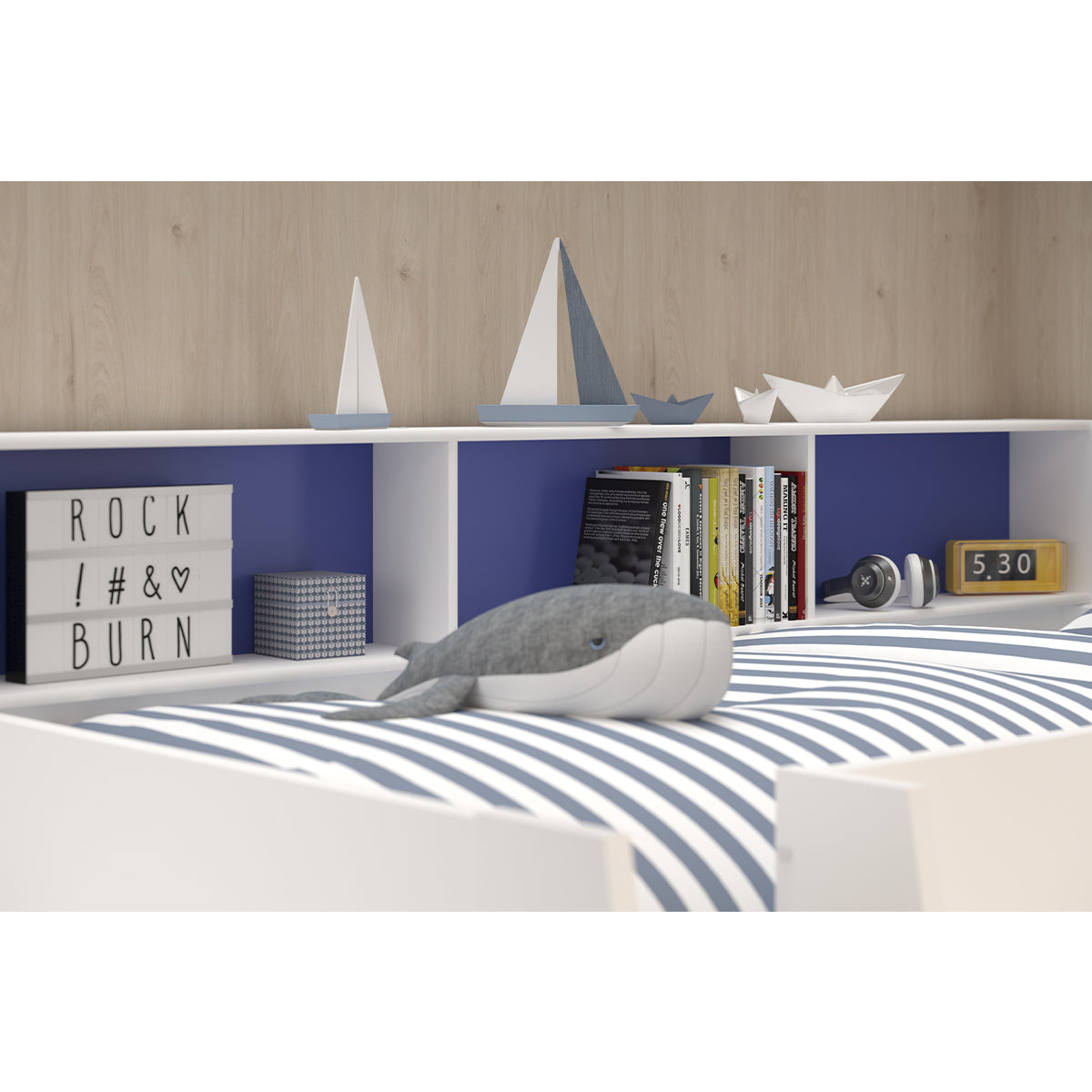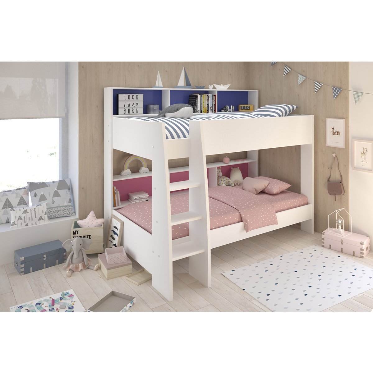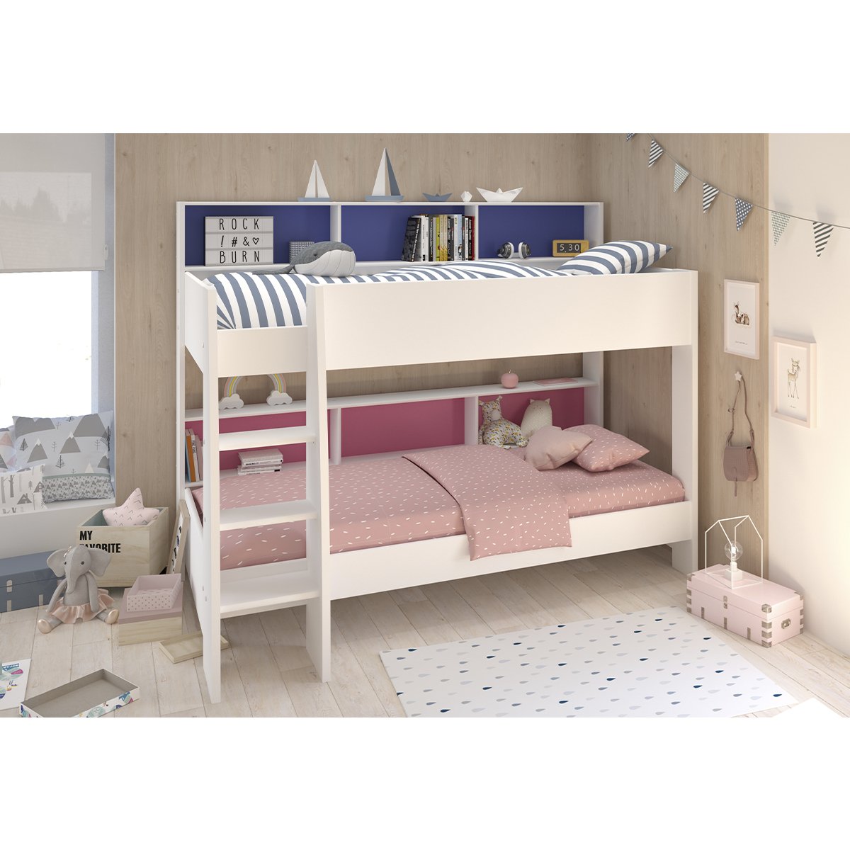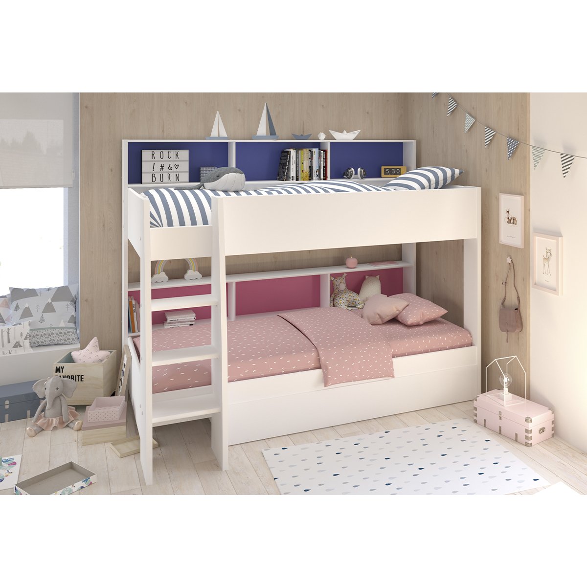Deze prachtige stapelbed uit de Léo-collectie zal de kamer van uw kinderen mooi uitrusten. Het ontwerp is uniek met de geïntegreerde trap. De planken naast elk matras bieden een mooie opbergruimte voor boeken, wekker en knuffel. Elke boekenkast heeft een achtergrond naar keuze met een andere kleur aan elke kant. Productkenmerken: Stapelbedden met matrasmaat 90x200 3 vakken boven de bedden waarvan de achtergronden omkeerbaar zijn: roze of blauw, wit of licht hout en donkergrijs 2 lattenbodems inbegrepen, bekleed met wit decorpapier op spaanplaat Herkomst: Gemaakt in Frankrijk Lattenbodem: Inclusief geperforeerde lattenbodems gemaakt van spaanplaat met wit decor Matrasafmetingen: 90x200 Afmetingen bedframe: 207,2x131,9x164,4 Matras: niet inbegrepen Lattenbodem: inbegrepen Productafmetingen: Lengte 207,2 cm x Breedte 131,9 cm x Hoogte 164,4 cm -Nettogewicht: 130 kg Verpakkingsafmetingen: Pakket nr. 1: Lengte 34,1 cm x Hoogte 9,1 cm x Diepte 172,7 cm - Brutogewicht: 25 kg Pakket nr. 2: Lengte 34,5 cm x Hoogte 9,7 cm x Diepte 211,9 cm - Brutogewicht: 31 kg Pakket nr. 3: Lengte 90,2 cm x Hoogte 3,6 cm x Diepte 207,3 cm - Brutogewicht: 36 kg Pakket nr. 4: Lengte 40,4 cm x Hoogte 8,3 cm x Diepte 174,4 cm - Brutogewicht: 26 kg Pakket nr. 5: Lengte 28,3 cm x Hoogte 10,3 cm x Diepte 78,9 cm -Brutogewicht: 12 kg
