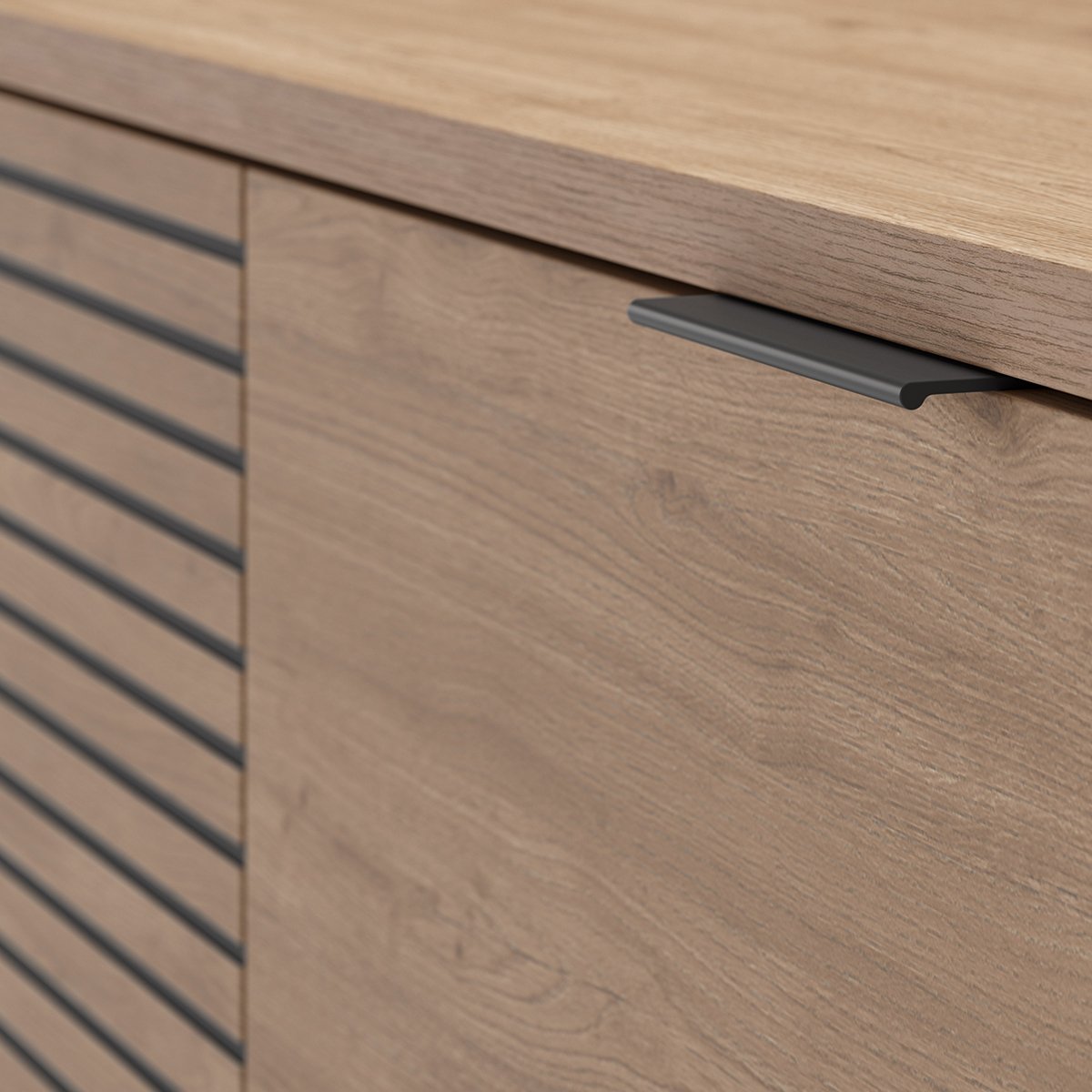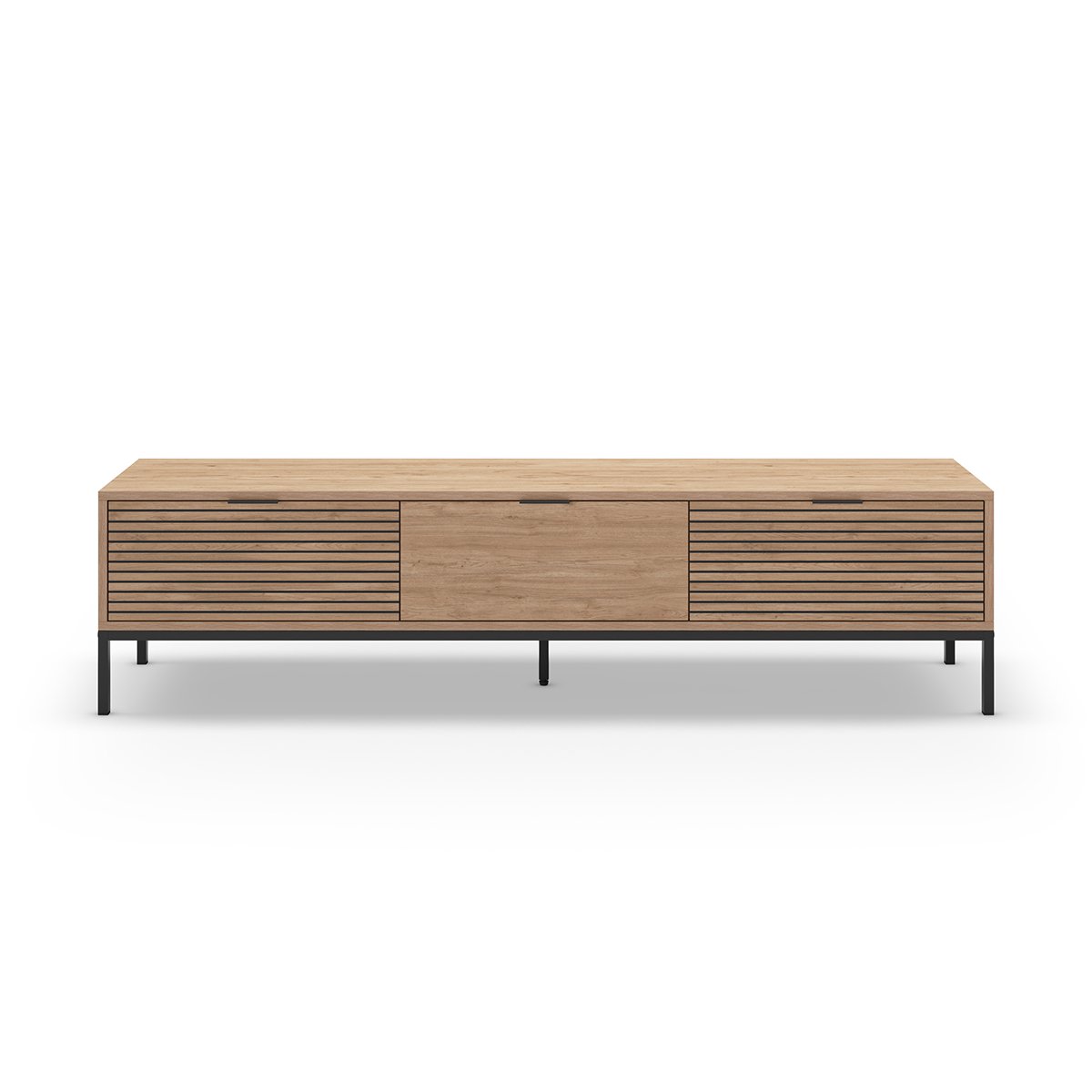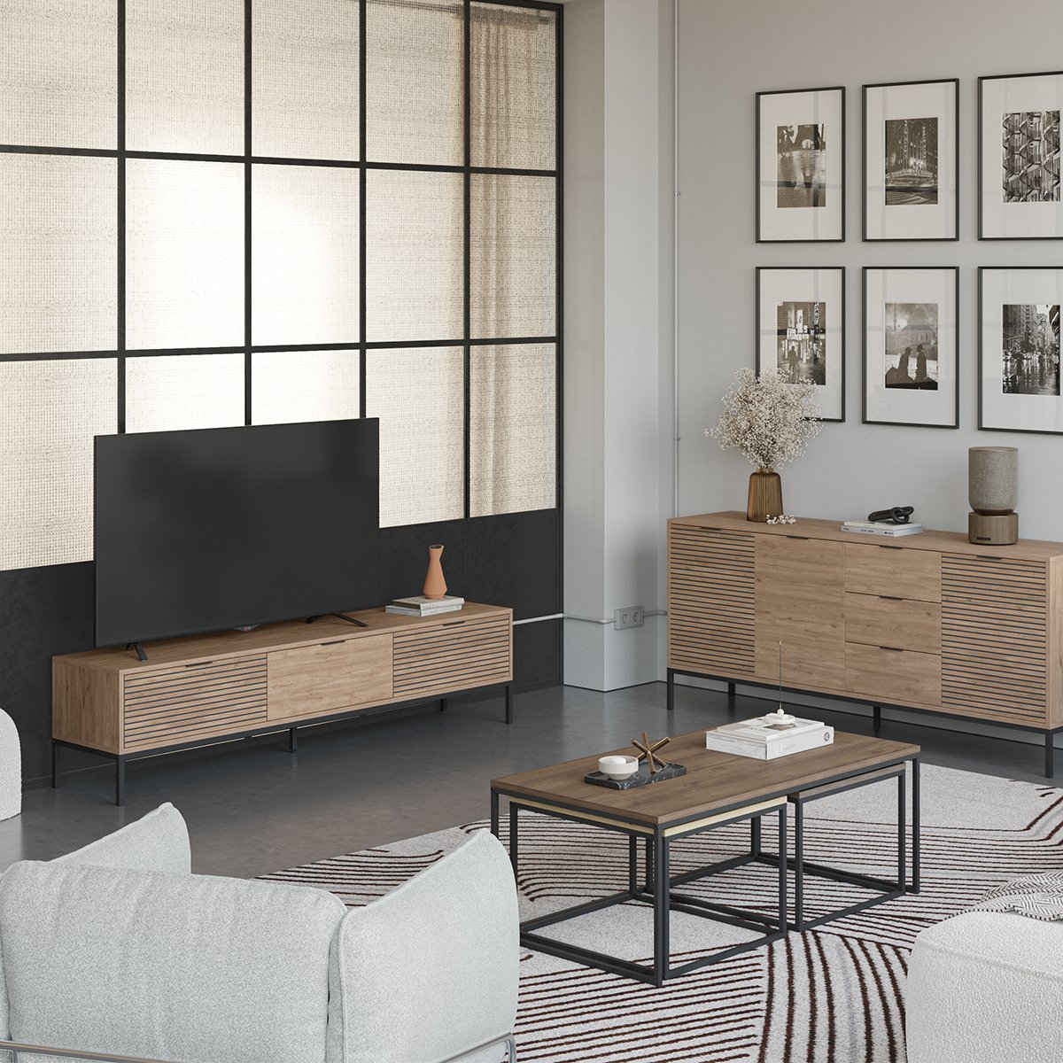Productkenmerken: Gemaakt van 18 mm gelamineerde spaanplaten. Eiken kleur met zwarte groeven. Zwarte metalen poten en fijne zwarte metalen handgrepen. Ontdek de ARIEL TV-meubel, een eyecatcher die je woonkamer transformeert in een industriële en moderne ruimte. Dit meubel biedt voldoende opbergruimte voor het organiseren van elektronische apparatuur en decoratieve objecten. Productafmetingen: Lengte 180 cm x breedte 40 cm x hoogte 55 cm - Nettogewicht: 39,9 kg. Verpakkingsafmetingen: Verpakking 1: Lengte 187 cm x breedte 44,5 cm x hoogte 8,5 cm - Brutogewicht: 28,06 kg. Verpakking 2: Lengte 67,5 cm x breedte 44 cm x hoogte 12 cm - Brutogewicht: 15,4 kg. Totaal brutogewicht: 43,46 kg.