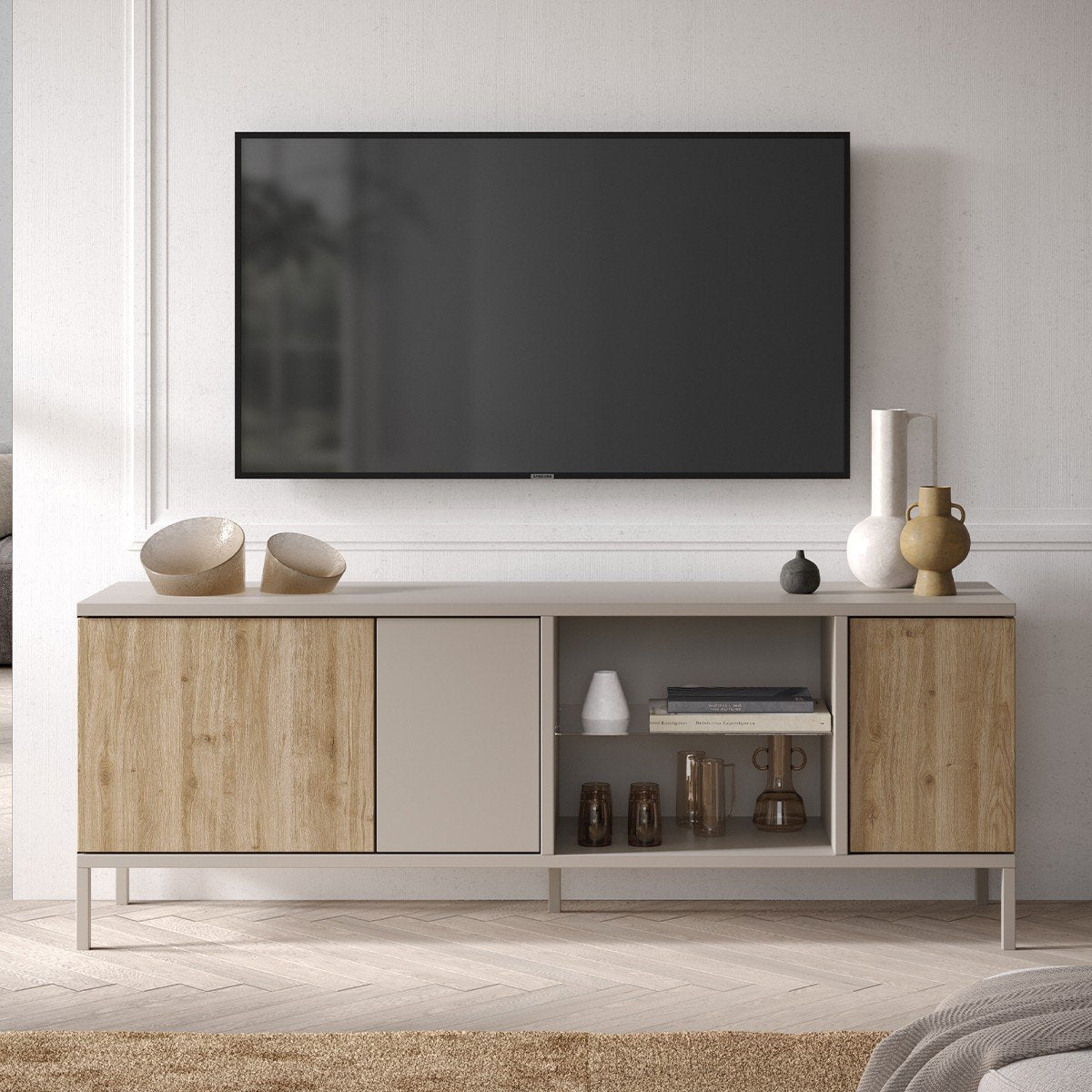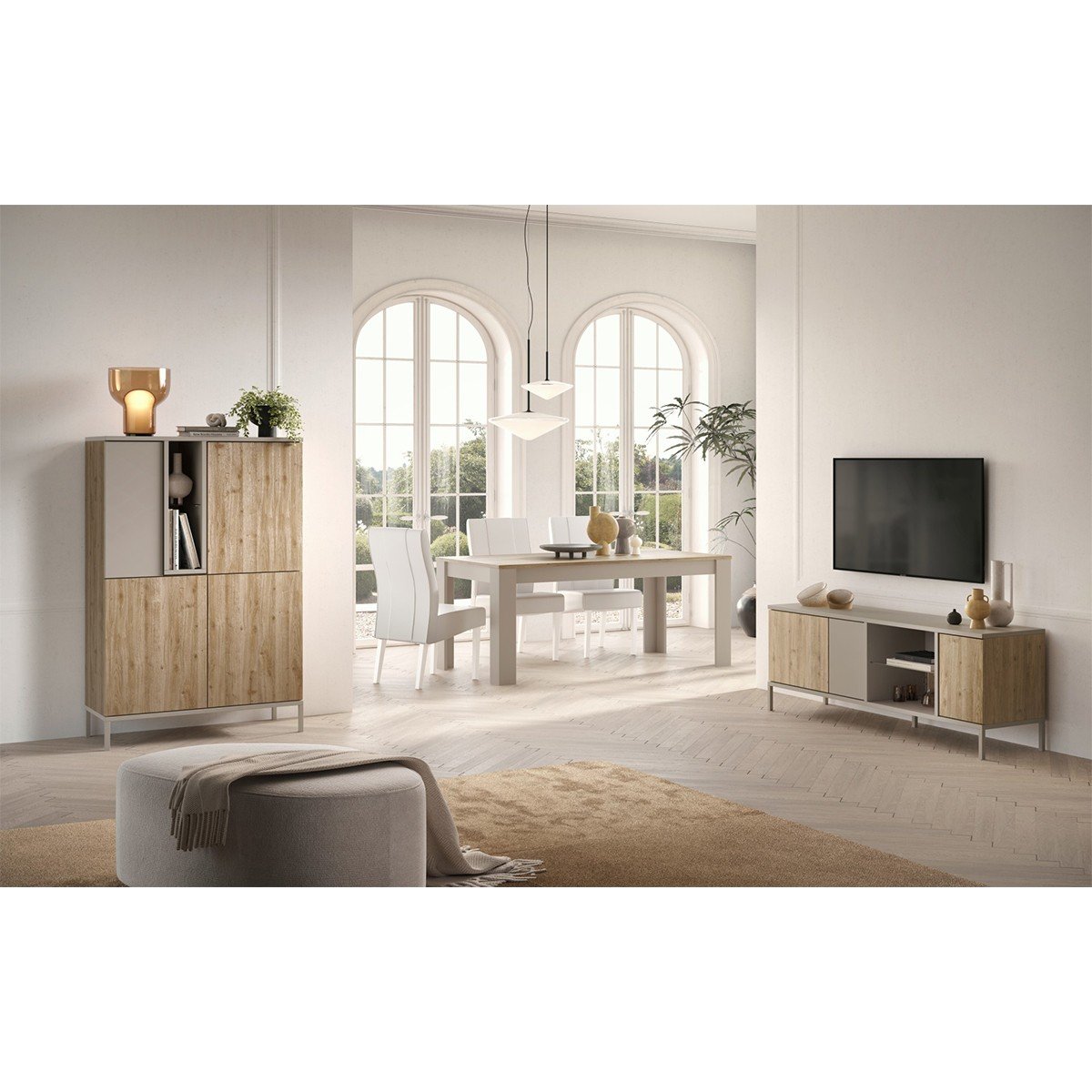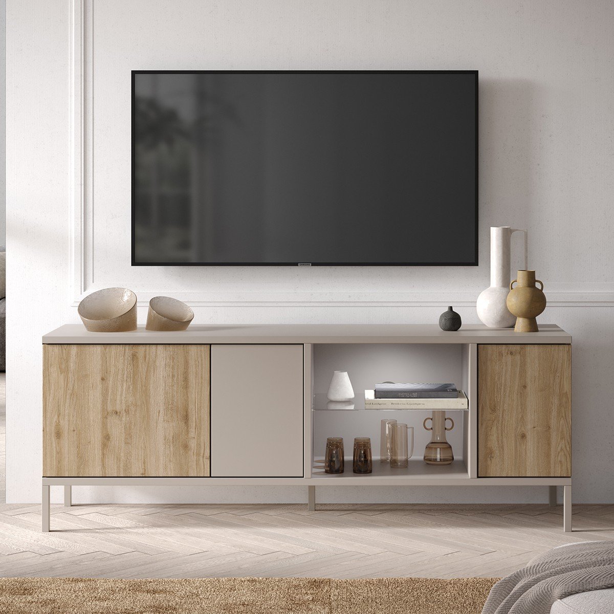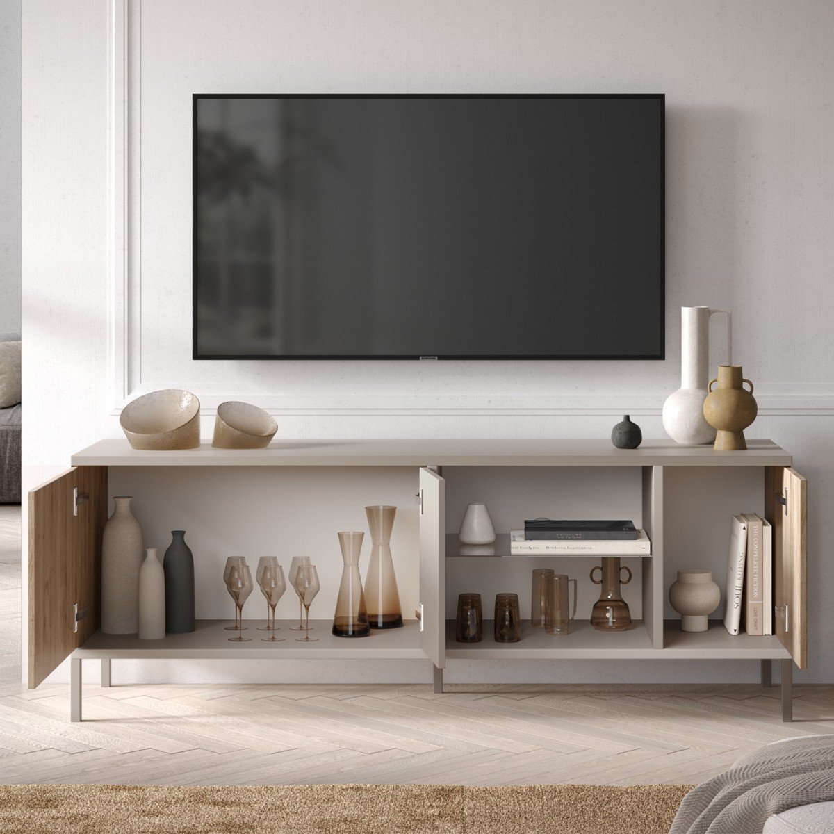 Productkenmerken: Italiaanse fabricage. FSC-gecertificeerd, wat betekent dat de gebruikte materialen vervaardigd zijn van 100% gerecycled hout of vezels. 3 deuren. 1 glazen plank. 1 nis. Metalen poten. Push-pull opening. Productafmetingen: Lengte 160 cm x Hoogte 59 cm x Breedte 43 cm - Nettogewicht: 41,26 kg. Afmetingen van de verpakking: Verpakking nr. 1: Lengte 169 cm x Breedte 46,5 x Diepte 5,5 cm - Bruto gewicht: 22 kg. Verpakking nr. 2: Lengte 103,5 cm x Breedte 46,5 x Diepte 9,5 cm - Bruto gewicht: 20,1 kg.