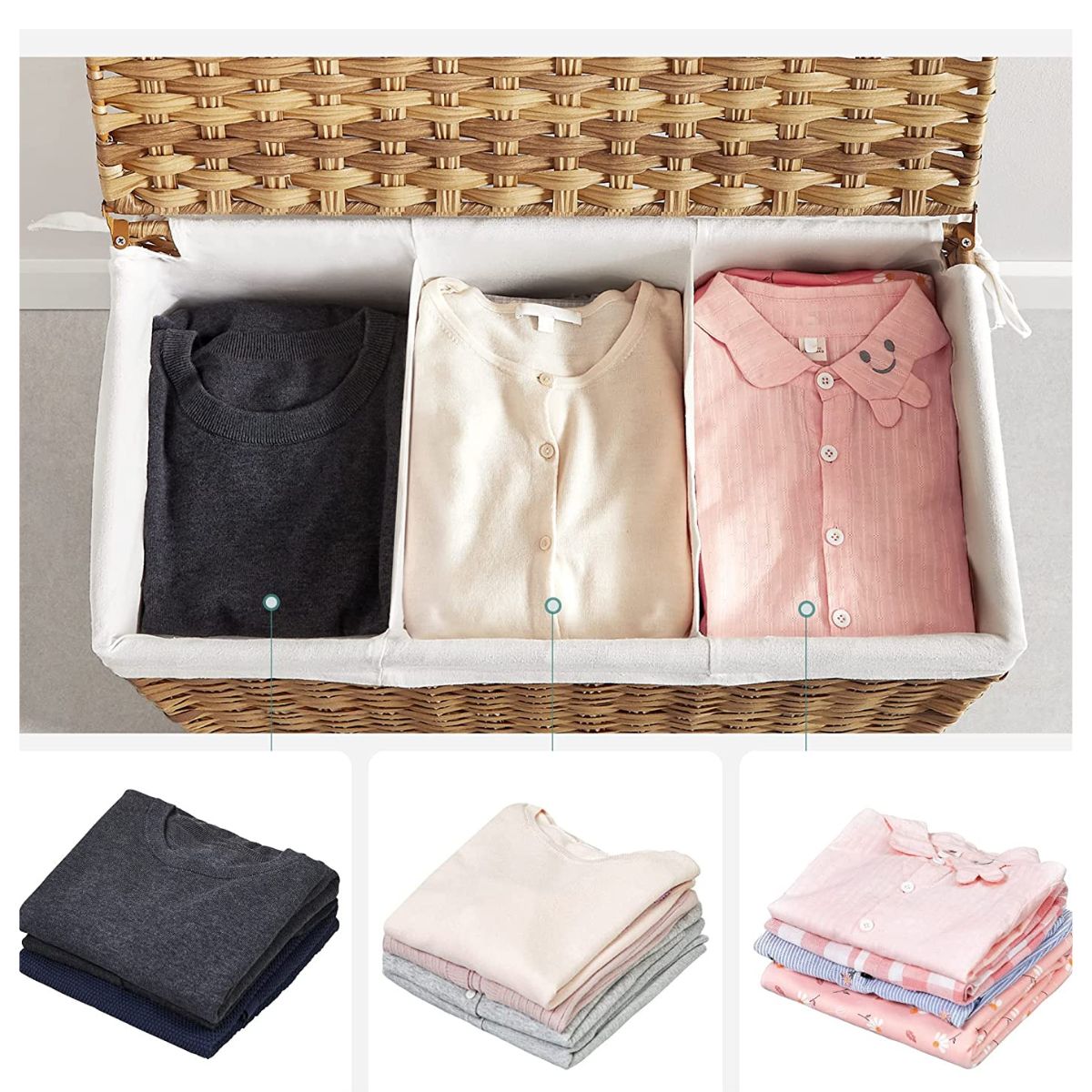 Kenmerken product: Wasmand in rieten stijl. Maximale capaciteit van 140L met 3 compartimenten. Verwijderbare voering - Katoenen tas. Handvatten en wielen (met stopfunctie) om de mand gemakkelijk tussen kamers te verplaatsen. Het deksel van de mand kan met één hand worden geopend en gesloten en voorkomt dat geuren ontsnappen en stof zich ophoopt. Statische draagcapaciteit: 30 kg. Productafmetingen: Breedte 33 cm x Lengte 66 cm x Hoogte 66 cm - Nettogewicht: 6 kg. Verpakkingsafmetingen: Breedte 8 cm x Hoogte 64 cm x Diepte 69 cm - Brutogewicht: 6 kg.