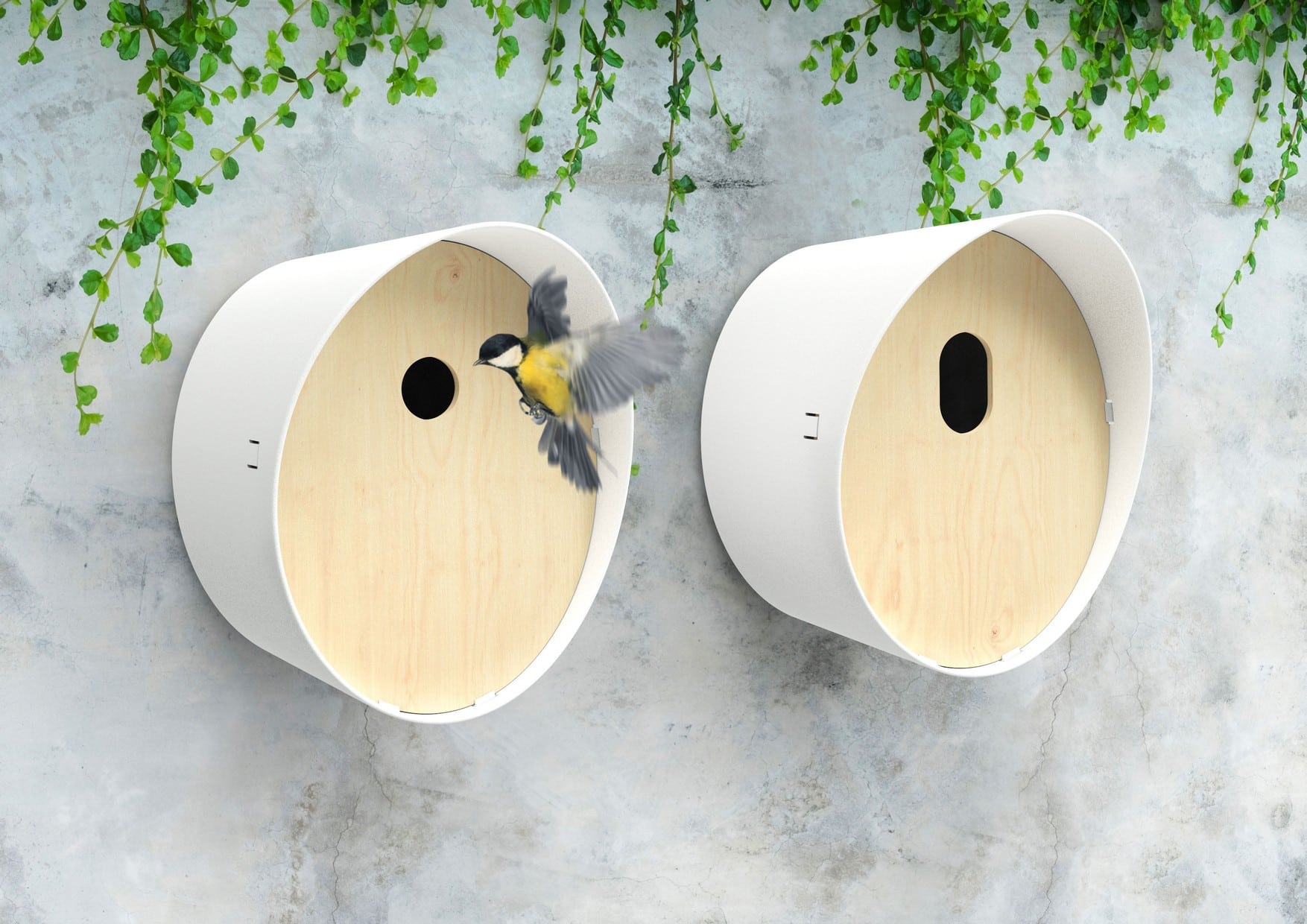 De vogelhuisjes zijn verkrijgbaar in een ronde, ovale en half open variant en in 3 kleuren: antraciet, wit en bruin.
