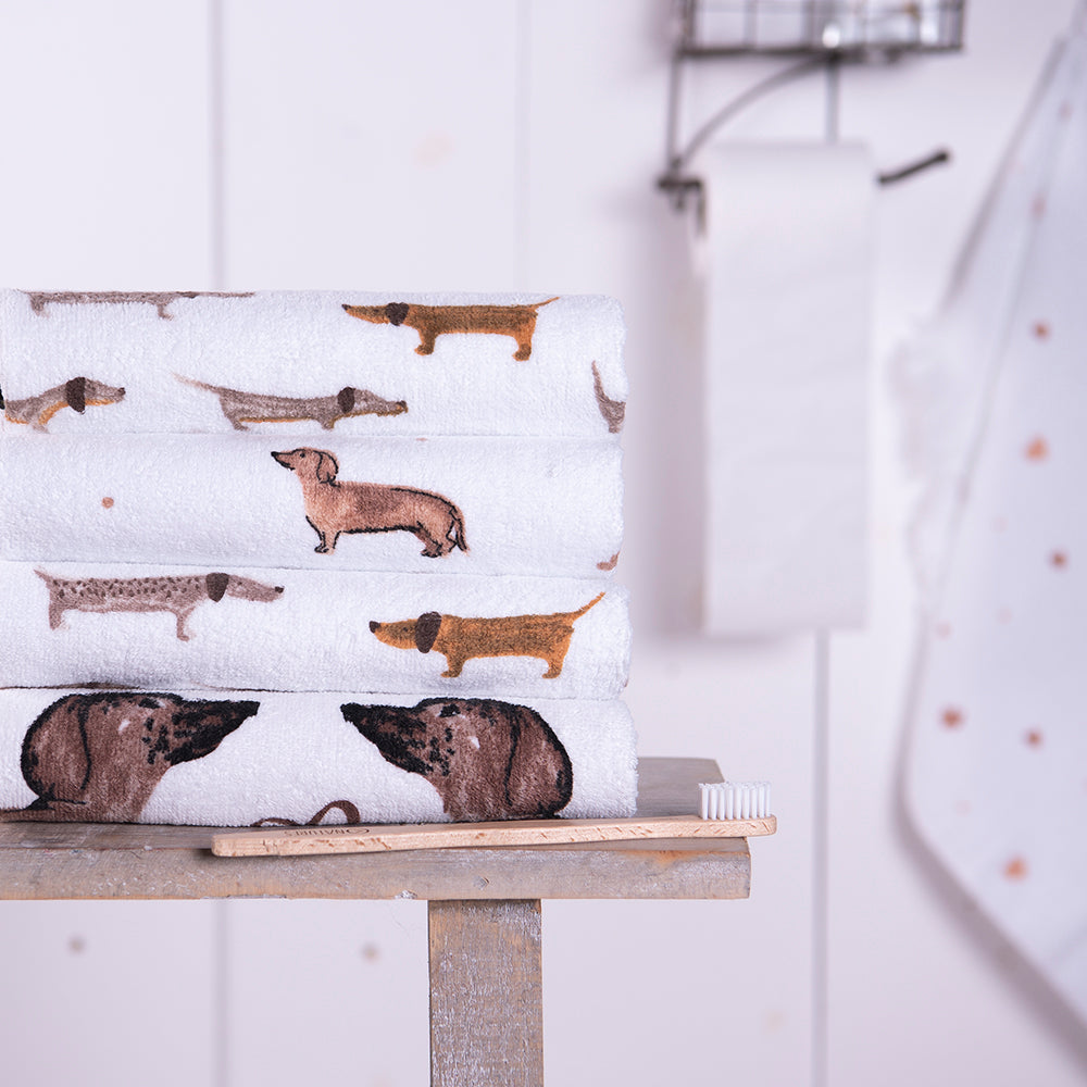 Wie is er nu niet gek op Teckels! Dit vrolijke maar eigenwijze ras, staat centraal in deze textielcollectie. De mooie bruinaccenten en vrolijke patronen laten het hart van elke hondenliefhebber sneller kloppen. De ovenhandschoen, pannenlap en ovenschort is zowel voor volwassenen als kinderen beschikbaar. De sierkussens geven extra sfeer en tovert elke ruimte om tot een gezellige ruimte. De stoffen broodmanden, theedoeken, tafelkleden en tafellopers zijn allemaal fraai vormgegeven en vormen een mooi geheel aan tafel en in de keuken. Gastendoekje Toilet Handdoek