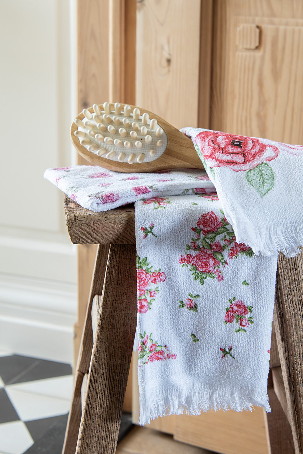 Deze serie is zoeter dan zoet! De zachtroze ondergrond, gecombineerd met het rozenpatroon vormt de vrolijke mierzoete basis van deze serie. De combinaties met het stip- en streeppatroon maakt dit textiel tevens allesbehalve saai. Het kanten detail op items als het tafelkleed, kussen, keukenschort, tafellopers en keukendoeken, maakt deze serie helemaal af. Met dit keukentextiel is geen etentje meer saai. Kies voor zoet! Gastendoekje Toilet Handdoek