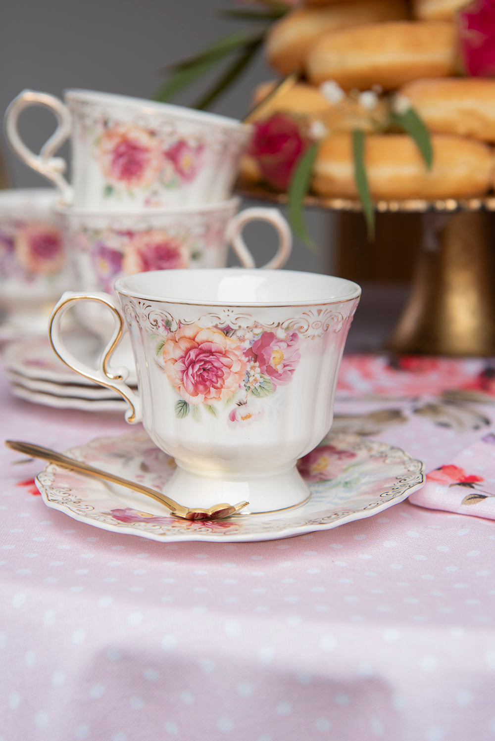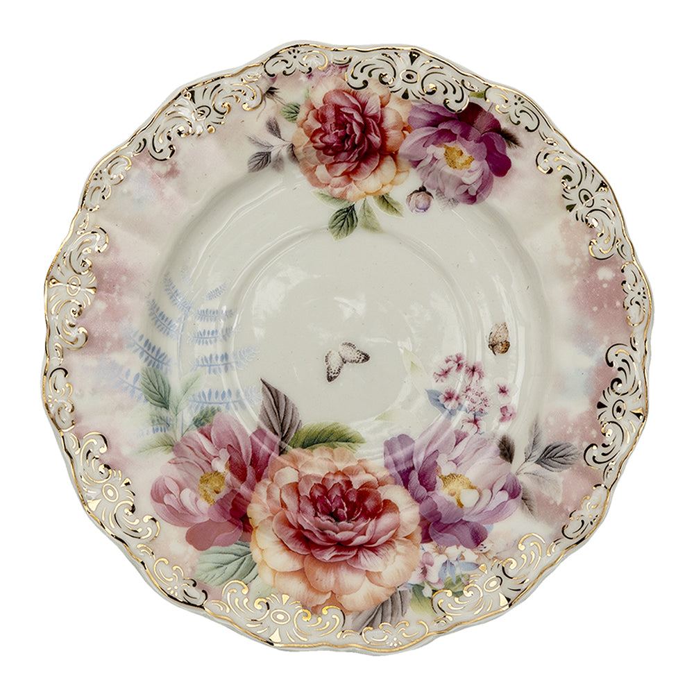 Clayre & Eef Kop en schotel 200 ml Beige Roze Porselein Rond Bloemen
