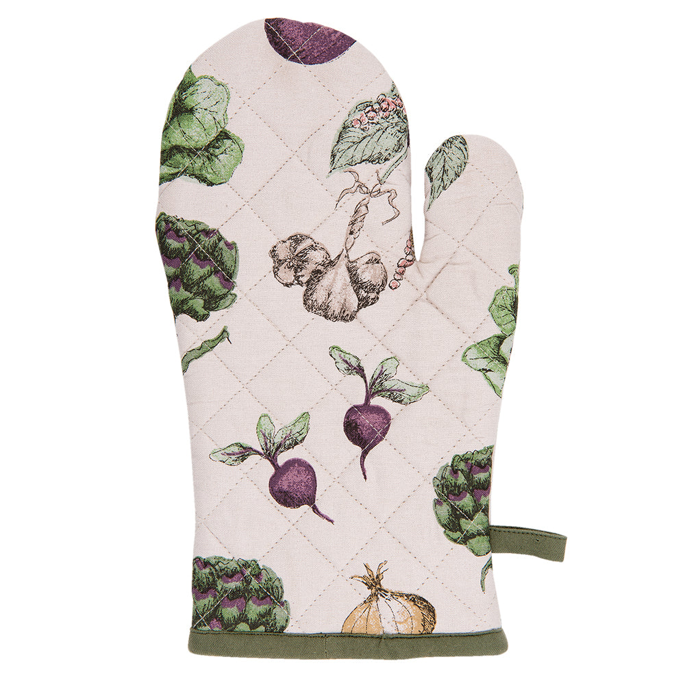 Deze stijlvolle ovenhandschoen van het merk Clayre & Eef met groente motief op een beige achtergrond met groene rand is mooi en praktisch tegelijk. De print in landelijke stijl met een romantische uitstraling geeft een gezellige en warme sfeer aan je keuken. De ovenwant is gemaakt van 100% katoen met een polyester vulling voor isolatie en is voorzien van een handig lusje om de ovenhandschoen op te hangen. De afmeting van de ovenwant is 16x30 cm, past mooi om jouw hand en geeft een goede grip. Staat mooi in jouw keuken, past binnen elk interieur en helpt jou veilig en makkelijk warme gerechten uit oven of magnetron te halen. Onze ovenwanten kunnen gewassen worden in de wasmachine. Deze Ovenhandschoenen komen uit de keukentextielserie The Kitchen Garden. In deze prachtige serie vind je ook bijpassende artikelen zoals tafelkleden, tafellakens, tafellopers, kussens, placemats, servetten, schorten, maar ook thee-en keukendoeken, pannenlappen en broodmanden. Met keukentextiel van Clayre & Eef wordt jouw keuken nog gezelliger!