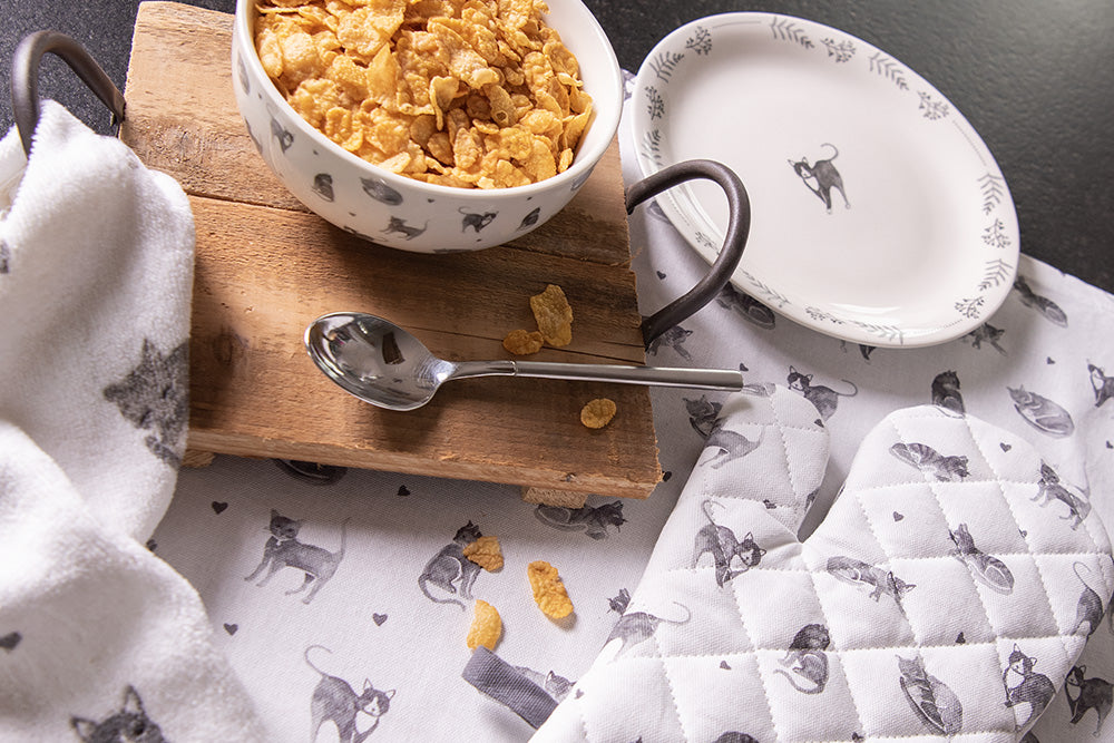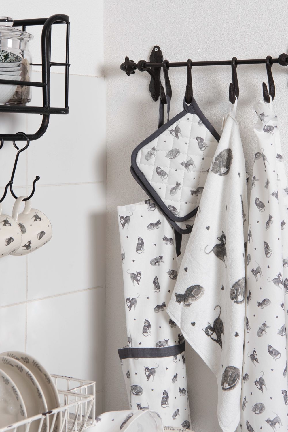 Wie er gek is op katten, kan niet meer om deze textielserie heen. De neutrale en rustige kleuren en het prachtige kattenpatroon, maakt deze serie tot een ideale toevoeging in de keuken. Het schort, de pannenlap, ovenwant en keukendoek zijn voorzien van een all-over patroon met een grijze bies. Het aanvullende servies zet ook op tafel het kattenthema voort. Maak het kattenfestijn compleet met borden, mokken en kommen in hetzelfde patroon. Een onmisbare aanvulling op tafel. Ovenwant Ovenhandschoen