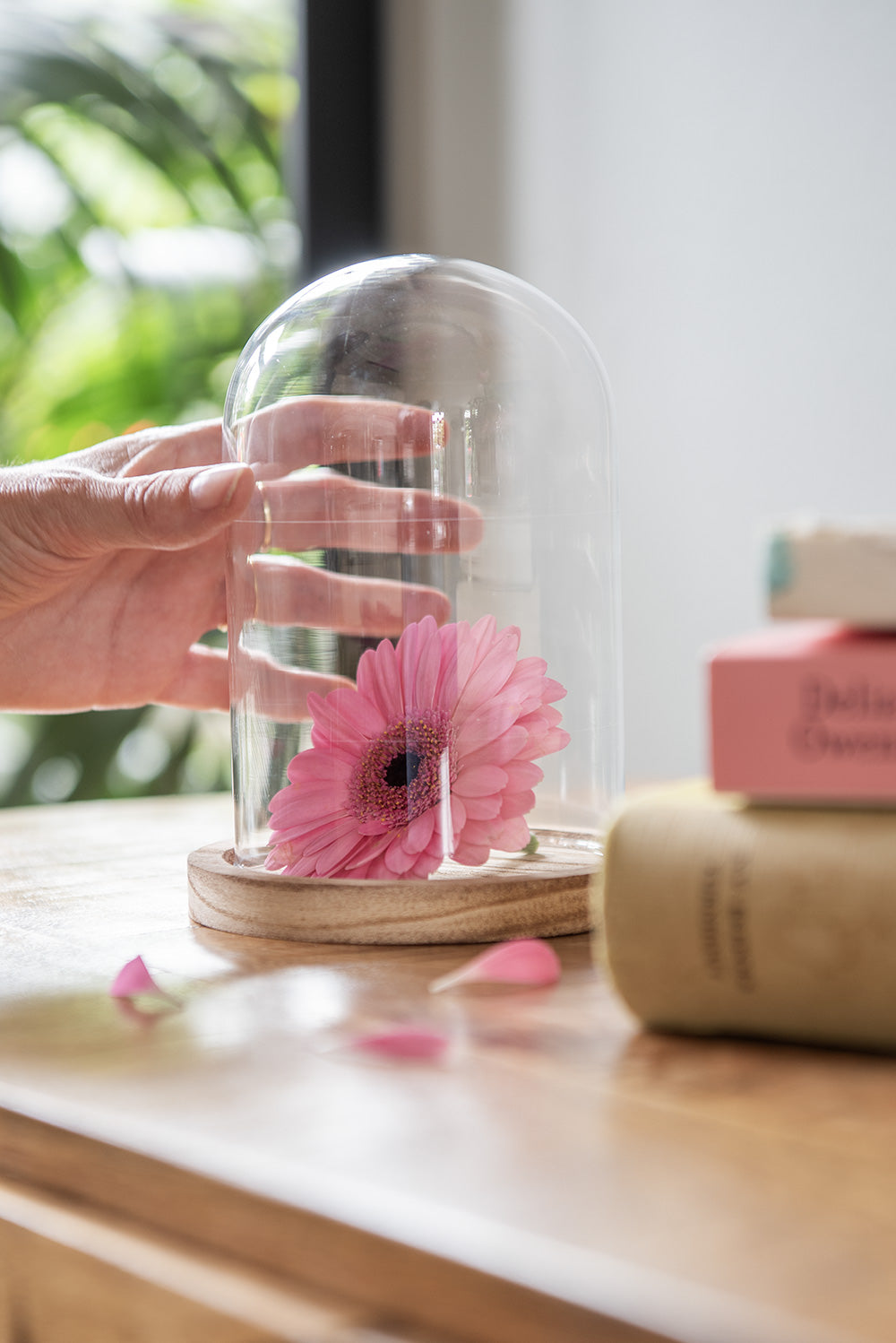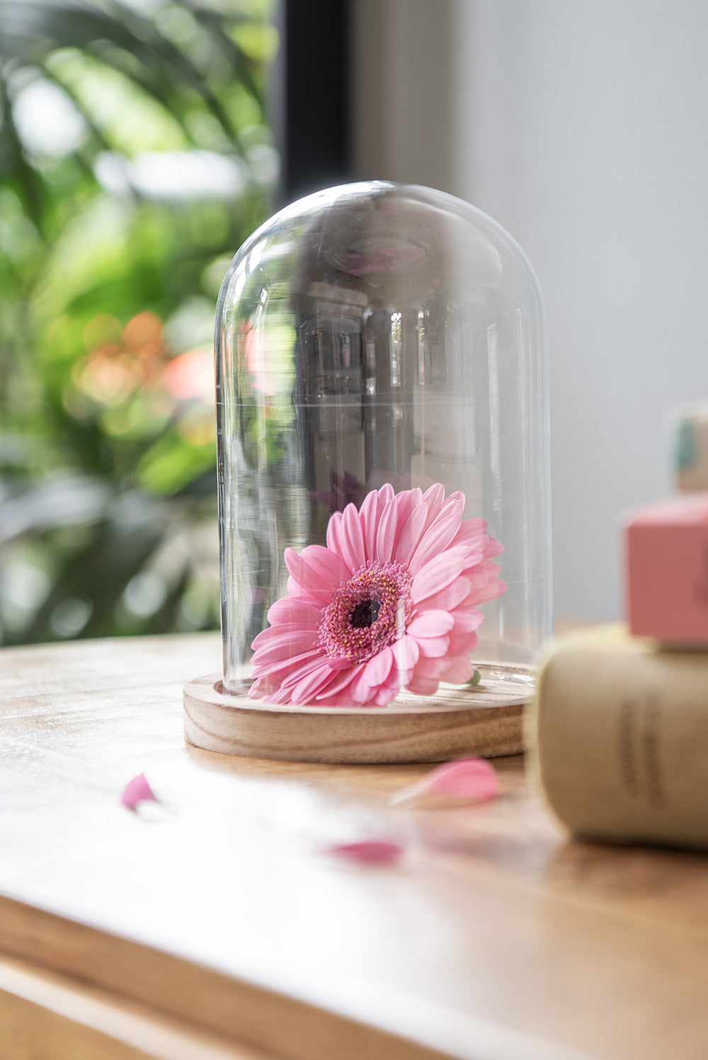 HOUTEN BASIS: De basis van de stolp is gemaakt van MDF of hout. Het heeft groeven om de glazen pot in te passen, zodat deze niet kan verschuiven of wiebelen.