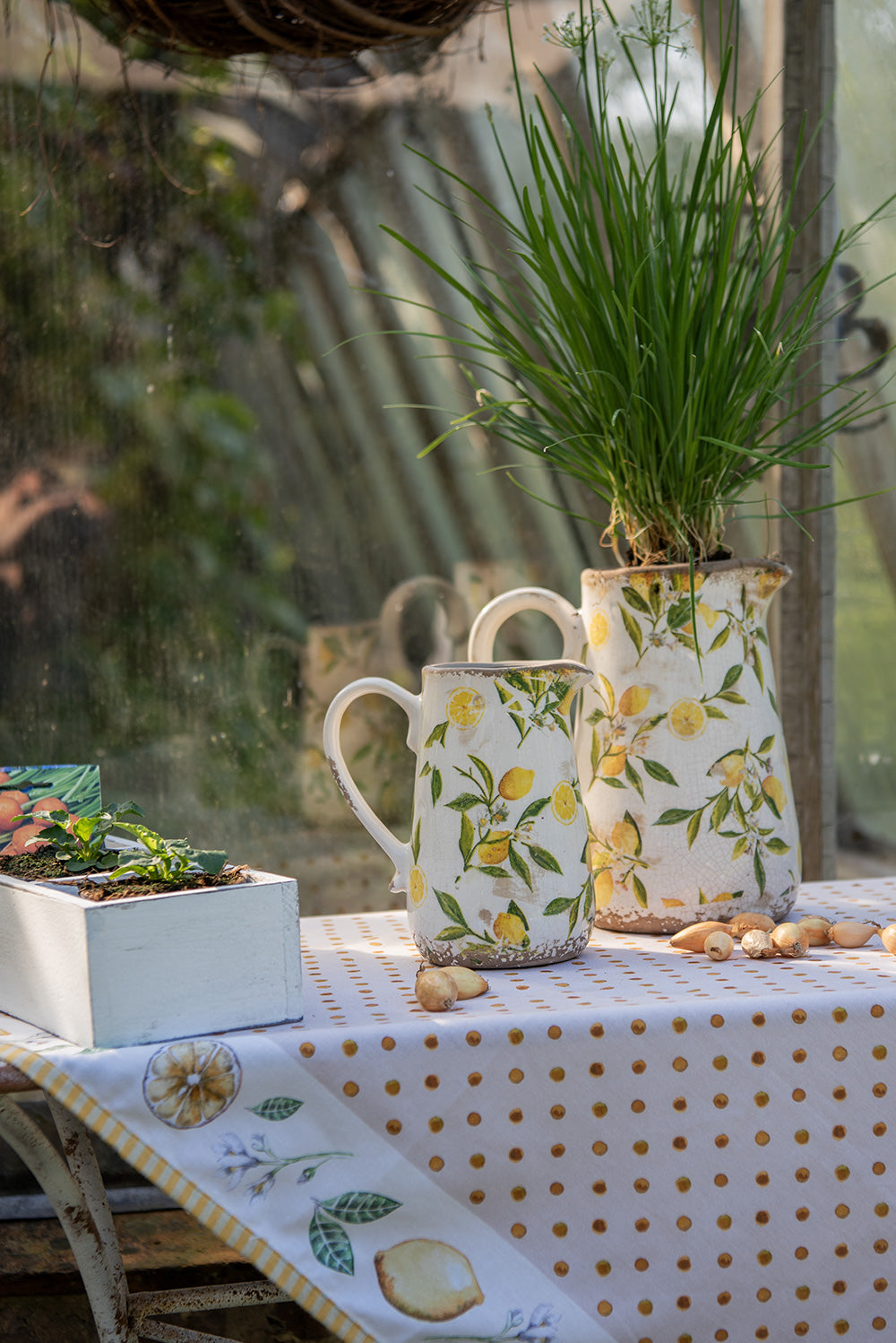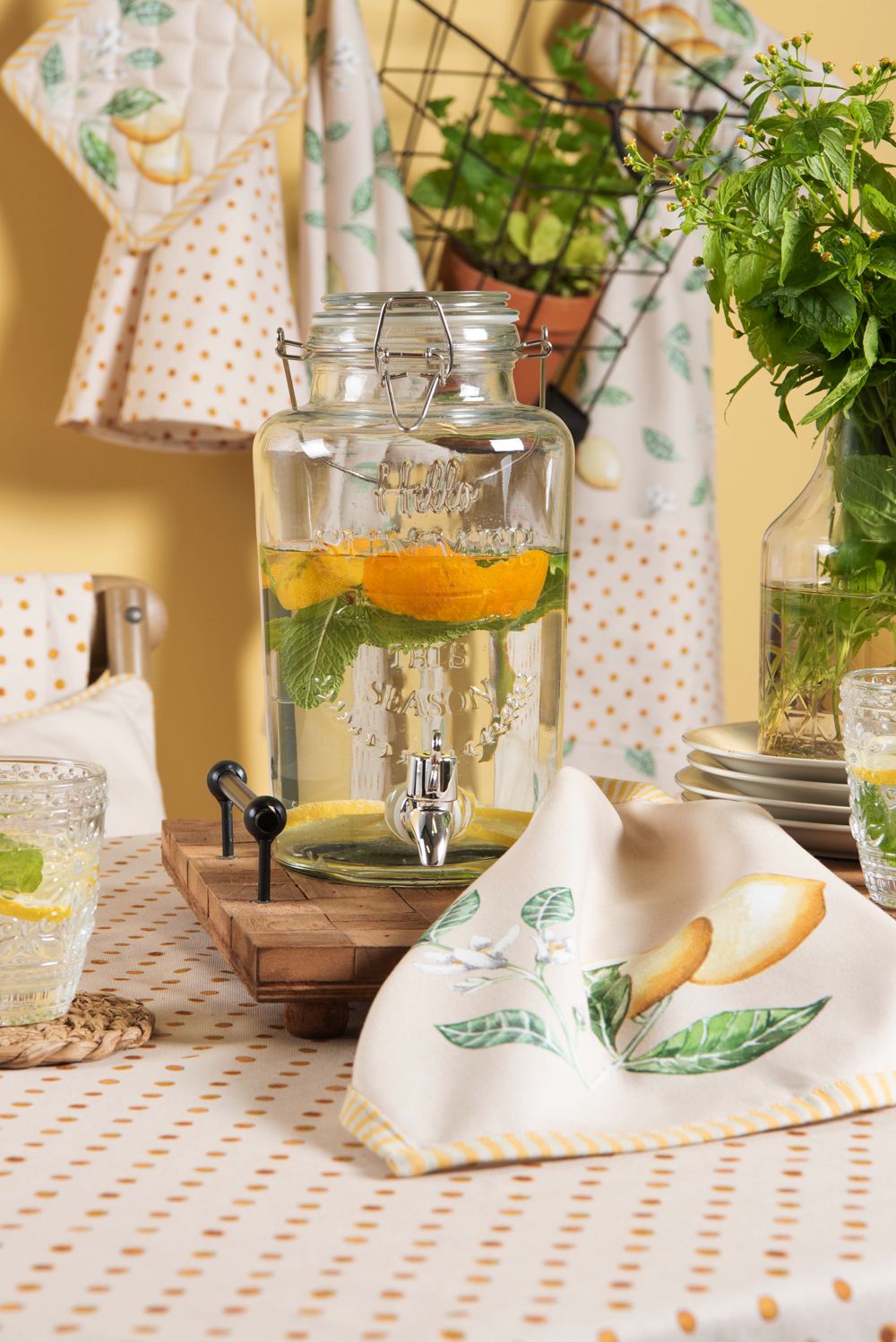 Op en top zomer! Met deze serie haal je meteen het zonnetje in huis. De mooi geïllustreerde afbeeldingen van de citroenen hebben met recht de hoofdrol in deze collectie. De kleurencombinatie van geel, wit en groen op een beige achtergrond is ‘a match made in heaven’. Deze collectie is zeer uitgebreid met items als tafelkleden, keukendoeken en keukenschorten. Maar ook ovenhandshoenen, pannenlappen en broodmandjes mogen zeker niet ontbreken. When life gives you lemons, make lemonade!