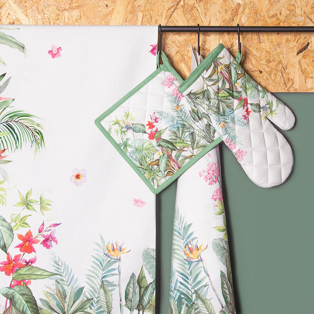 Deze serie zorgt voor een ontzettend fijn zomergevoel. De prachtige botanische prints in mooie heldere kleuren zijn al een waar object op zich. Een beeld schetsen met deze textielserie als hoofdelement is dan ook absoluut geen straf. Of je nu kiest voor een tafelkleed of tafelloper, beide opties vormen een perfecte basis voor een gedekte tafel in tropische sferen. De bijpassende sierkussens voegen niet alleen nòg meer sfeer, maar ook comfort toe. In de keuken zullen de mooi vormgegeven schorten en keukendoeken tevens zorgen voor een ware kleuren boost. Deze Jungle Botanics textielserie zorgt gegarandeerd voor heerlijk lang natafelen tijdens warme zomeravonden.
