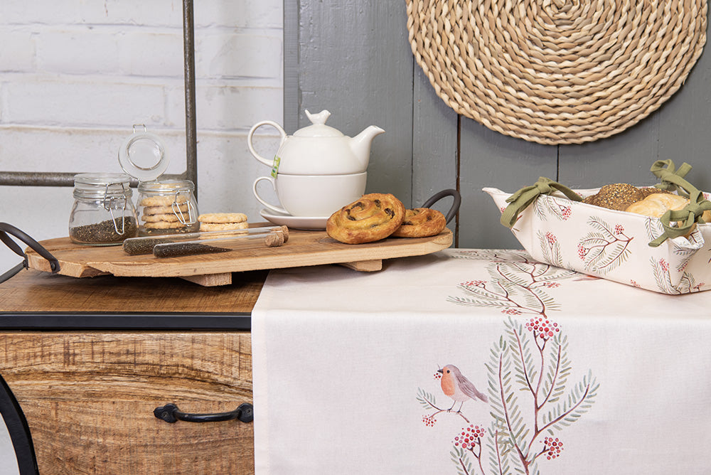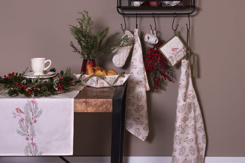 De mooie elementen van het najaar staan centraal in deze collectie. Denk aan rode besjes en groenblijvende dennentakken die mooi combineren met de kleuren van het roodborstje. De offwhite ondergrond in deze serie zorgen voor een vleugje vintage. Creëer een rustige en sfeervolle sfeer op tafel met mooi vormgegeven tafellopers en broodmandjes. In de keuken kan deze sfeer uitgebreid worden met keukenschorten, pannenlappen, keukendoeken en ovenhandschoenen. Robins appear when loved ones are nearby…