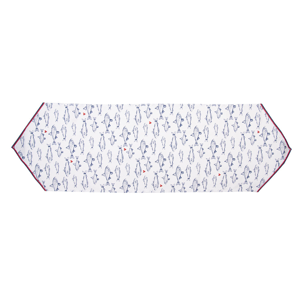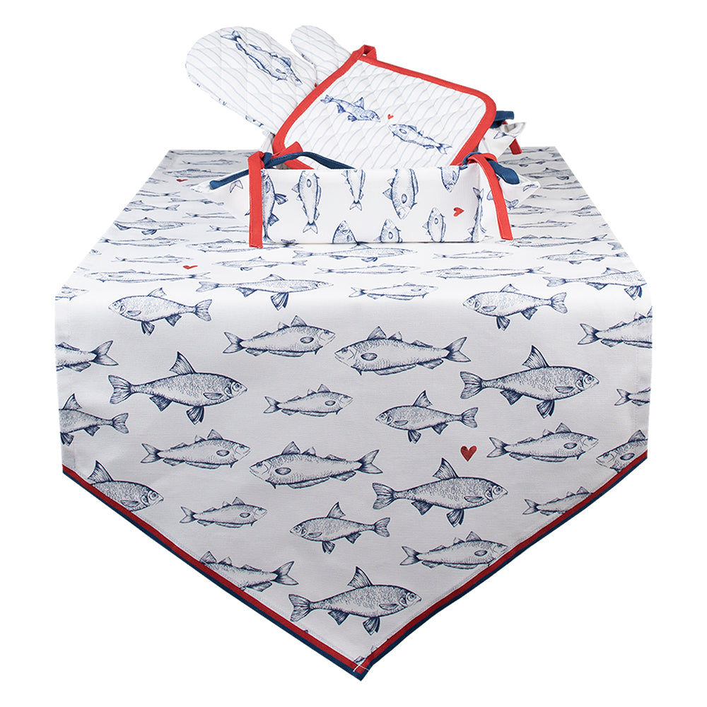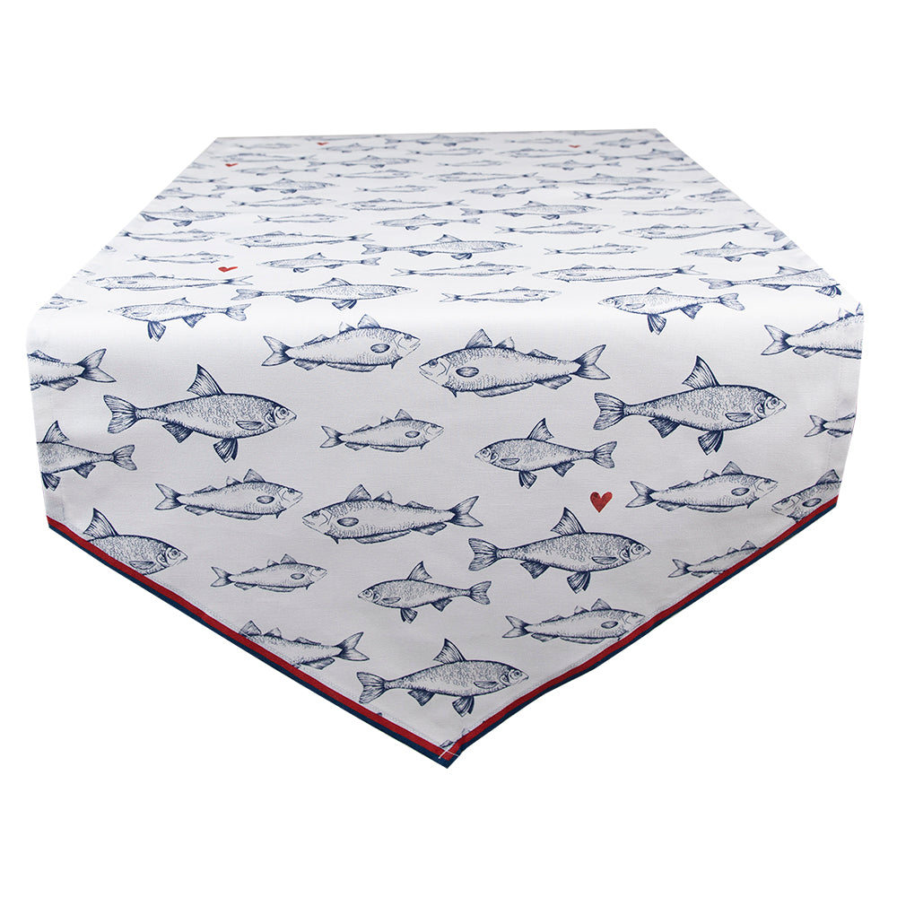 Clayre & Eef Tafelloper 50x160 cm Wit Blauw Katoen Vissen Tafelkleed