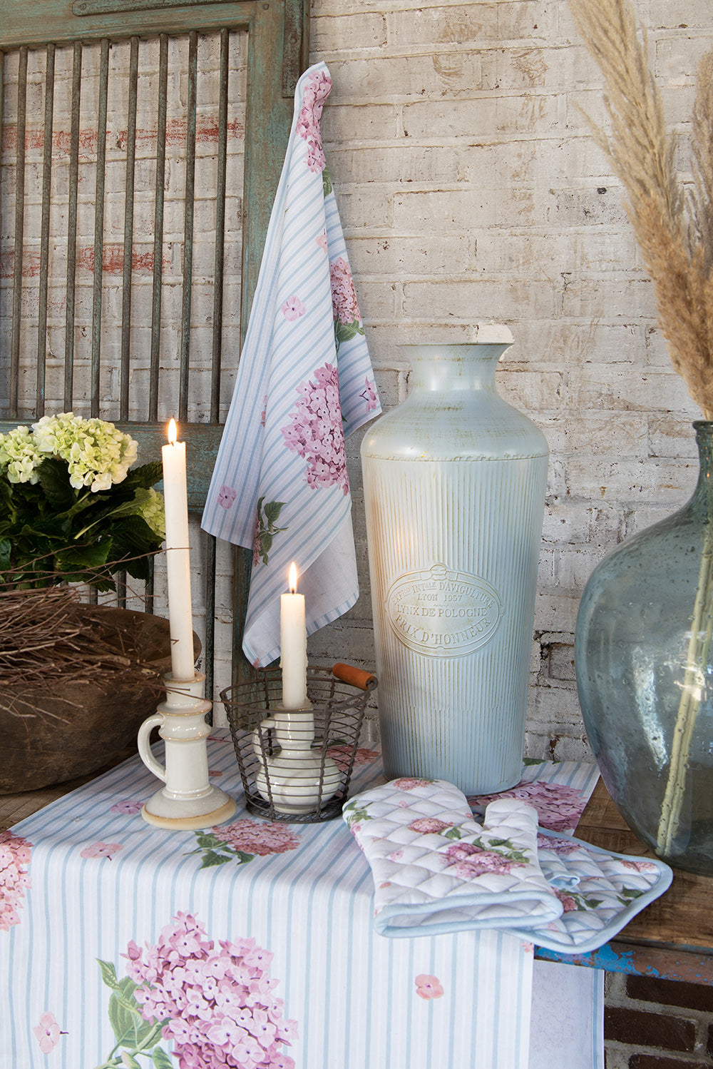 Wie aan de zomer denkt, denkt aan bloeiende hortensia’s. Deze textielserie staat helemaal in het teken van deze zomerse bloem. De licht blauwe ondergrond vormt een frisse basis en het streeppatroon geeft deze serie tevens een klassieke knipoog. Het patroon met hortensia’s in roze kleuraccenten steelt als een ware eyecatcher de show. Dit uitgebreide textiel is – naast de variant voor volwassenen - tevens voorzien van een keukenschort, pannenlap en ovenhandschoen voor kinderen. Theedoek