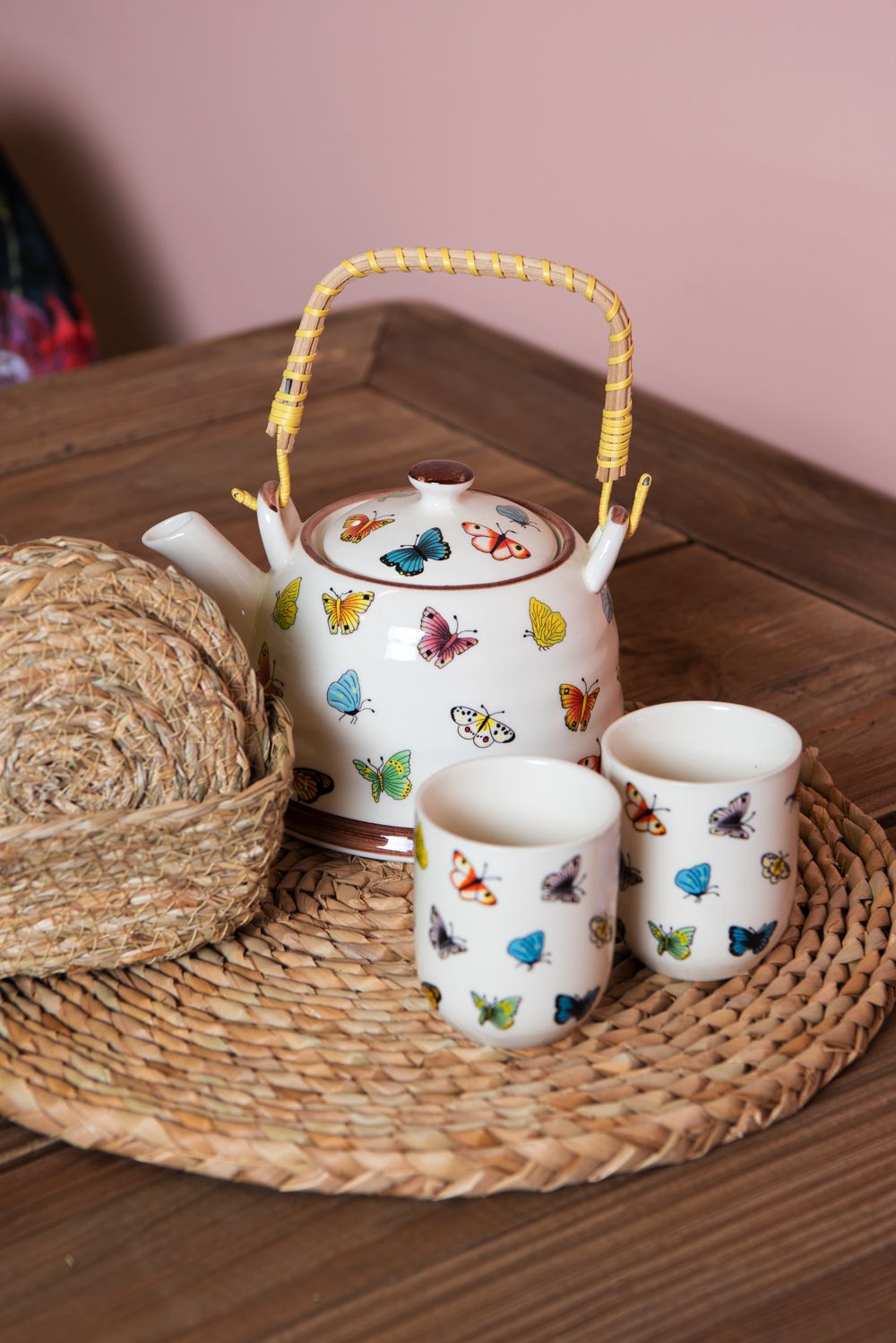 Clayre & Eef Theepot met Filter 700 ml Beige Geel Keramiek Vlinders