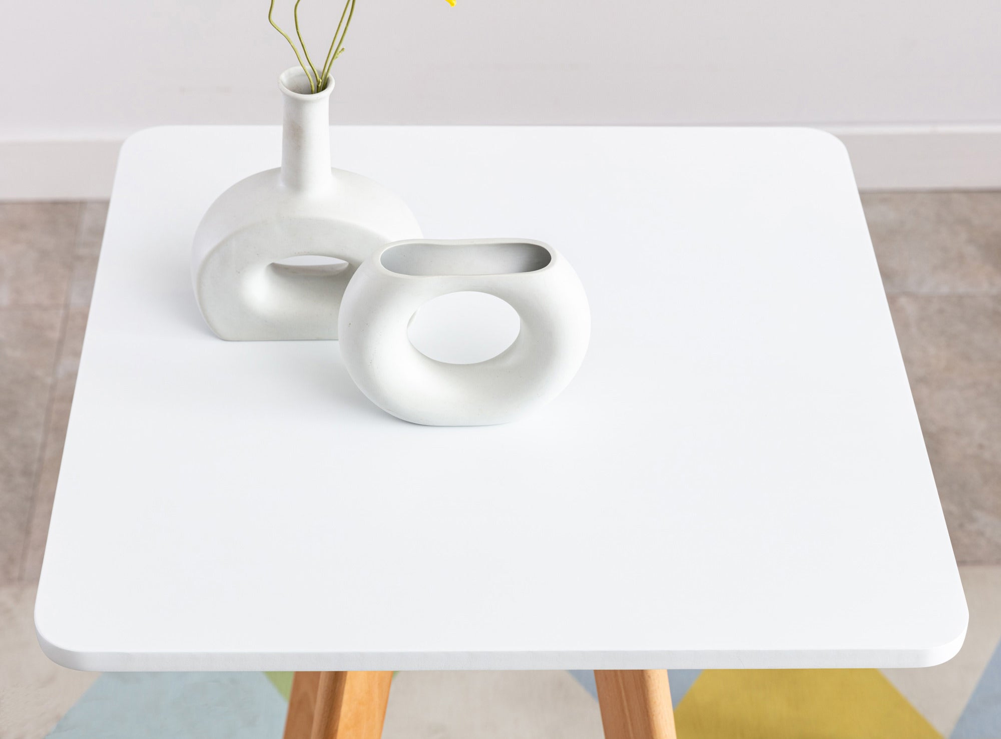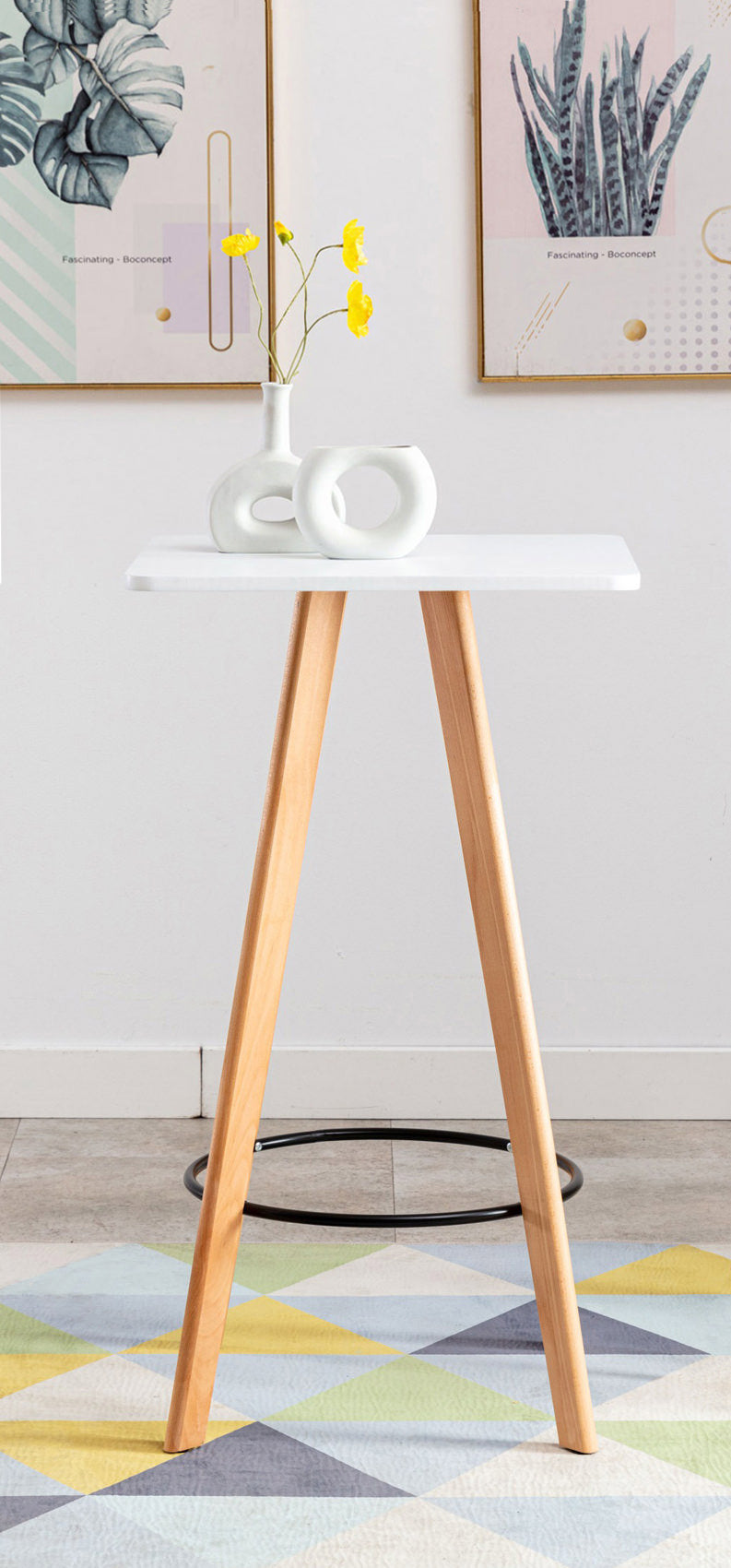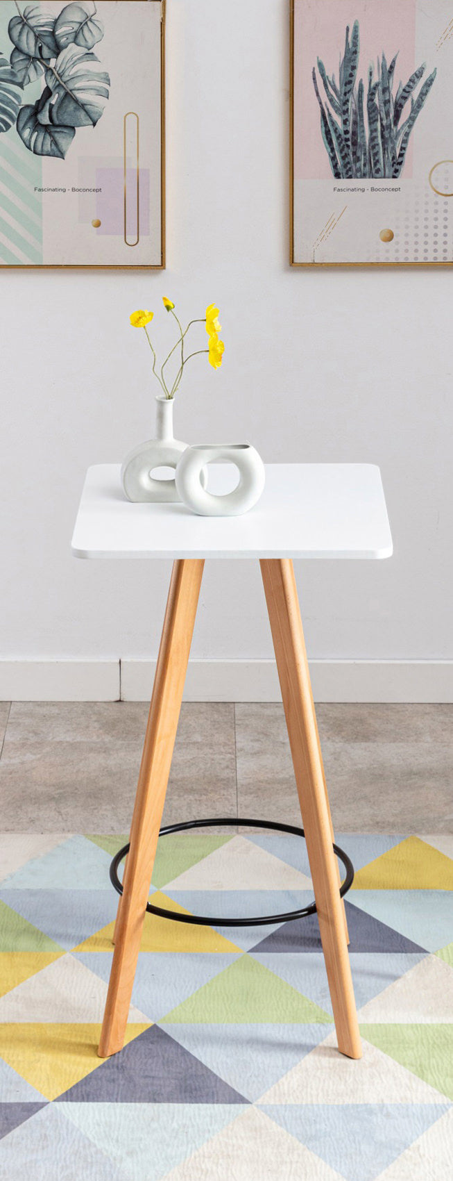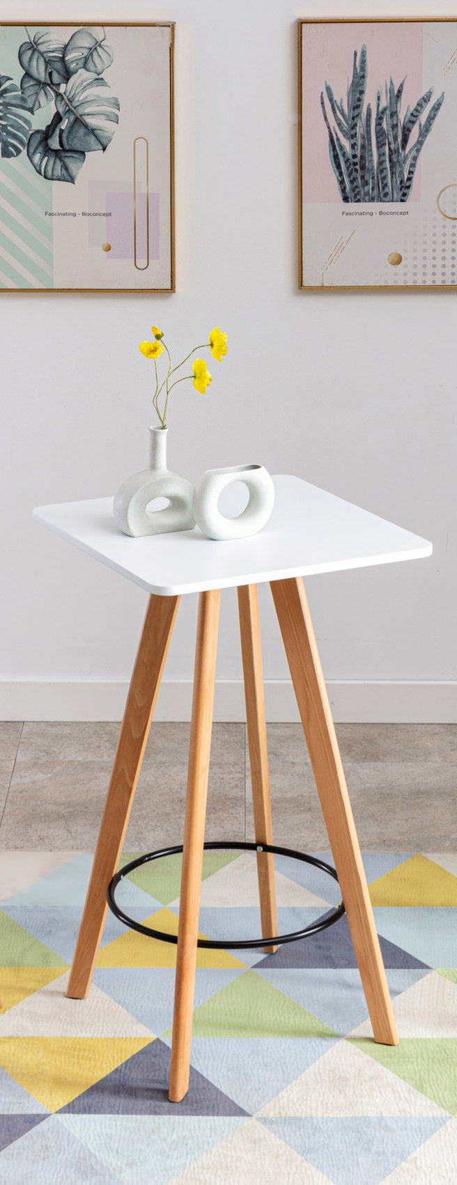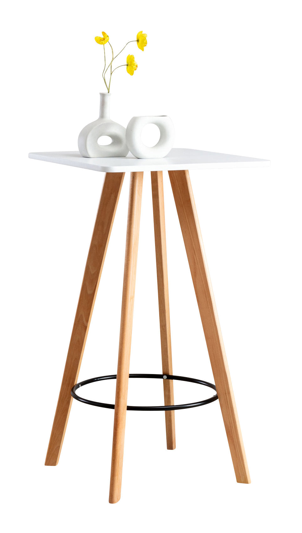 Met zijn uitlopende, conische poten creëert de vierkante statafel een vrolijke woonsfeer. Het vierkante tafelblad en het welgevormde frame zijn gemaakt van beukenhout, en de poten zijn bovendien voorzien van vloerbeschermers. Dit betekent dat deze tafel stabiel en zonder aarzeling op elke vloerbedekking kan worden gebruikt. Dankzij het eenvoudige Scandinavische ontwerp past hij harmonieus in elke omgeving. Deze statafel is uitermate geschikt voor zowel privé als zakelijk gebruik en zal overal een absolute blikvanger zijn. Het eenvoudige onderstel biedt naast een stevige stand ook een praktische voetsteun.
