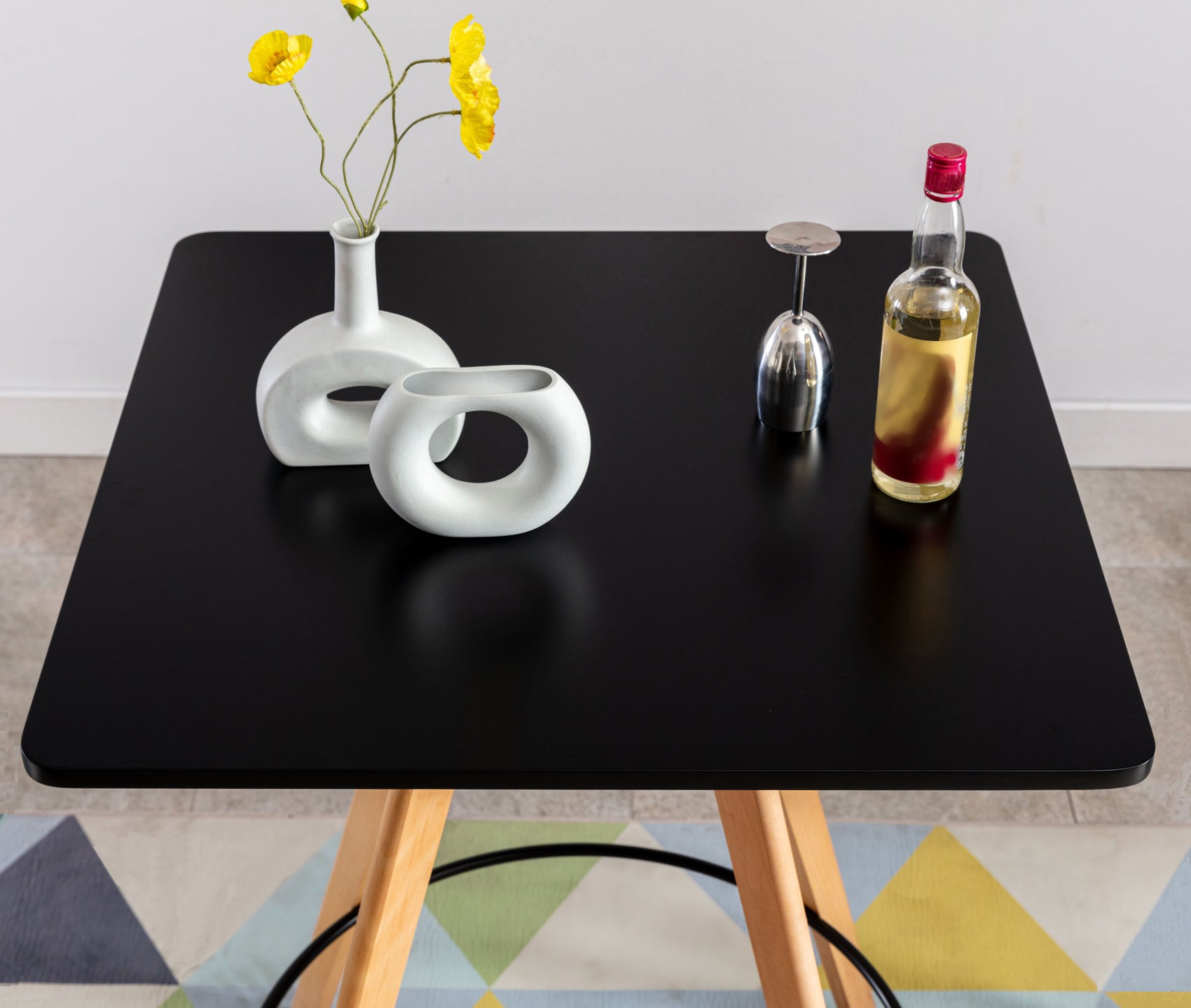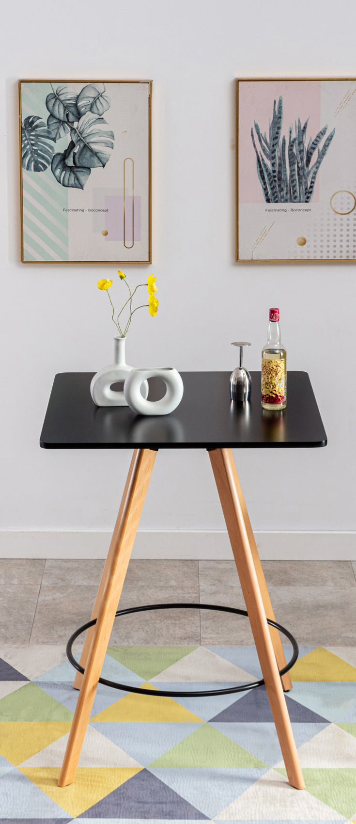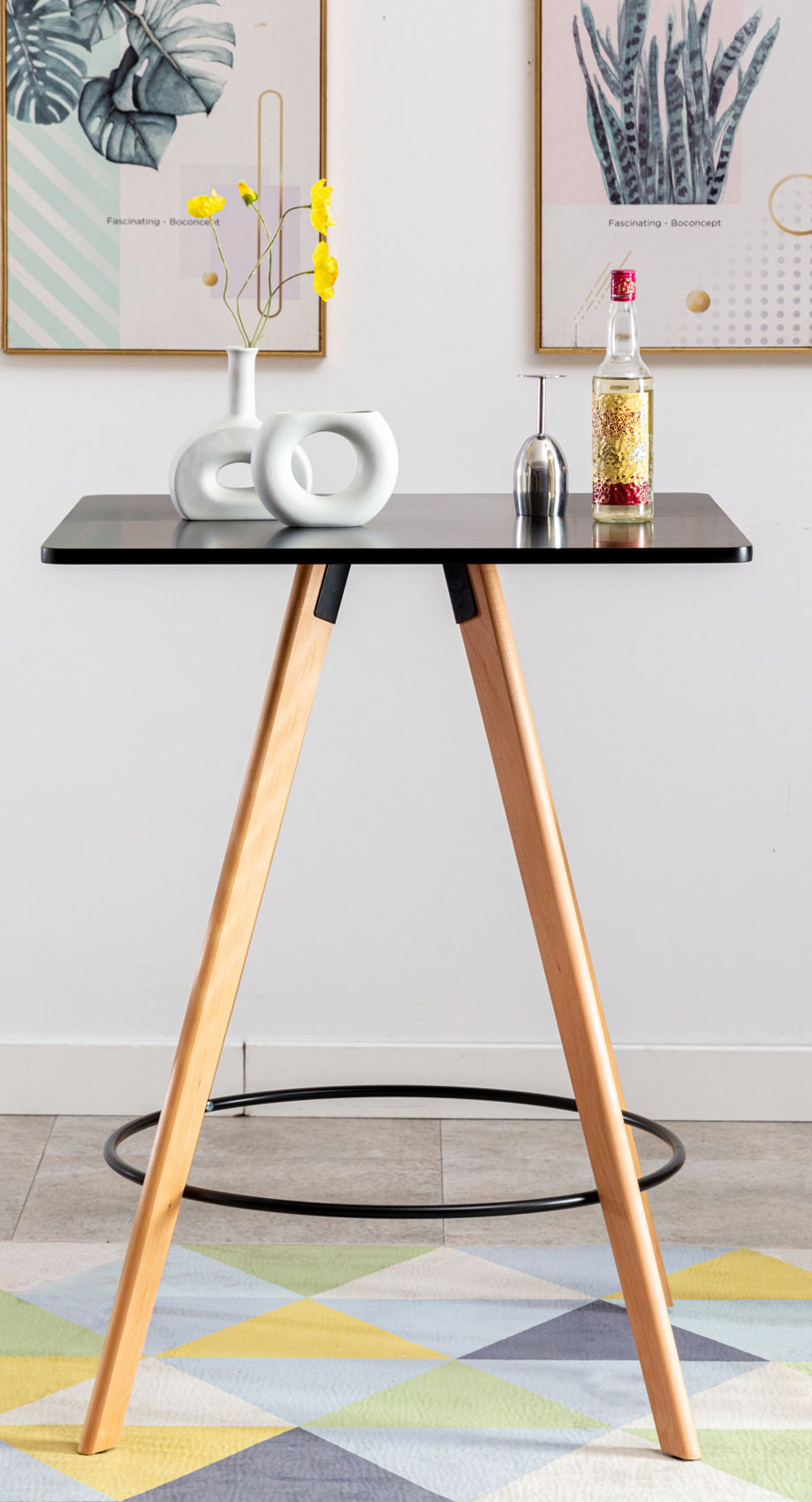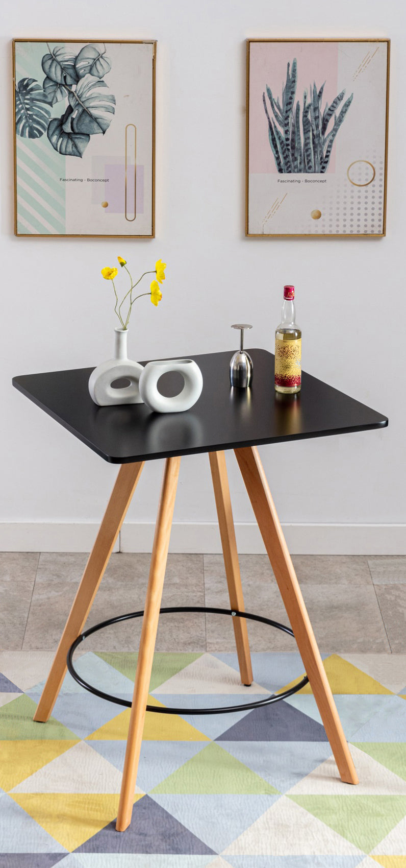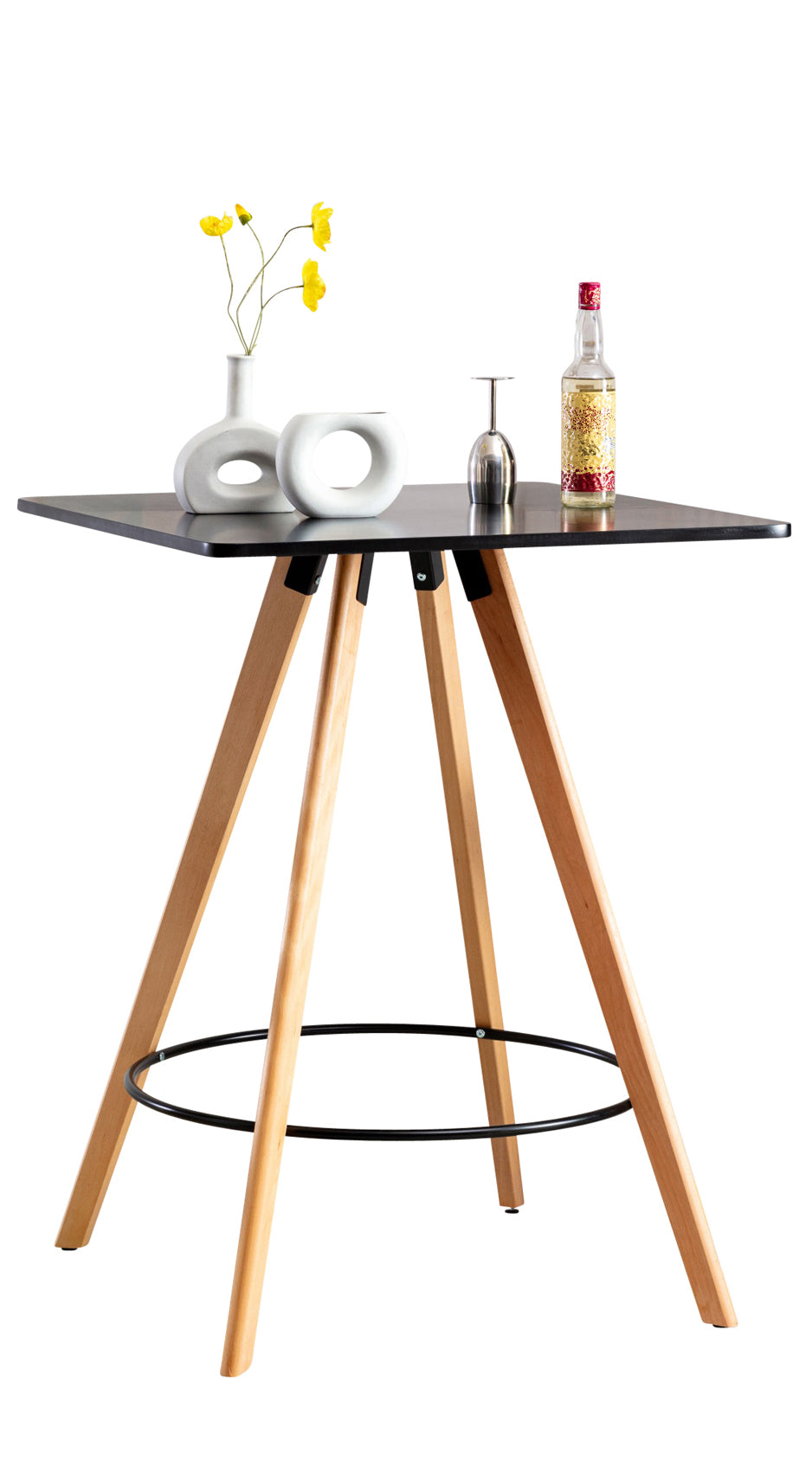 Met zijn uitlopende, conische poten creëert de vierkante bartafel een vrolijke woonsfeer. Het vierkante tafelblad en het welgevormde frame zijn gemaakt van beukenhout, en de poten zijn bovendien voorzien van vloerbeschermers. Zo kan deze tafel zonder aarzelen stabiel worden gebruikt op elke ondergrond. Dankzij het eenvoudige Scandinavische ontwerp past hij harmonieus in elke omgeving. Deze tafel is bij uitstek geschikt voor zowel privé als zakelijk gebruik en zal overal een absolute blikvanger zijn. Het eenvoudige onderstel biedt naast een stevige stand ook een praktische voetsteun.
