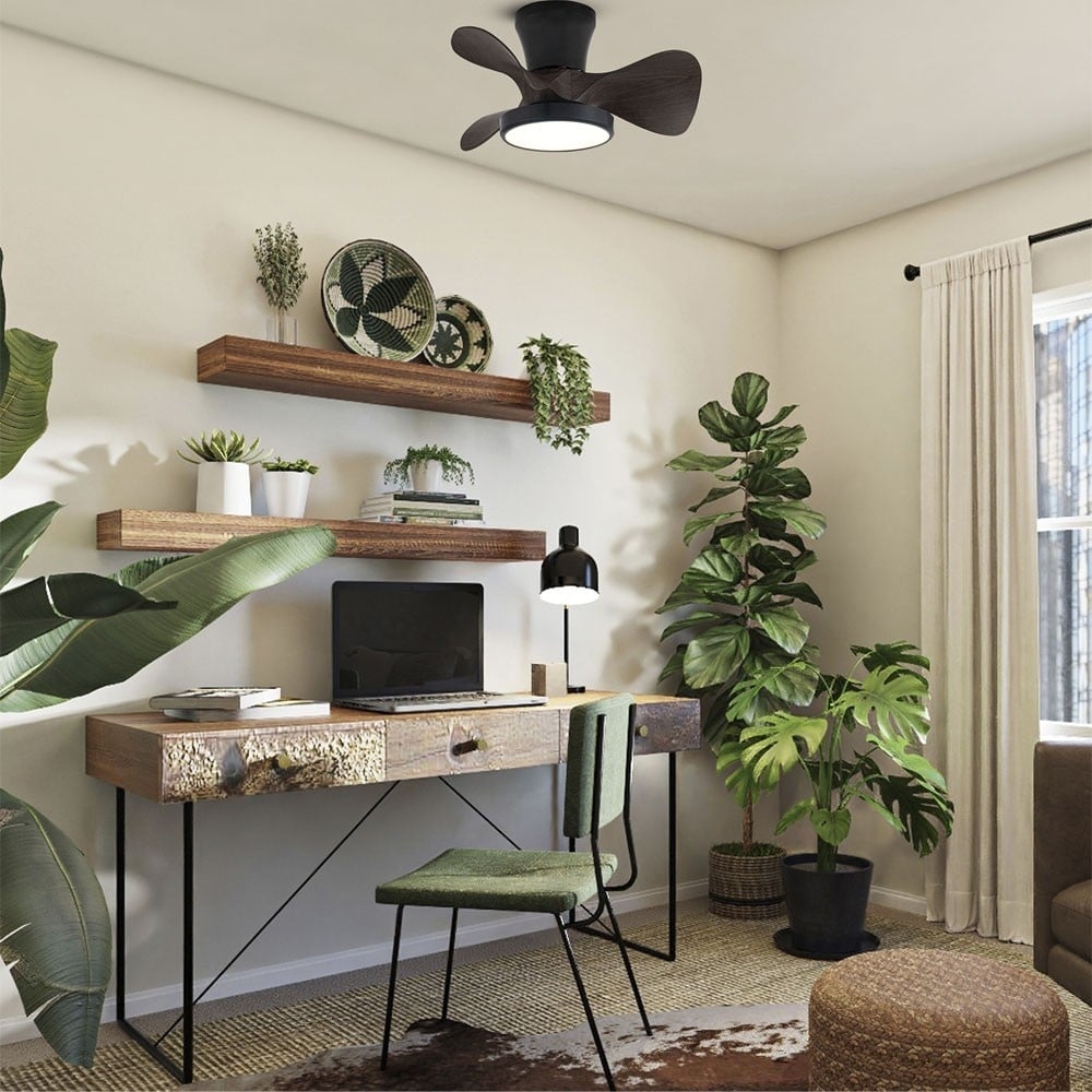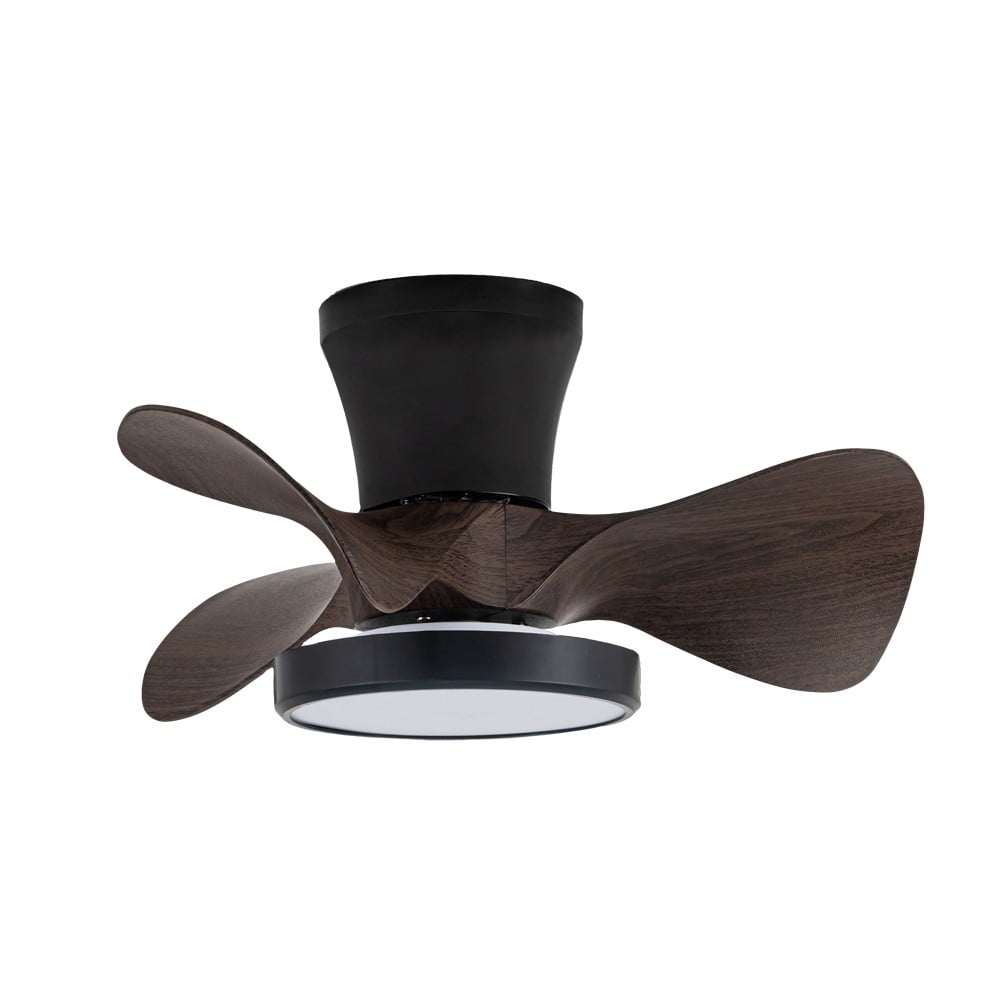 Schattige en knuffelbare mini-ventilator perfect voor kleine ruimtes tot ongeveer 13m², zoals slaapkamers of compacte woonkamers. Met een diameter van 56 cm en een hoogte van 23,5 cm is deze zwarte metalen ventilator uitgerust met drie kunststof bladen met een donkere kleur hout motief. De bladen zijn dus niet gemaakt van echt hout.