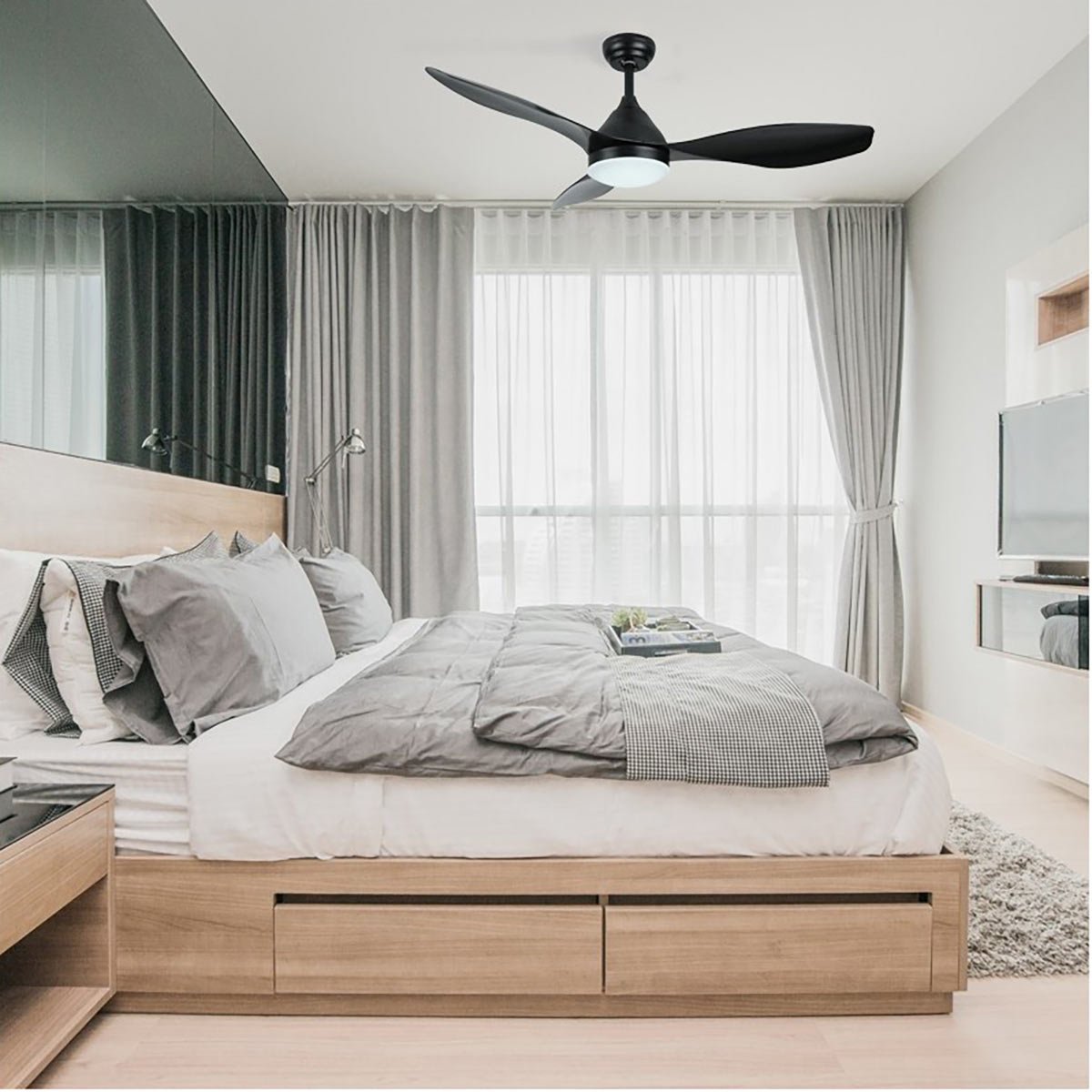 Met de bijgeleverde afstandsbediening heb je de controle over de ventilatorsnelheid met 6 verschillende niveaus, het in- en uitschakelen en dimmen van de lamp, en het instellen van de zomer- of wintermodus, waarbij de ventilator respectievelijk andersom draait. Bovendien biedt de LED-verlichting verschillende kleurtemperaturen, variërend van warm wit tot koel wit (3000 K / 4000 K / 6000 K), waardoor je verschillende sferen kunt creëren. De lamp heeft een kunststof wit kapje. Bovendien kun je met de timerfunctie de ventilator automatisch uitschakelen.