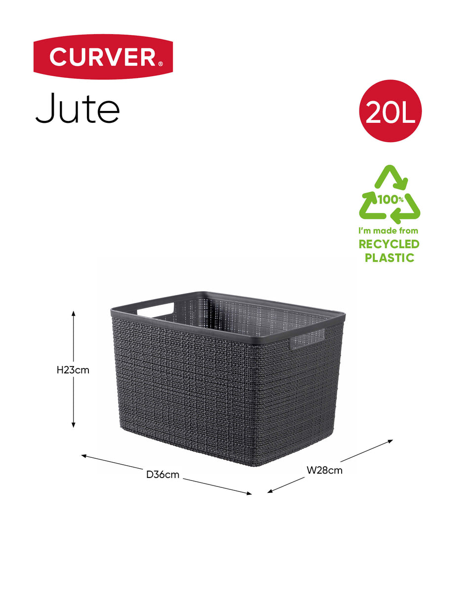 De stijlvolle en multifunctionele Curver Jute Mand L heeft een natuurlijke geweven look en feel die elk huis perfect complementeert. Stevig en veelzijdig is het de ideale oplossing voor het organizeren van allerlei spullen – van kleding in de kast, tot opgerolde handdoeken in de badkamer of magazines, kleden en speelgoed in de woonkamer. Comfortabele handvaten maken de producten gemakkelijk te dragen. De range is volledig nestbaar en dus ruimte-efficiënt en gemaakt van 100% gerecycled kunststof.