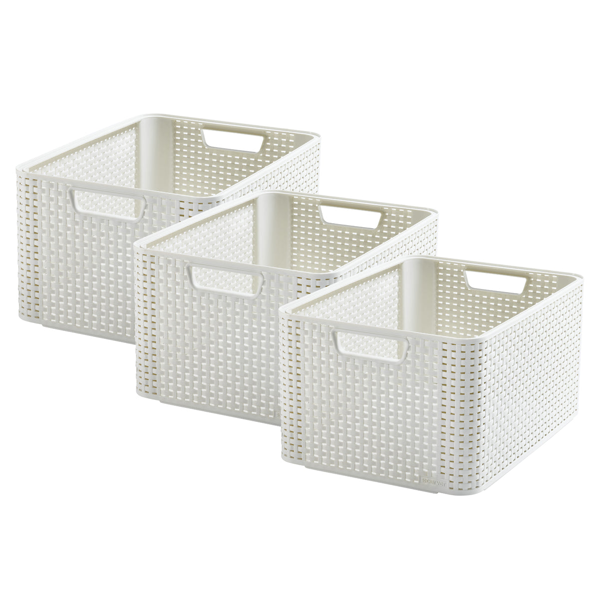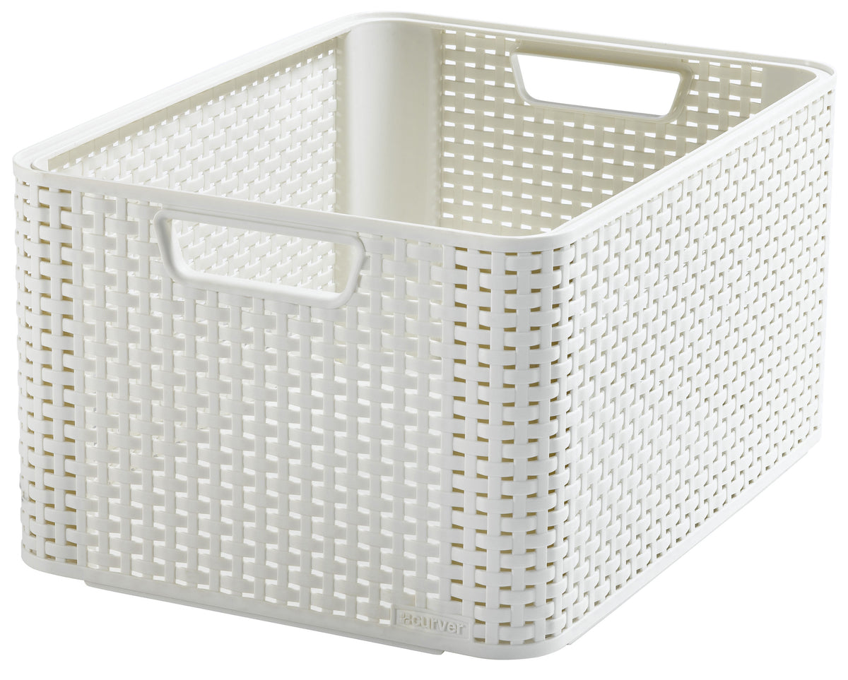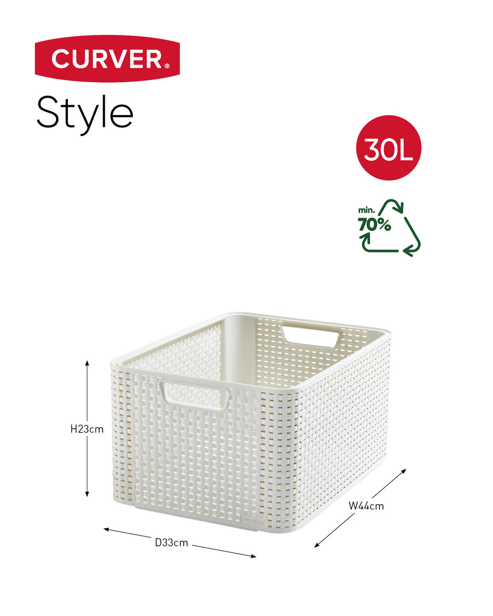 De Curver Style Opbergmanden zijn opbergproducten die gezien mogen worden. De mandjes zijn voorzien van een vlechtstructuur die lijkt op natuurlijke materialen. Ze hebben de uitstraling van riet maar de voordelen van kunststof: Eenvoudig te reinigen, goed te stapelen, voorzien van handgrepen en bestand tegen vocht. Ideaal voor gebruik in de badkamer, woonkamer, kinderkamer of op kantoor. Daarnaast is de opbergdoos gemaakt van minstens 70% gerecycled materiaal.