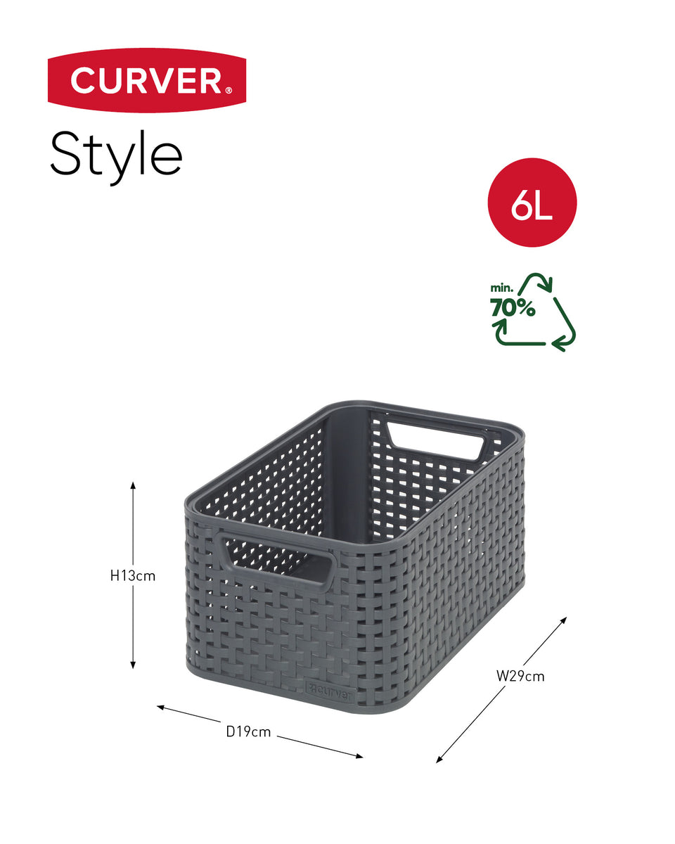 De Curver Style Opbergmanden zijn opbergproducten die gezien mogen worden. De mandjes zijn voorzien van een vlechtstructuur die lijkt op natuurlijke materialen. Ze hebben de uitstraling van riet maar de voordelen van kunststof: Eenvoudig te reinigen, goed te stapelen, voorzien van handgrepen en bestand tegen vocht. Ideaal voor gebruik in de badkamer, woonkamer, kinderkamer of op kantoor. Daarnaast is de opbergdoos gemaakt van minstens 70% gerecycled materiaal.