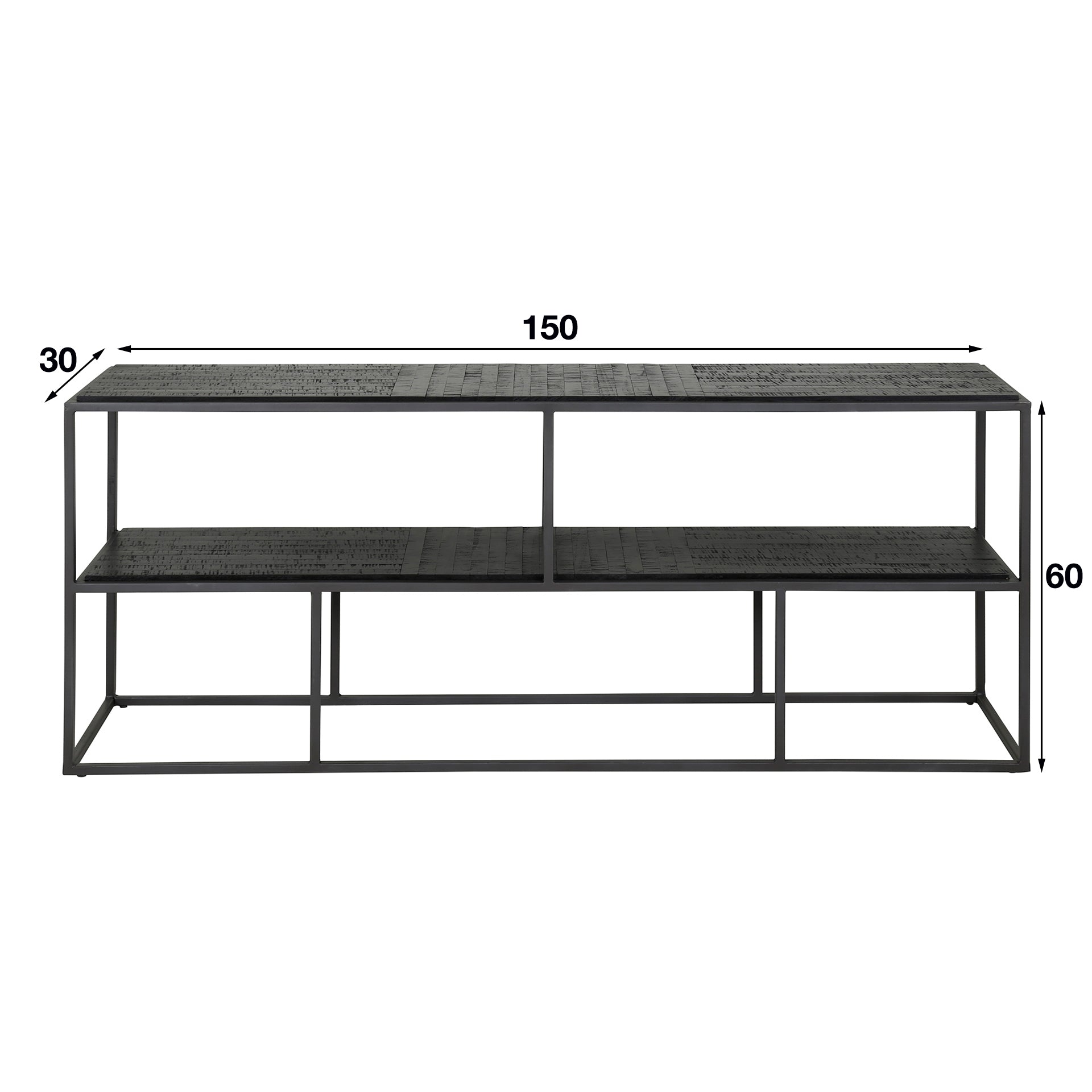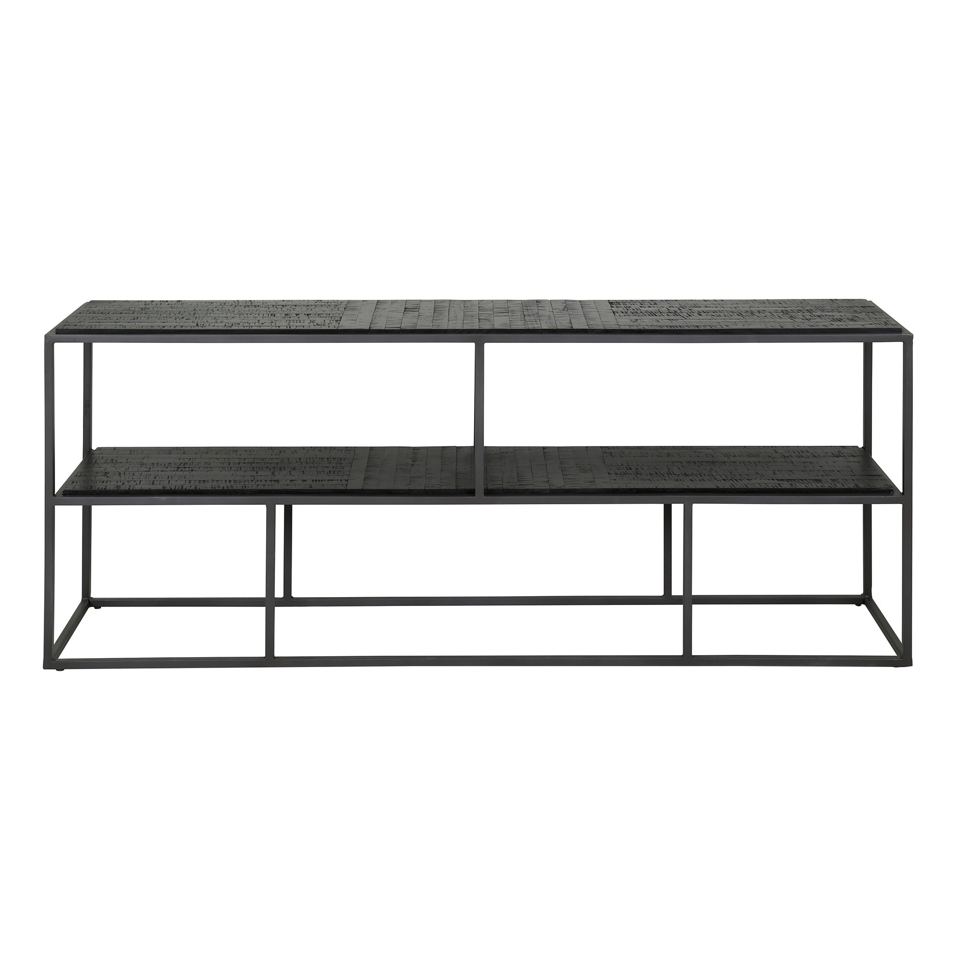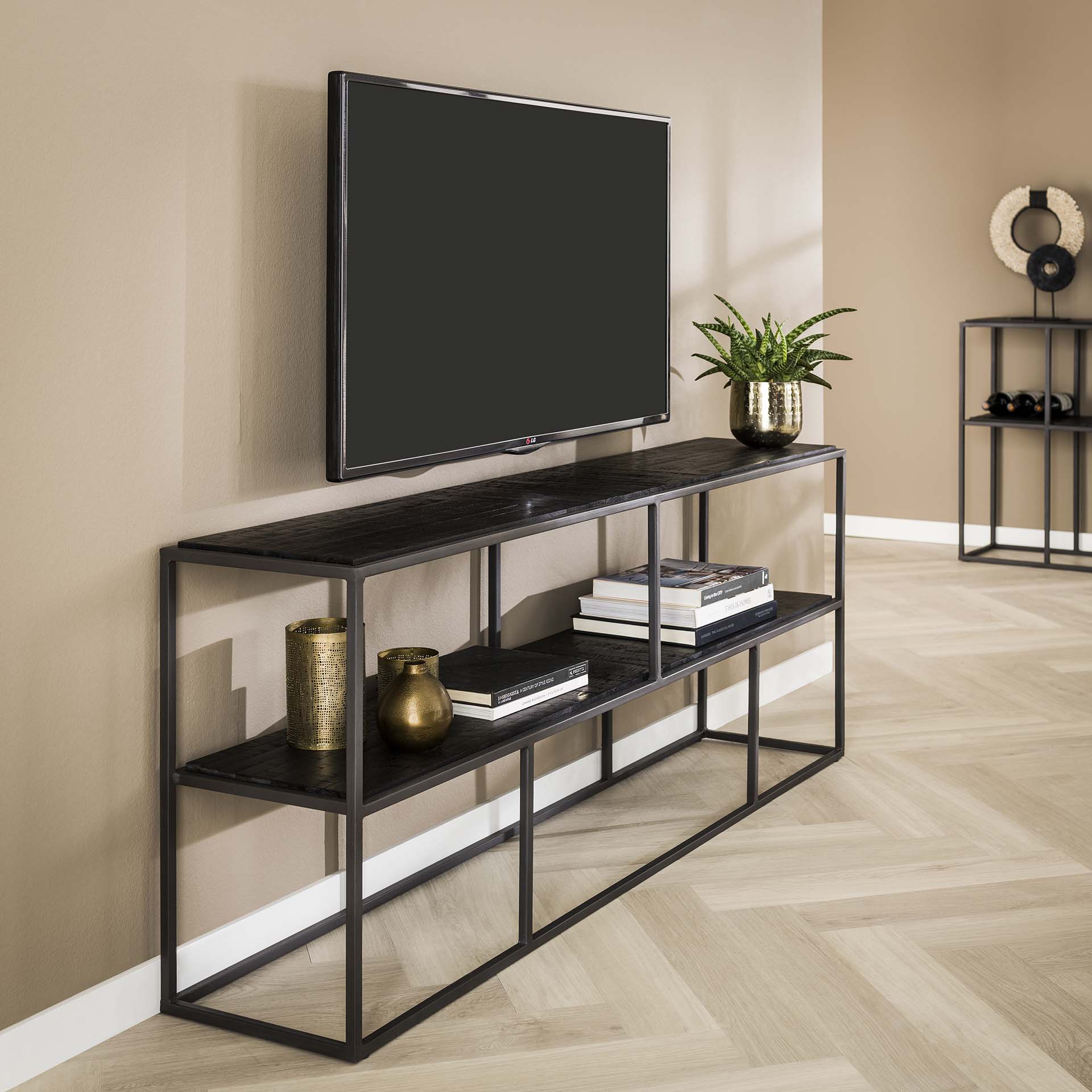 Dit TV-meubel "Teca black" is gemaakt van verweerd teakhout met een zwarte afwerking en een gun metal frame. Het TV-meubel is ingelegd met houten stroken wat een strak en sfeervol effect geeft. Het TV-meubel is wel geschikt tot een 58 inch televisie.