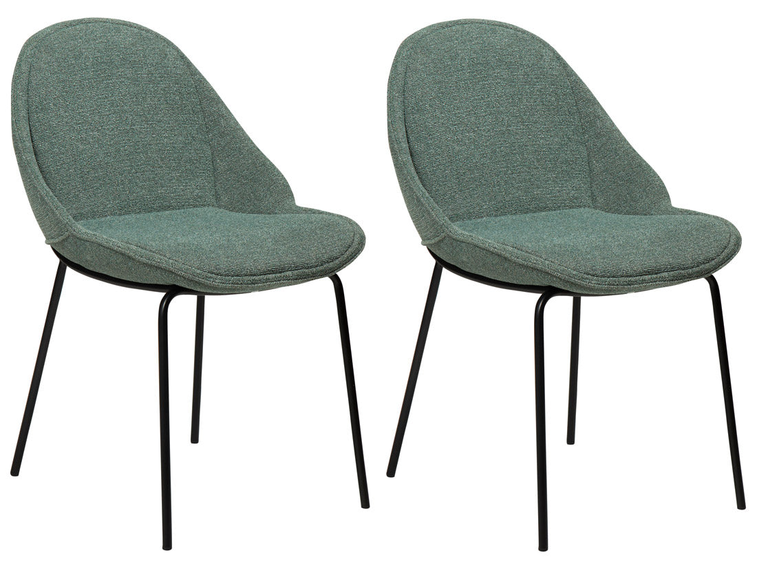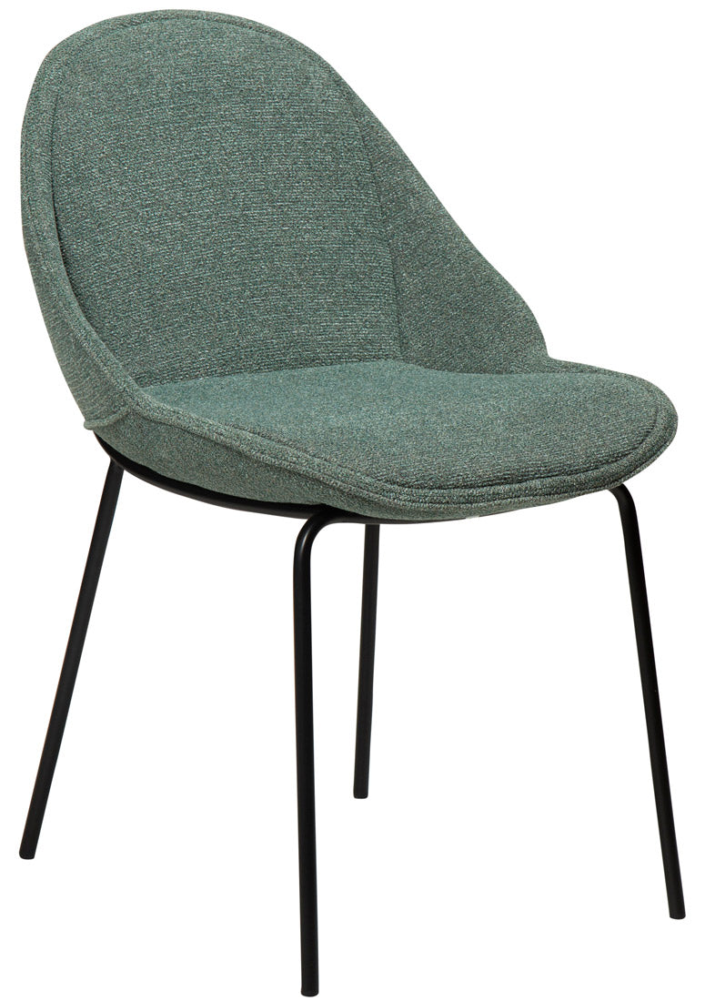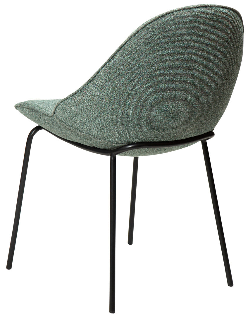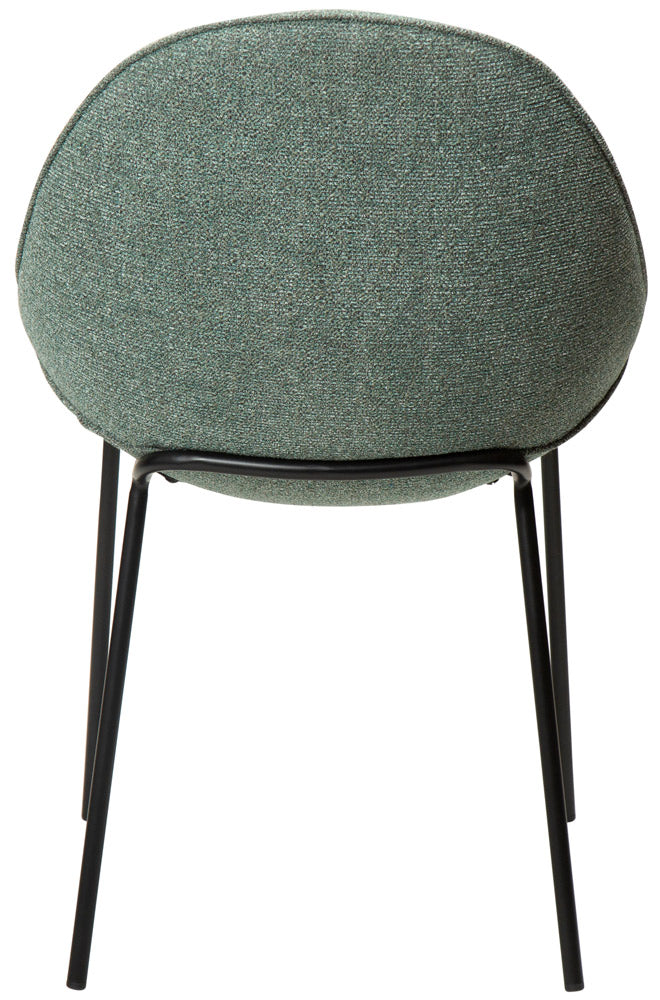 De Arch eetkamerstoel van Dan-Form kenmerkt zich door een artistiek design met ronde vormen Zo is de stoel voorzien van een groene bouclé stoffen kuipzitting met een ronde rugleuning en een ronde zitting Dat maakt de eetkamerstoel een stijlvolle en luxueuze verschijning De zitting van bouclé stof – dat een geweven stof is dat een oppervlakte heeft van lusjes – geeft een stoere uitstraling aan de stoel De slanke buispoten van zwart gepoedercoat metaal zijn direct verbonden aan de stoel en garanderen oo nog eens voor een moderne en funky touch