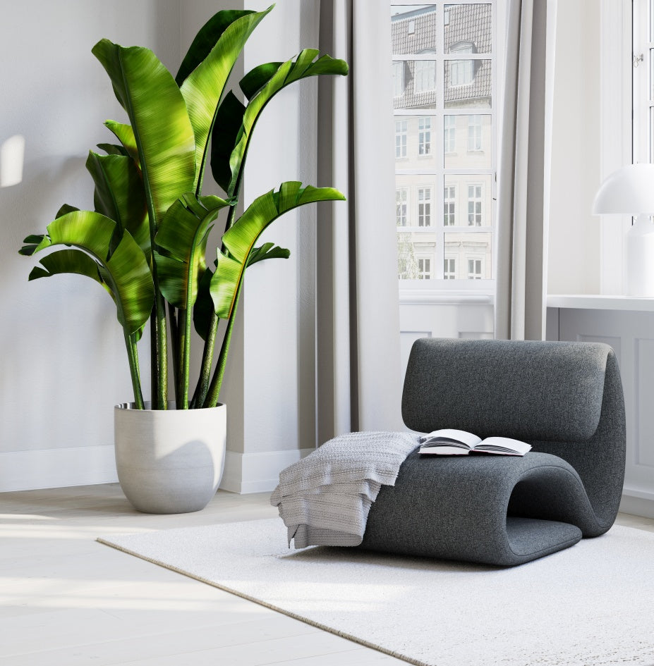 De Dubna fauteuil van het Deense merk Dan-Form is ook leverbaar in een grijze kleur