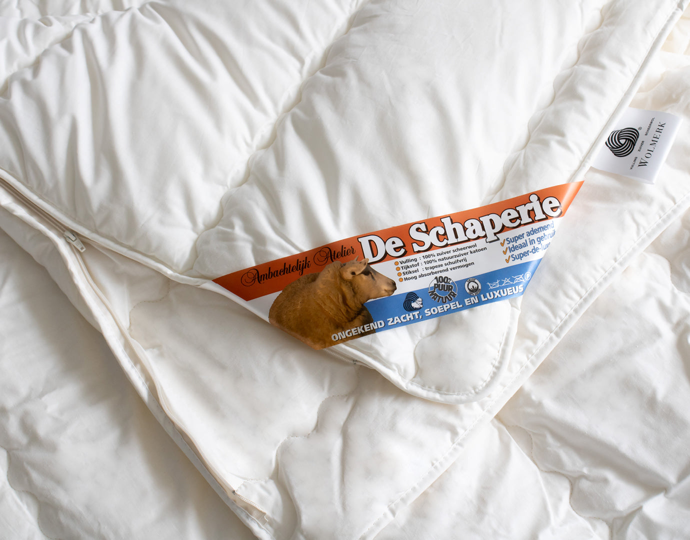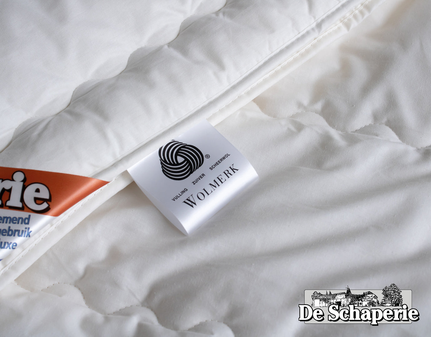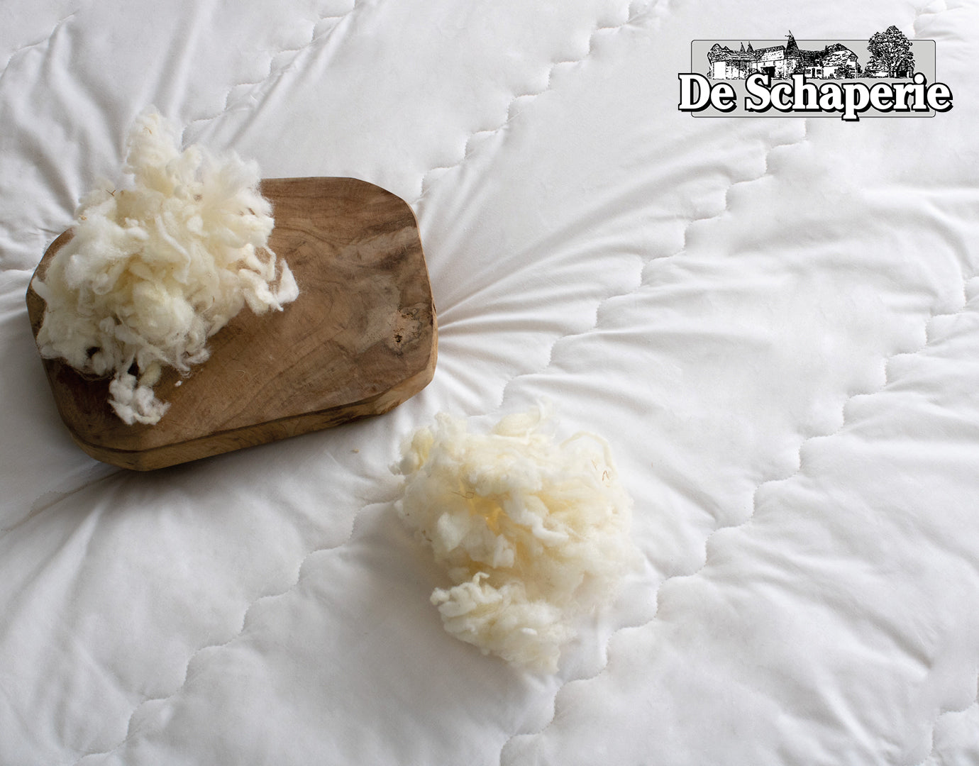 De Schaperie is een 100% zuiver scheerwollen 4-seizoenen dekbed. Puur natuurlijke wol verzorgt 'n perfect gespreide, behaaglijke warmte. Samen met het enorme absorptie en ventilatie vermogen garandeert dit een uiterst gezond en hygiënisch slaapklimaat. Bovendien bevat correct verwerkte wol 'n flinke dosis lanoline(wolvet), wat heilzaam werkt bij gevoelige en pijnlijke spieren en botten.
