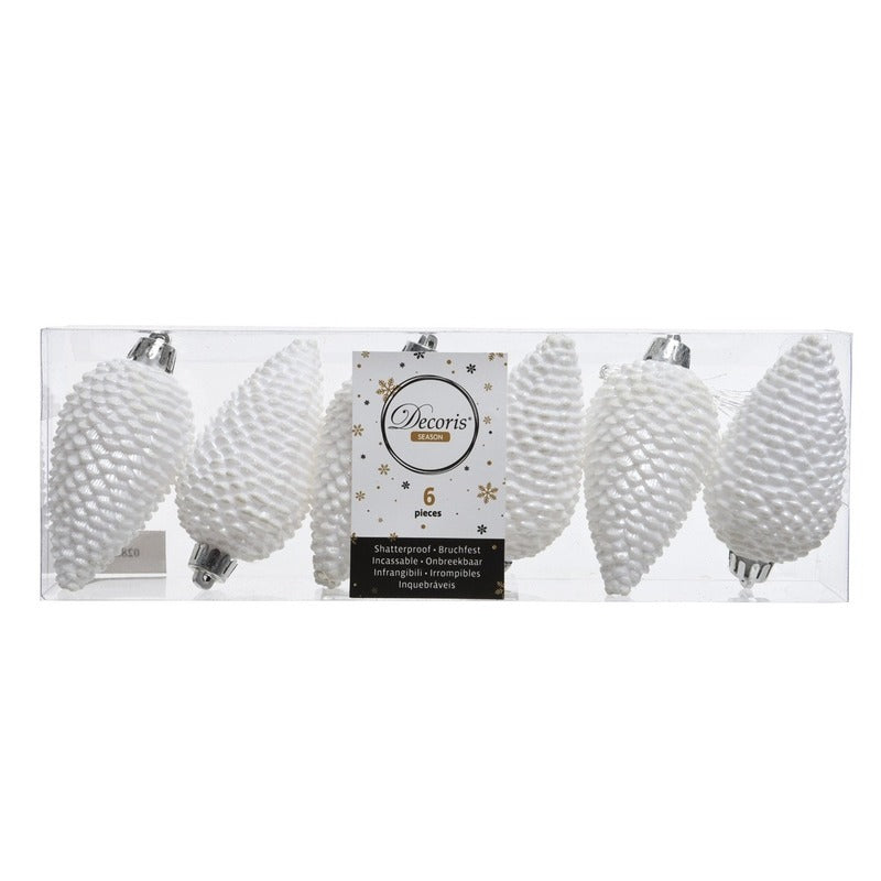 Decoris Kersthangers dennenappels - 6x - wit - glitter - 8 cm