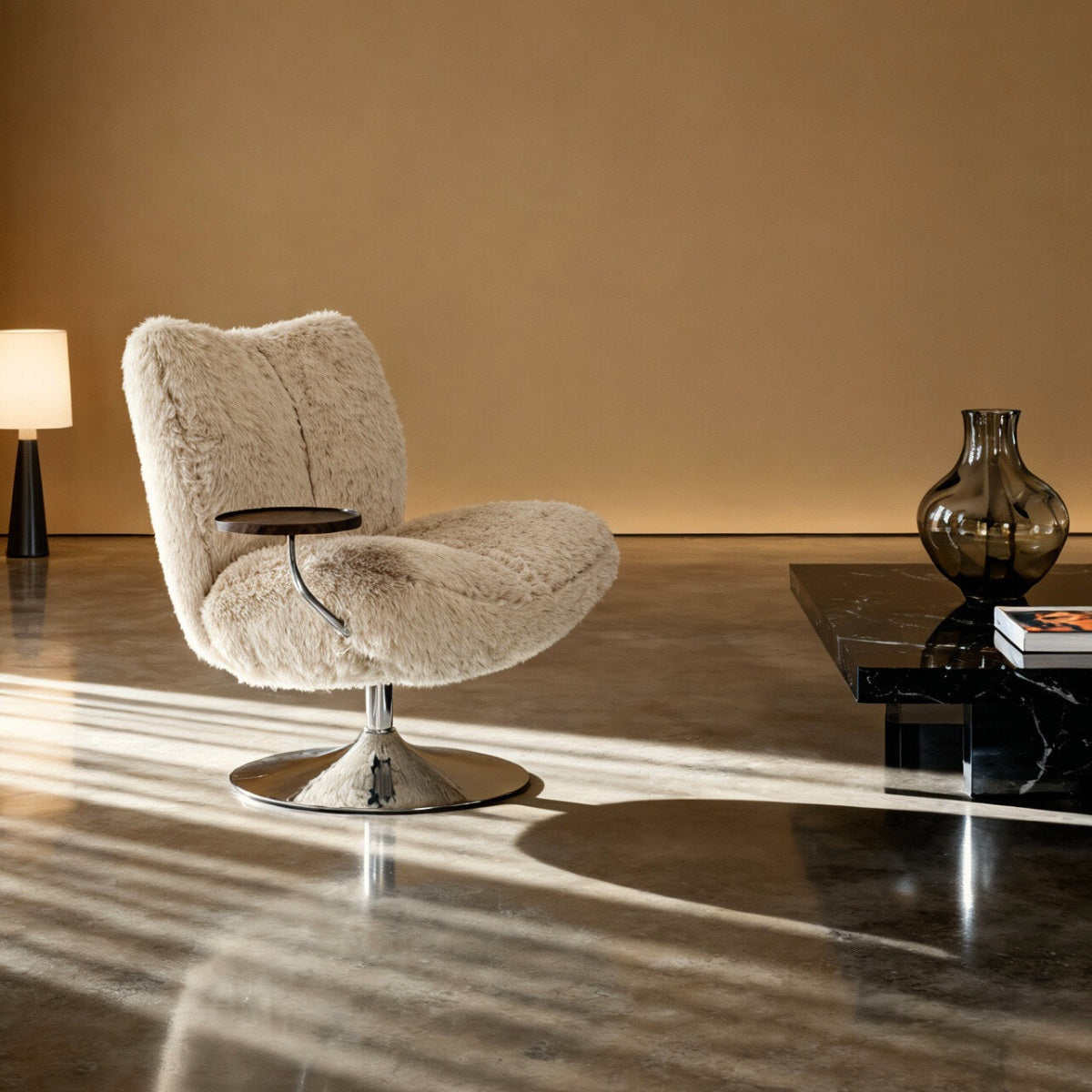 Ontdek de luxe van de DÉJA Draaifauteuil met Tafeltje Morten Fluffy in een stijlvolle taupe kleur. Deze design fauteuil combineert comfort en elegantie met zijn zachte stoffen bekleding en chromen details. De fauteuil is perfect voor moderne interieurs en biedt een comfortabele zitervaring dankzij de hoogwaardige materialen. De taupe kleur voegt een warme en uitnodigende sfeer toe aan elke ruimte. Ideaal voor ontspanning na een lange dag of als stijlvolle toevoeging aan je woonkamer.