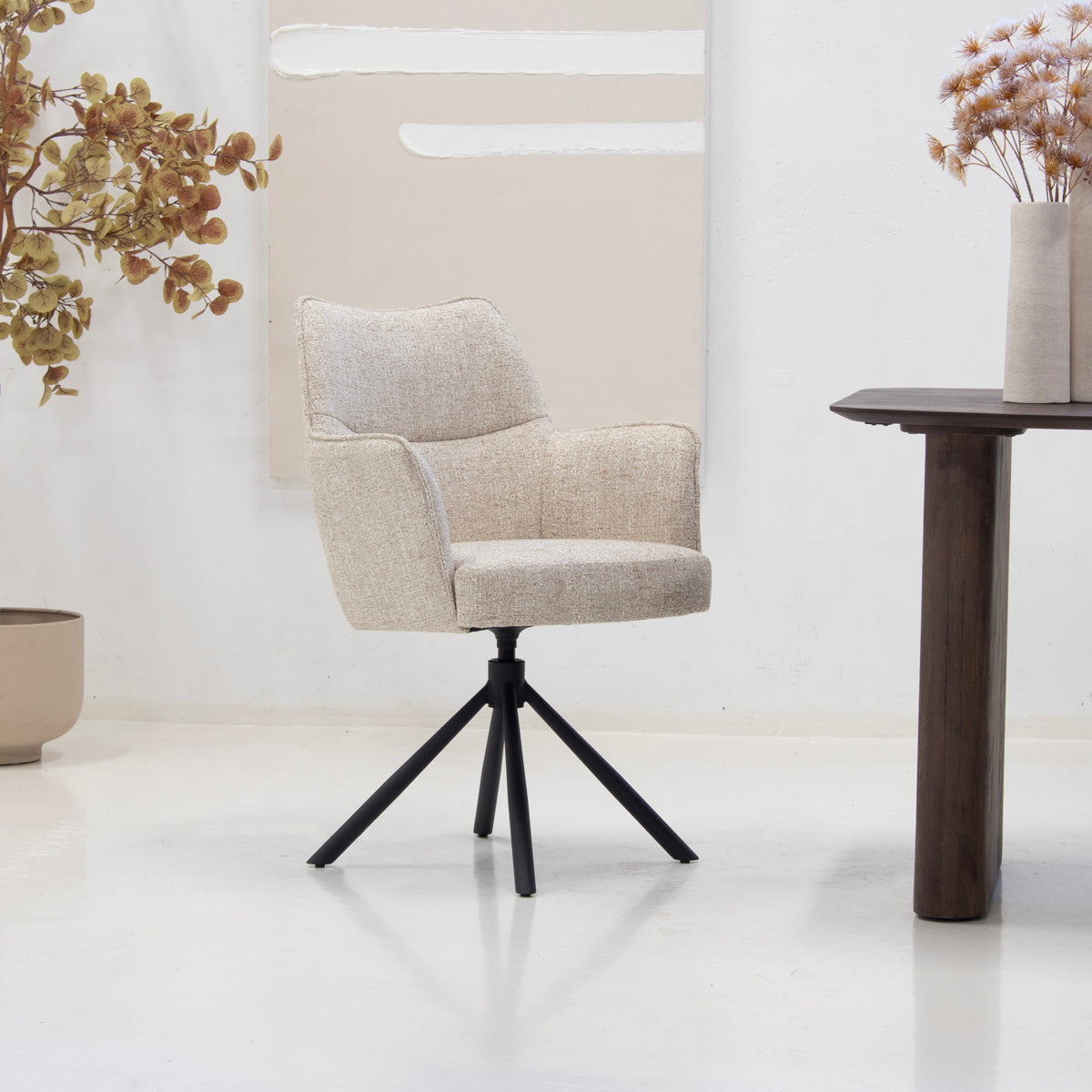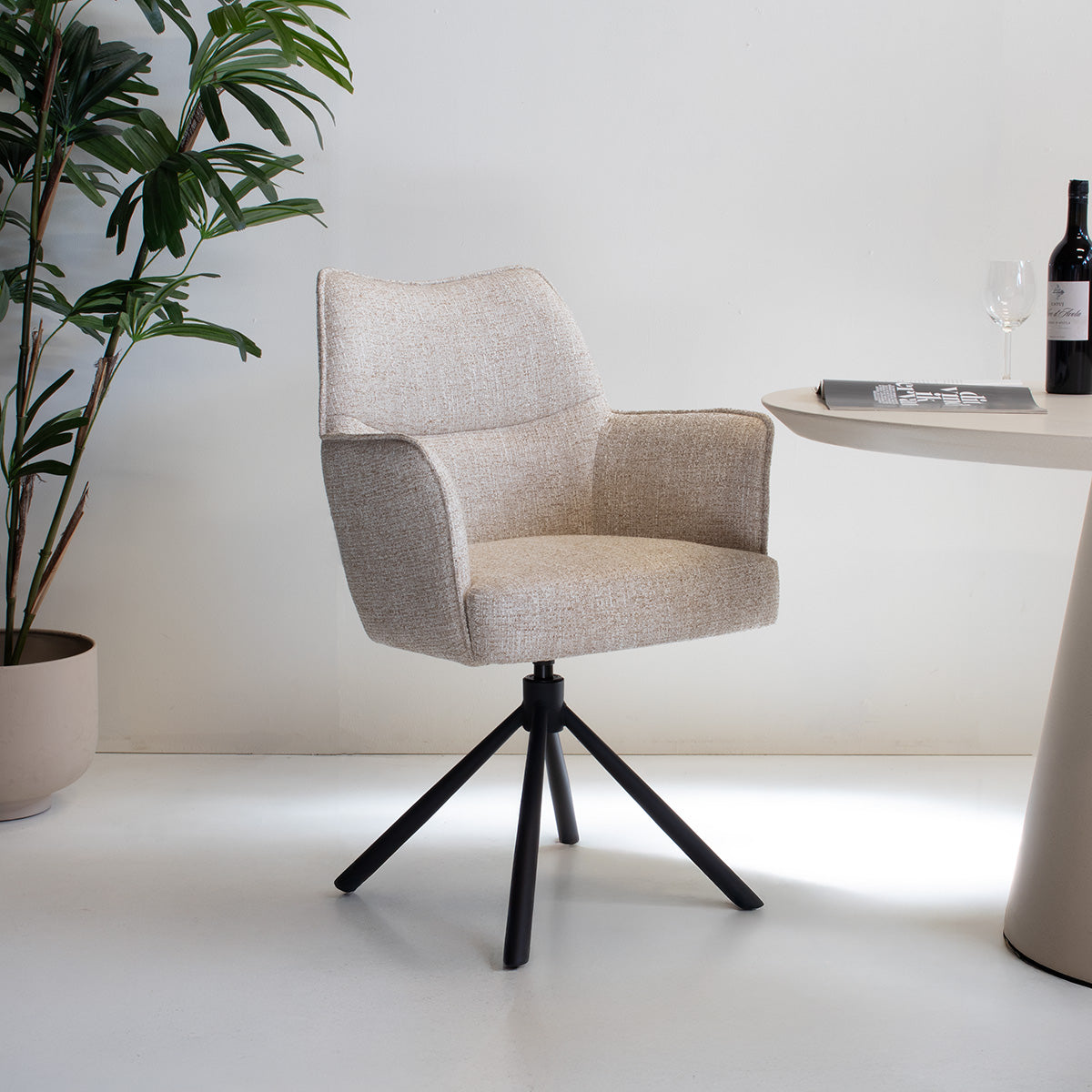 De DÉJA Eetkamerstoel Zayn combineert Scandinavische stijl met modern comfort. Deze elegante eetkamerstoel in een zachte beige kleur is perfect voor elke eetkamer. Het gebruik van hoogwaardige stof en metaal zorgt voor een duurzame en stijlvolle uitstraling. De draaibare functie maakt het gemakkelijk om te bewegen, terwijl de stevige constructie zorgt voor langdurig gebruik. Deze stoel is een perfecte aanvulling op je interieur en biedt zowel comfort als stijl.