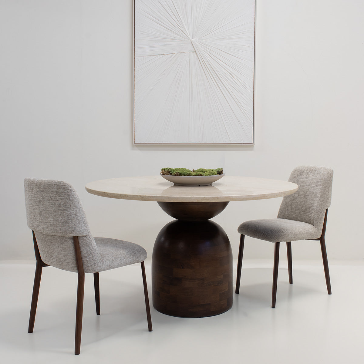 Materiaal: Het tafelblad van de Miro eettafel is gemaakt van marmer, wat zorgt voor een elegante en tijdloze uitstraling. Het onderstel is vervaardigd uit mangohout, een duurzaam materiaal dat bekend staat om zijn stevigheid en warme uitstraling. Deze combinatie van materialen maakt de tafel zowel stijlvol als functioneel.