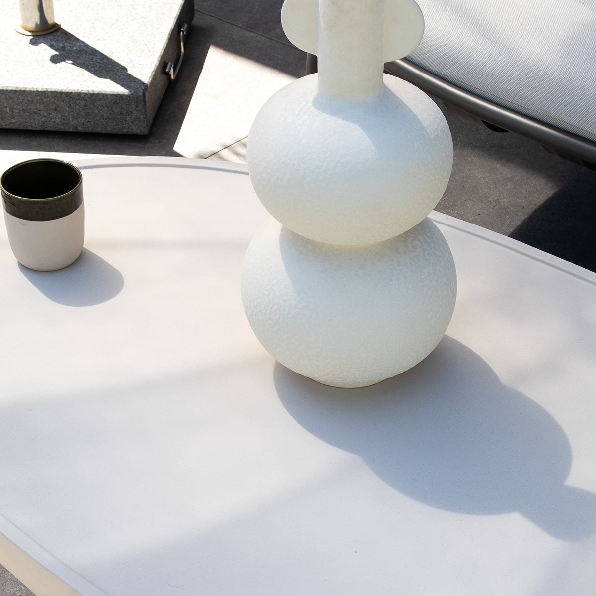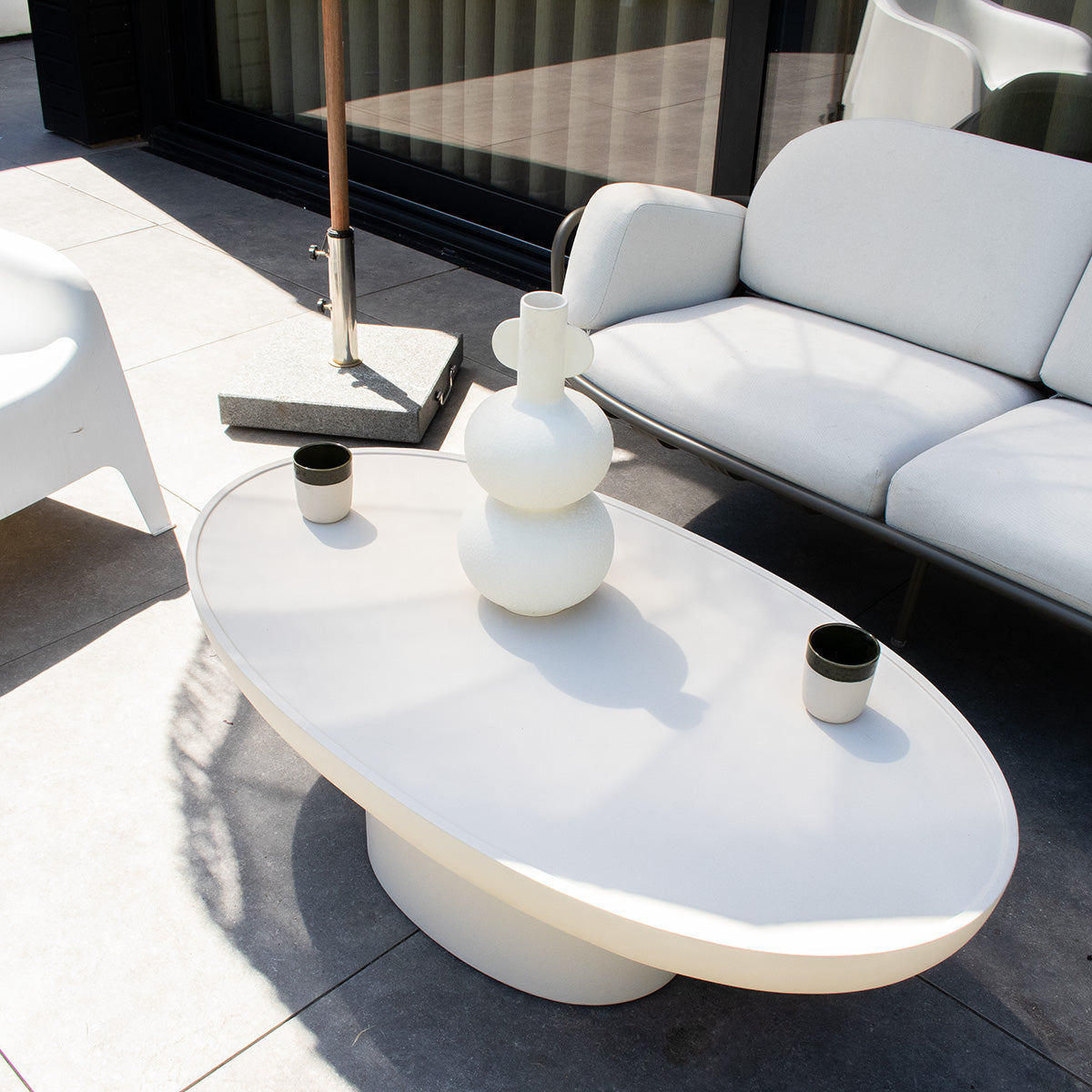 De DÉJA Loungetafel Livinia is een moderne eyecatcher die perfect past in een eigentijds interieur. Met zijn elegante beige kleur en stijlvolle betonlook afwerking straalt deze tafel verfijning uit. Gemaakt van duurzaam eco composiet, biedt de tafel niet alleen een prachtige uitstraling, maar ook een robuuste kwaliteit die geschikt is voor dagelijks gebruik. De ovale vorm maakt het een veelzijdig meubelstuk dat zowel in de woonkamer als op een overdekt terras tot zijn recht komt.
