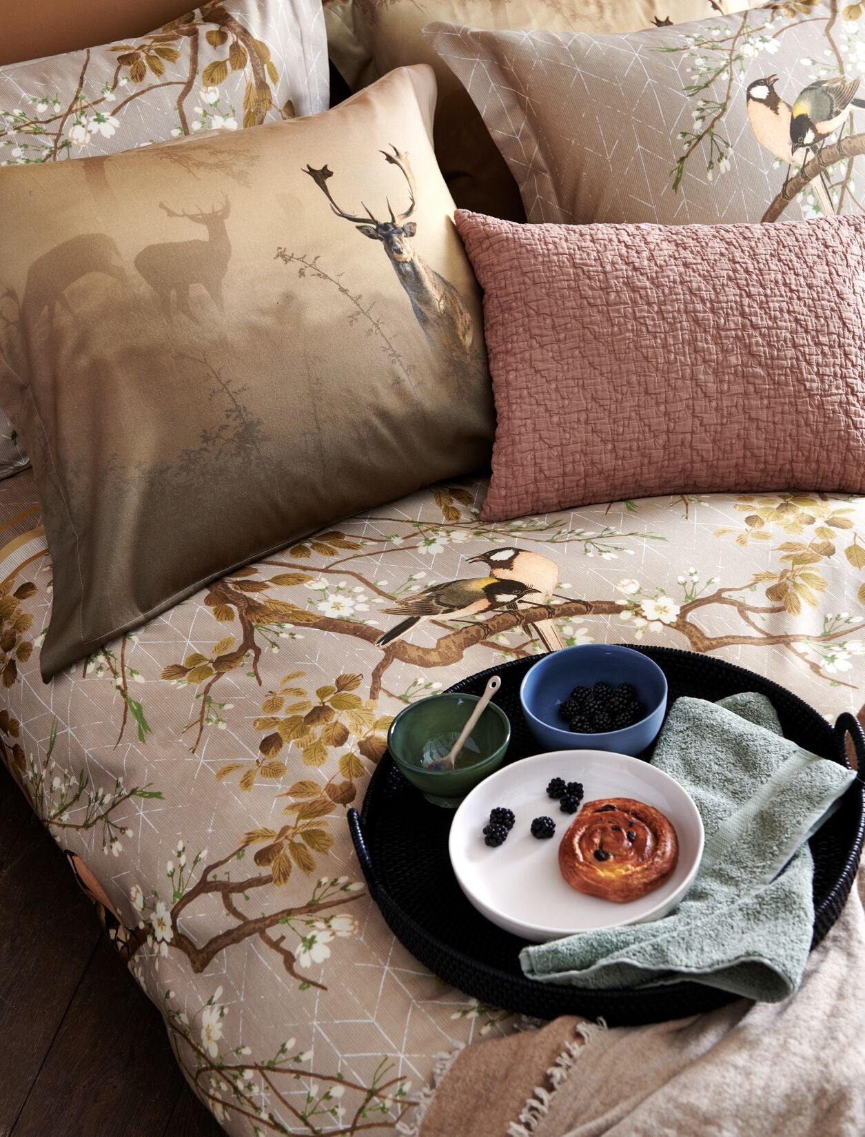 Zachte kleuren met een romantische print van vogels op takken. In dit overtrek komen de kleuren van het najaar subtiel terug. Handig te combineren met vele bruintinten. Maat 200 x 200/220 cm (2-persoons overtrek met 2 kussenslopen) Kleur Natural-086 Kwaliteit 100% satijnkatoen Kussensloop voorzien van Oxford rand Print Bovenzijde: Print Sunkissed Onderzijde: Uni gekleurd Instopstrook Ja (ruime flessenhals) Wasvoorschriften Machinewasbaar op 40 graden (donkere kleuren) of 60 graden (lichte kleuren) Drogen op lage temperatuur Heet strijken