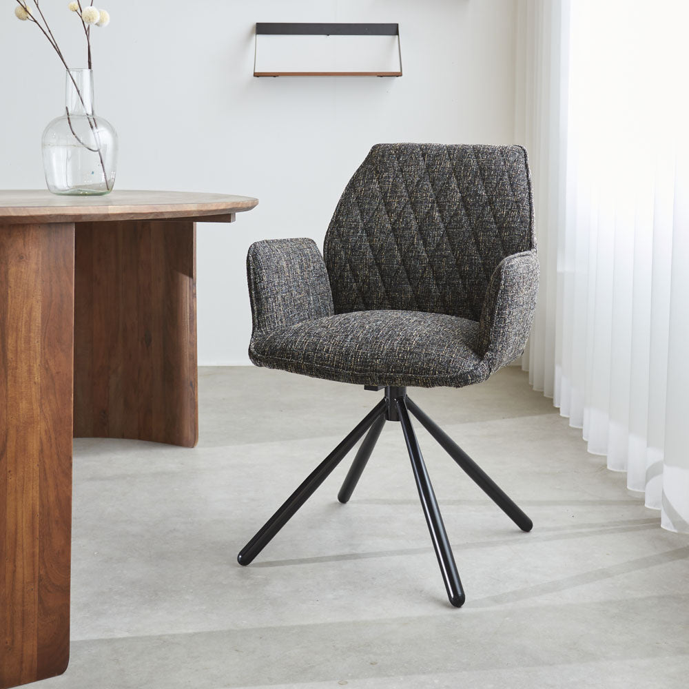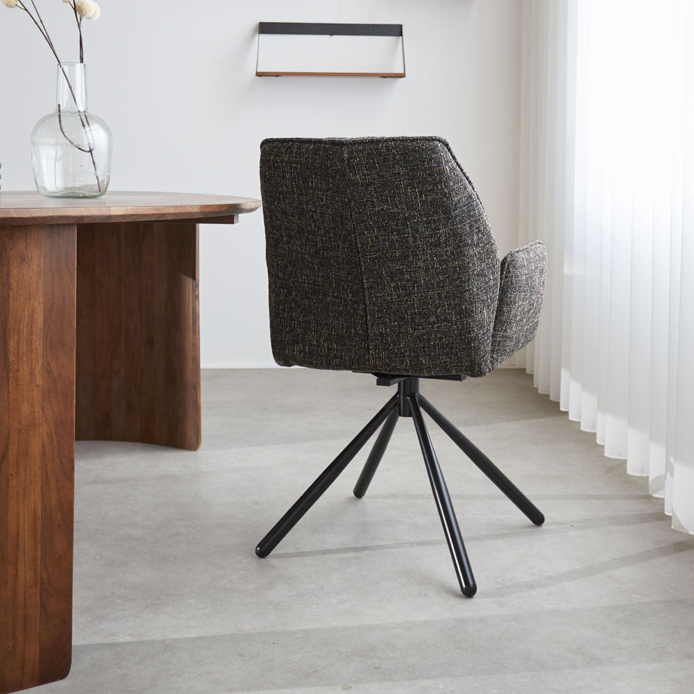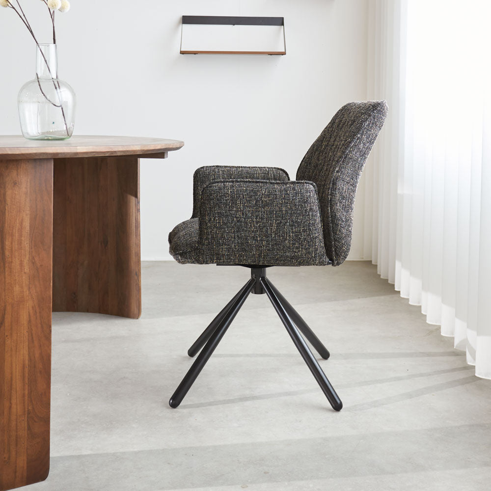 De eetkamerstoel Novan is een van onze meest comfortabele stoelen! De stoere stoel is erg stijlvol en heeft een hoog zitcomfort door de vorm van de zitting met armleuning. De comfortabelste bijkomstigheid van de Novan is dat de stoel 180 graden draaibaar is en altijd in de oorspronkelijke stand zal terugdraaien. Uren lang tafelen is met deze draaibare eetkamerstoel dus helemaal geen probleem. Je zal zelfs willen blijven zitten!