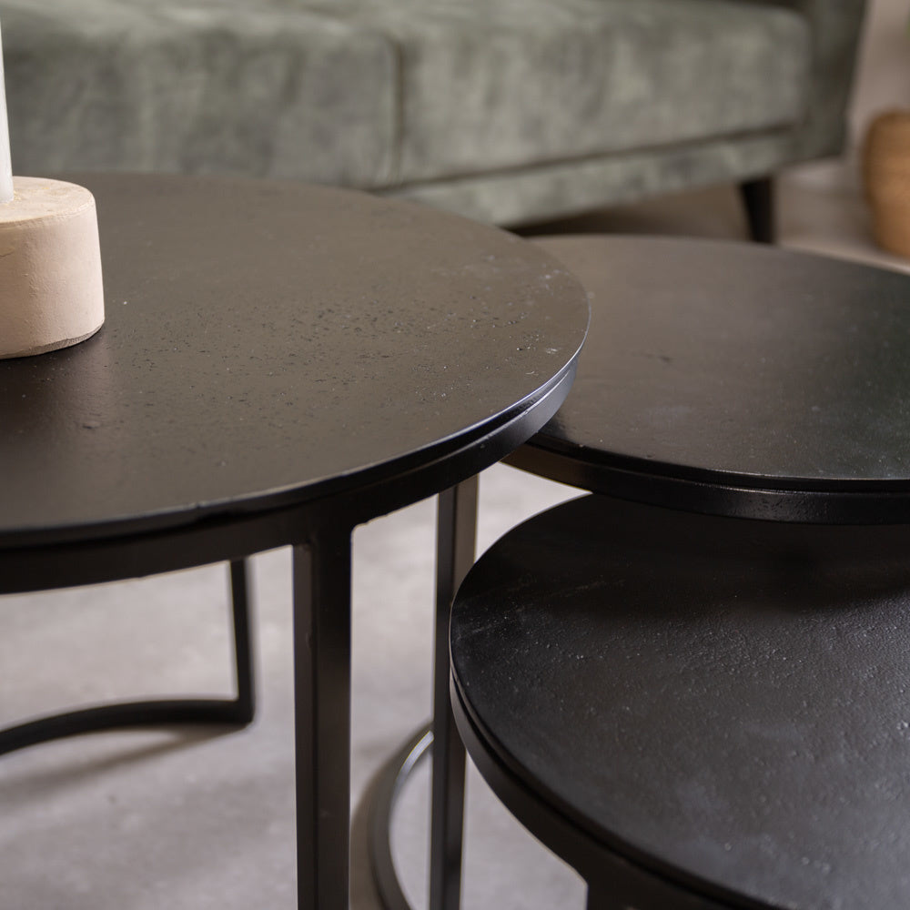Materiaal blad Het blad van de salontafel set Alice is gemaakt van aluminium wat zwart is afgewerkt. Dit zorgt voor een stoere uitstraling. Het blad is niet helemaal egaal. Dit zorgt voor een stijlvolle vintage look. Aluminium oogt stijlvol en is licht in gewicht waardoor de set gemakkelijk te verplaatsen is. Bovendien roest aluminium niet waardoor het materiaal zeer gebruiksvriendelijk is. Daarnaast is aluminium ook duurzaam vanwege de lange levensduur.